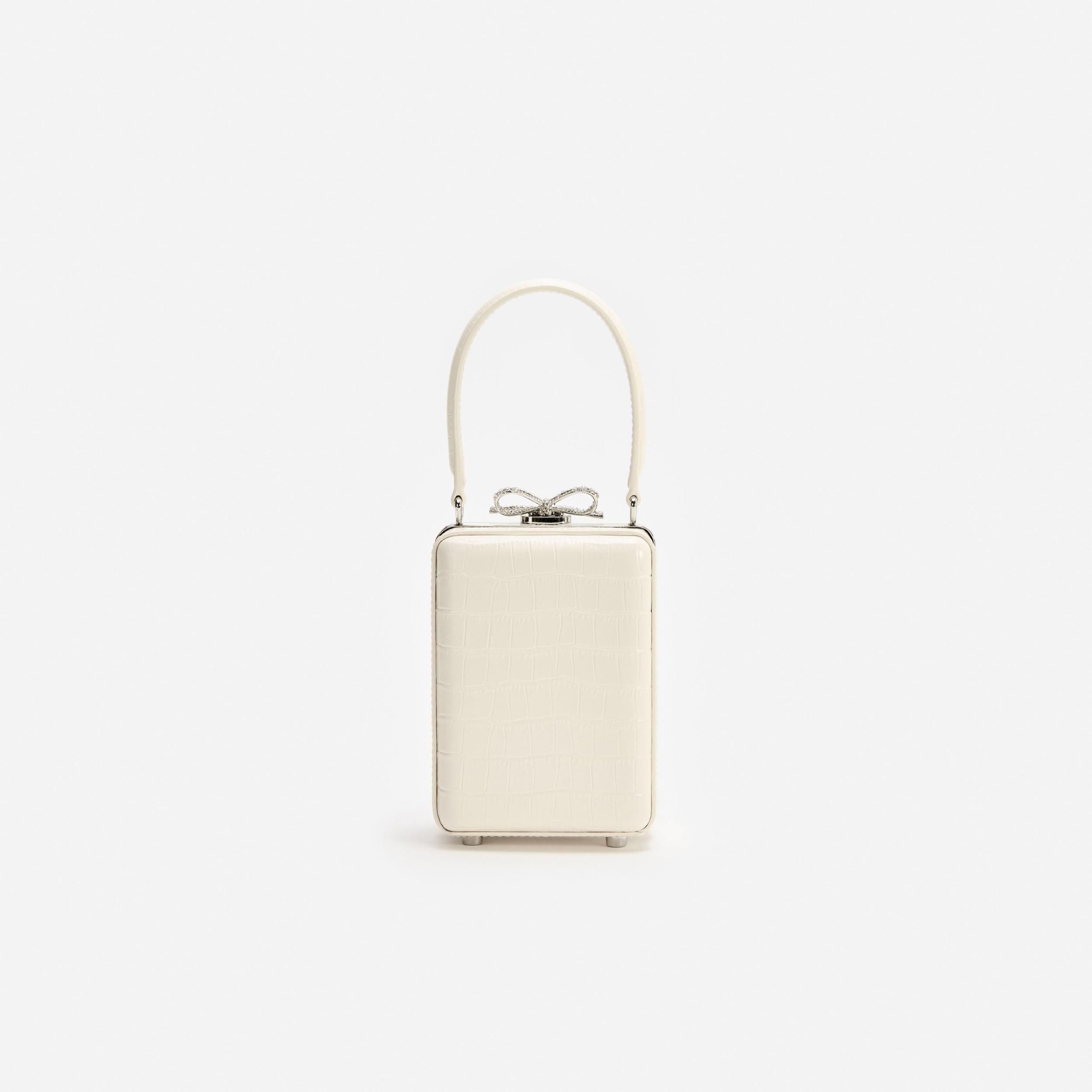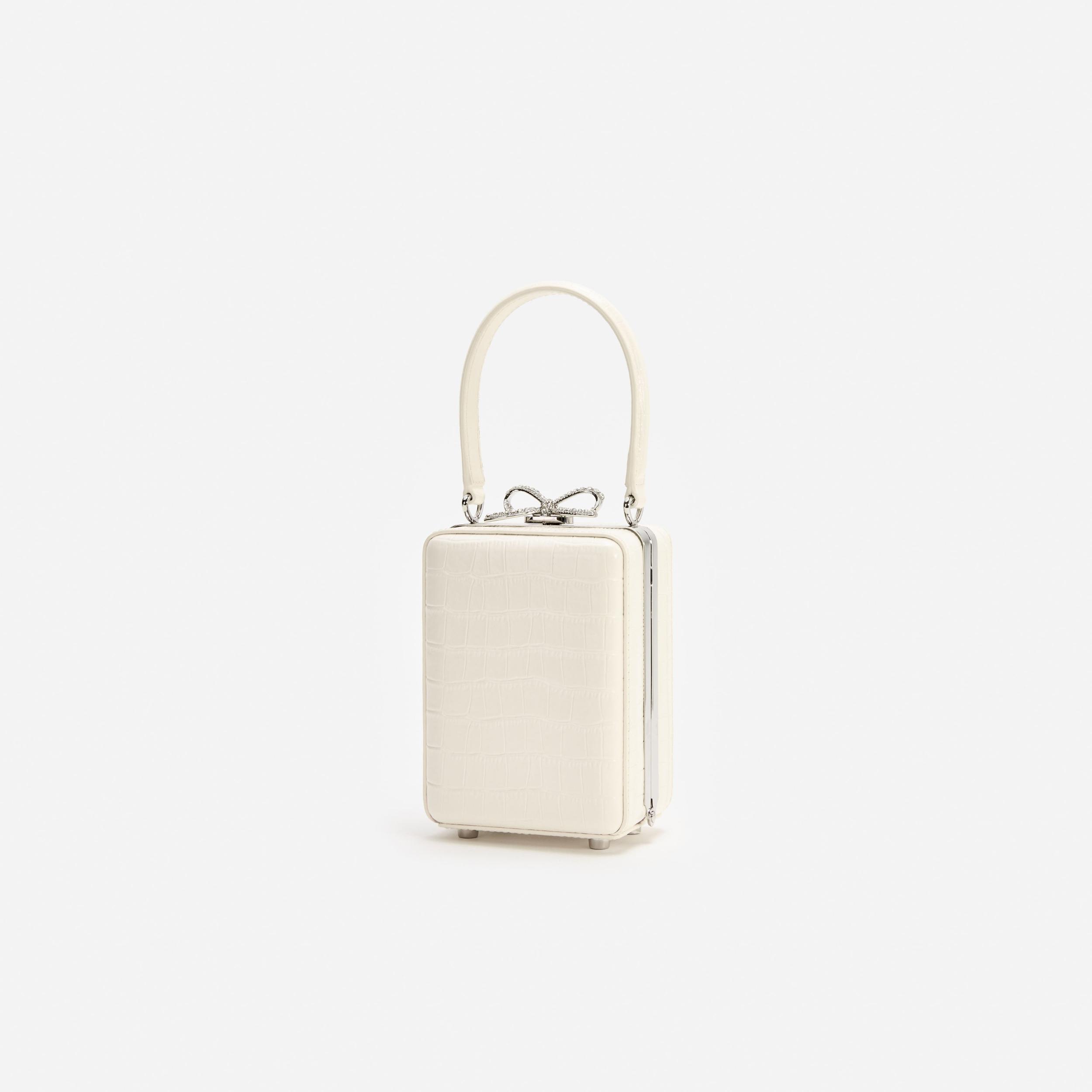 Elegant and timeless, this cream mock croc leather micro bag adds a chic finish to every ensemble. Topped with a shining crystal bow, tote it around at cocktail parties and black tie affairs alike.Cream leather exteriorClasp fasteningSilver crystal bow motifTop handleRemovable shoulder chain