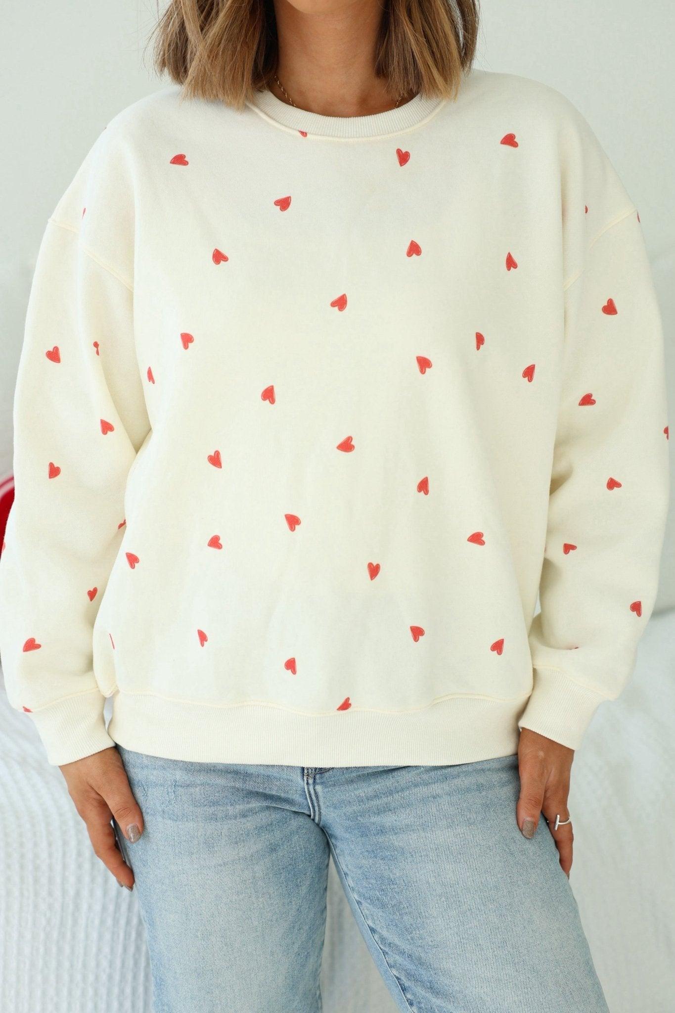 This cream sweatshirt features an allover heart-shaped print for a playful and cozy look. Designed with a classic round neckline and ribbed detailing at the neckline, cuffs, and hem, it offers a relaxed fit for everyday comfort. Made from soft sweatshirt material.