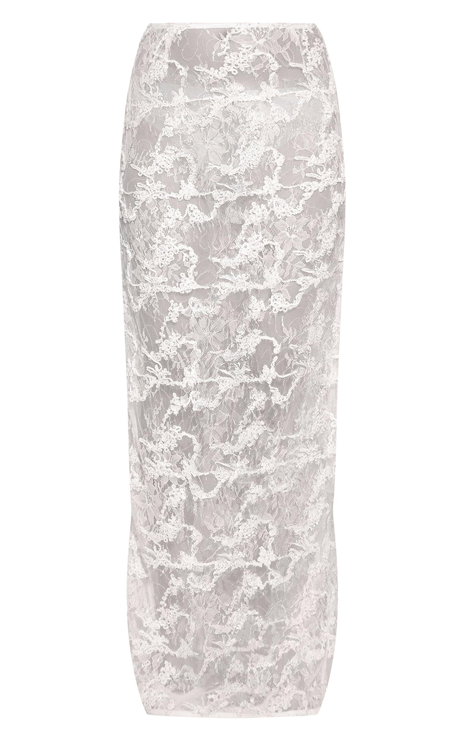 Channel confident transparency this evening with the cream lace sequin sheer maxi skirt, an artful piece designed to command attention. Its intricate cream lace takes center stage, detailed with subtle sequins that offer a refined shimmer as you move, while the maxi-length silhouette ensures an undeniably elegant flow. The sheer finish provides an intriguing backdrop, perfect for showcasing a sleek bralet or an oversized tee for an unexpected, modern contrast. Complete your look with chic ballet flats and delicate gold earrings for an aesthetic that’s both self-aware and effortlessly polished.Length approx 108cm/42.5inch (Based on sample size US 4)Model wears size UK 8/ EU 36/ AUS 8/ US 4Model Height - 5ft 6inchp]:!mb-4inch>Brand: PrettyLittleThingCategory: BottomsProduct type: Maxi SkirtColor: CreamMaterial: Woven LaceOccasion: Evening