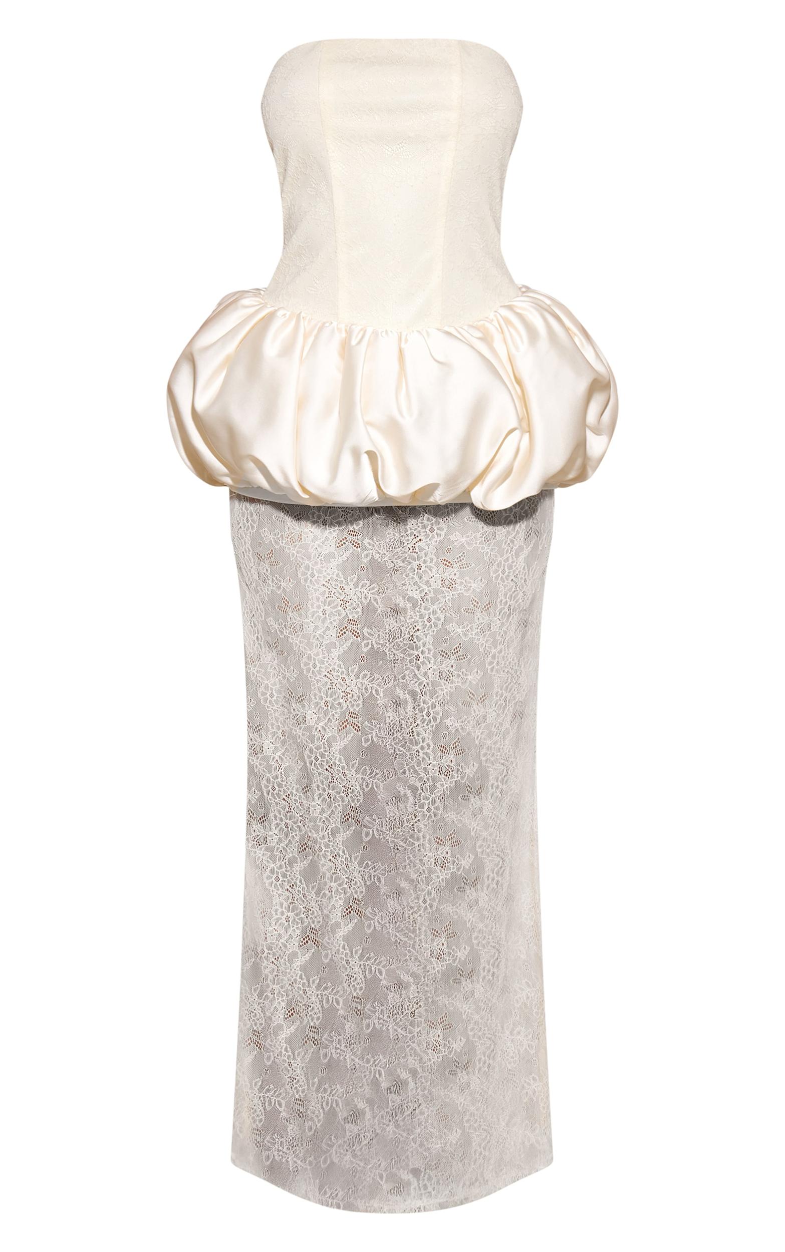 Unleash a captivating presence. The cream puff ball lace detail maxi dress redefines occasionwear with its artful design, featuring a confident strapless neckline that gives way to a meticulously structured bodice. This is dramatically balanced by a voluminous puffball peplum that cinches the waist, creating a distinctive flair before flowing into a body-skimming maxi skirt intricately overlaid with delicate lace. For a knowing ensemble, complete the look with sleek nude heels, adding a pair of refined pearl earrings to ensure every detail exudes polished confidence. This piece is crafted for moments where an impactful aesthetic is non-negotiable.Length approx 145cm/57inch (Based on sample size US 4)Model wears size UK 8/ EU 36/ AUS 8/ US 4Model Height - 5ft 6inchp]:!mb-4inch>Brand: PrettyLittleThingCategory: DressesProduct type: Bodycon DressColor: CreamMaterial: SatinOccasion: Occasion