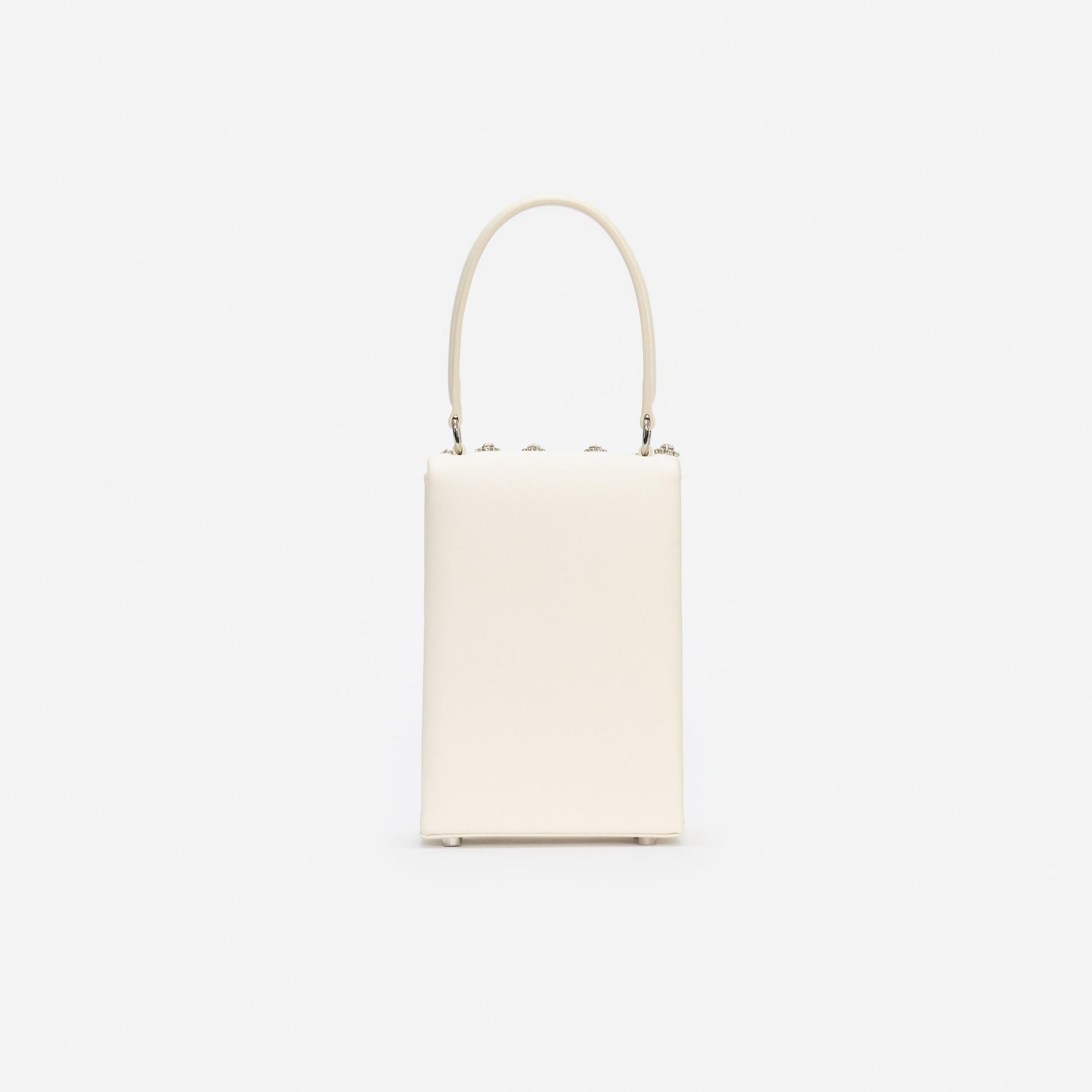 Romance shines through this cream satin mini bag, which boasts light-catching crystal embroidery and our signature bow. Pair with our statement earrings for the ultimate finishing touch.Rhinestone satin exteriorTop flap closureRemovable shoulder chainInternal card holder