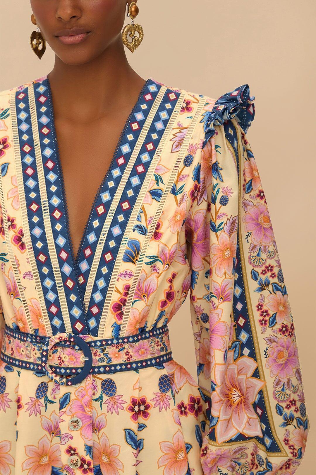 Embrace the lush charm of the Cream Superbloom Tapestry Organic Cotton Romper, a delightful blend of vibrant blooms and exquisite design. Crafted from responsible materials, the romper's lively floral tapestry pattern captures the essence of nature's beauty. Its relaxed silhouette features a graceful V neckline that adds a touch of elegance, while gentle ruffles bring a playful twist. Perfect for sunlit adventures, this piece celebrates the harmony of style and comfort.Composition 100% COTTONCare Instructions MACHINE WASH, GENTLE CYCLE, DO NOT BLEACH, DO NOT TUMBLE DRY, LINE DRYING, IRON AT LOW HEAT, DRY CLEAN WITH ANY SOLVENT EXCEPT TRICHOLORETHYLENESize and Fit Inches XXS XS S M L XL Bust 33 3/4 35 3/4 37 3/4 39 3/4 43 46 Waist 25 2/4 27 2/4 29 2/4 31 2/4 34 3/4 37 3/4 Length 30 3/4 31 1/4 32 32 2/4 33 33 3/4 Hip 41 1/4 43 1/4 45 1/4 47 1/4 53 2/4 53 2/4