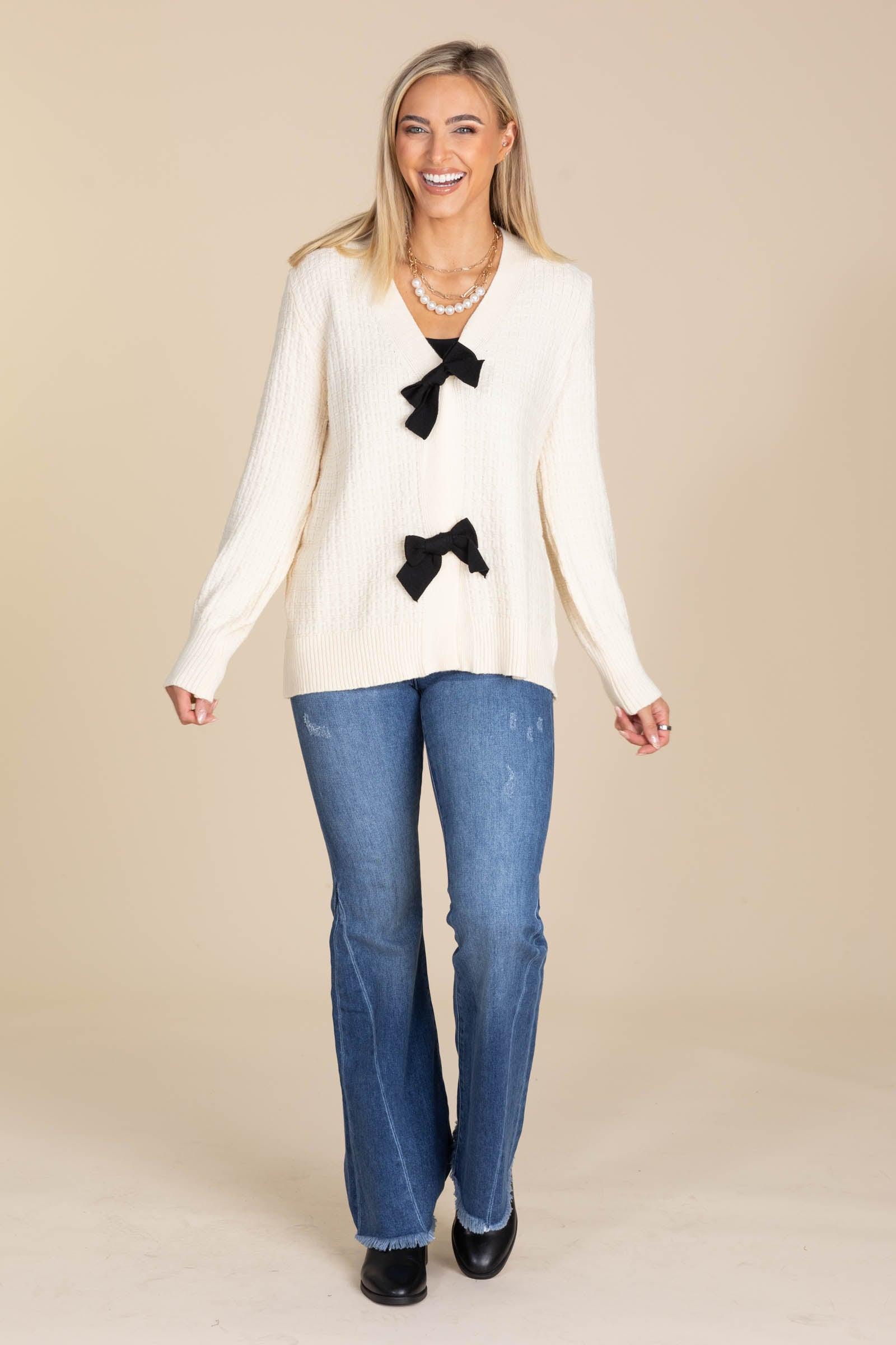 Product Details Colors: Cream, Black Print: Textured Solid With Black Bows Neckline: Button Down Sleeve: Long Sleeve Hemline: Straight Brand: Like Love Material and Care 51% Viscose 27% Polyester 22% Nylon Hand Wash Cold Hang/ Line Dry Size and Fit Small: Bust 42" Waist 40" Length 24" Medium: Bust 44" Waist 42" Length 24.5" Large: Bust 46" Waist 44" Length 25" 1X Large: Bust 48" Waist 46" Length 25.5" 2X Large: Bust 50" Waist 48" Length 26" 3X Large: Bust 52" Waist 50" Length 26.5" Sarah is 5’8” and wearing her true size small Erica is 5’7” and wearing her true size small
