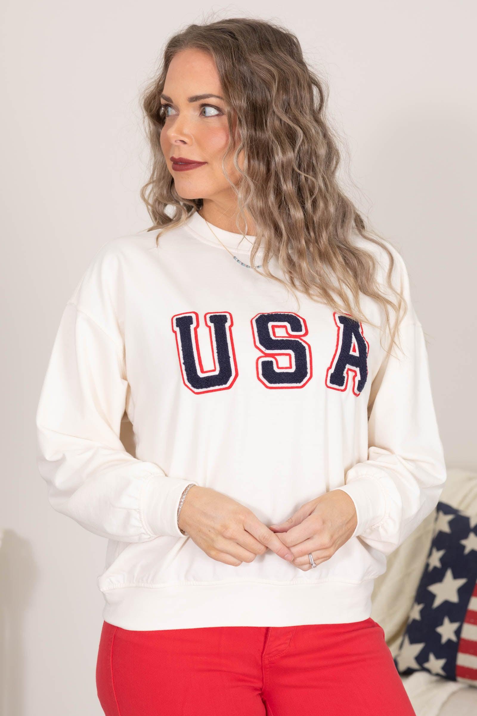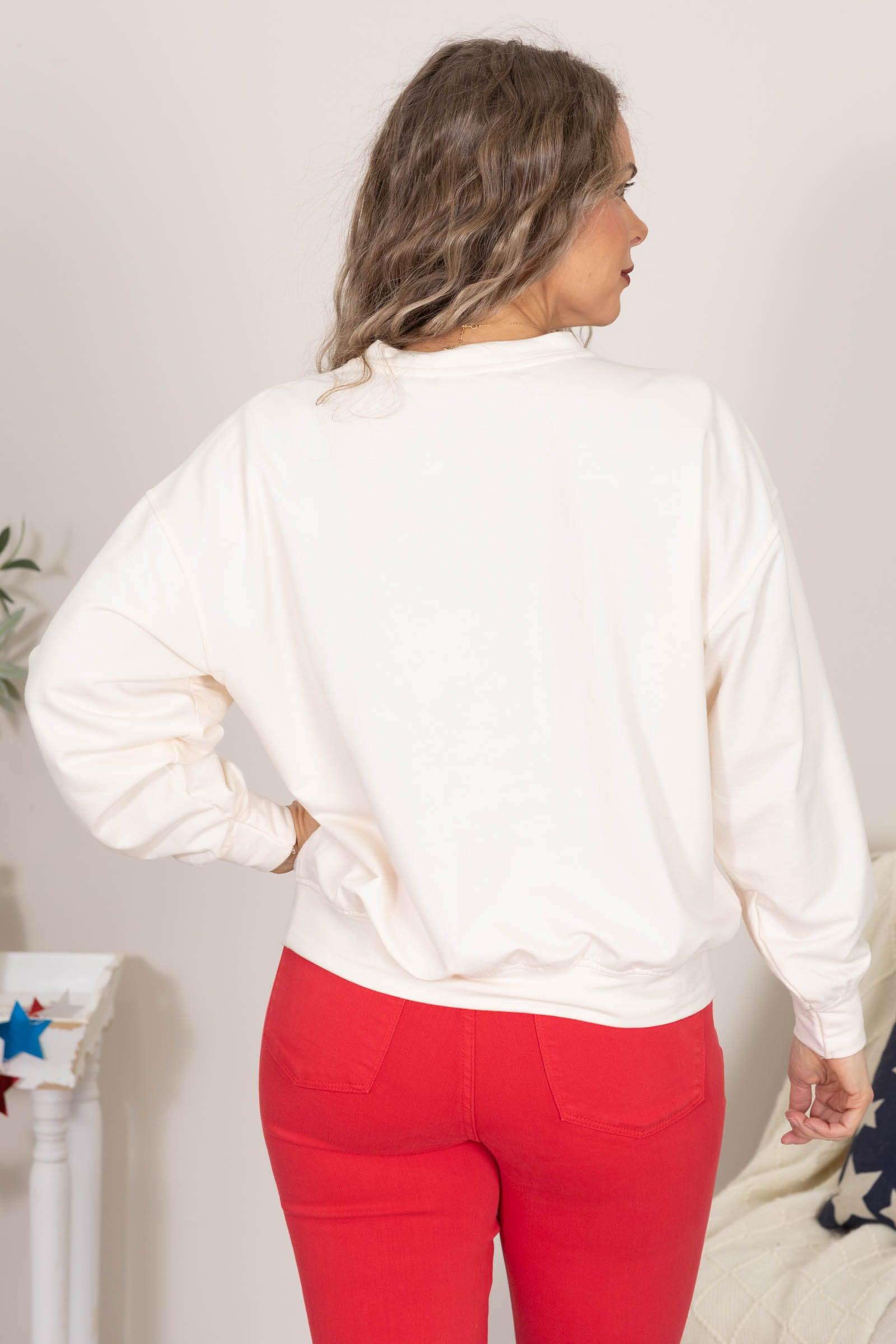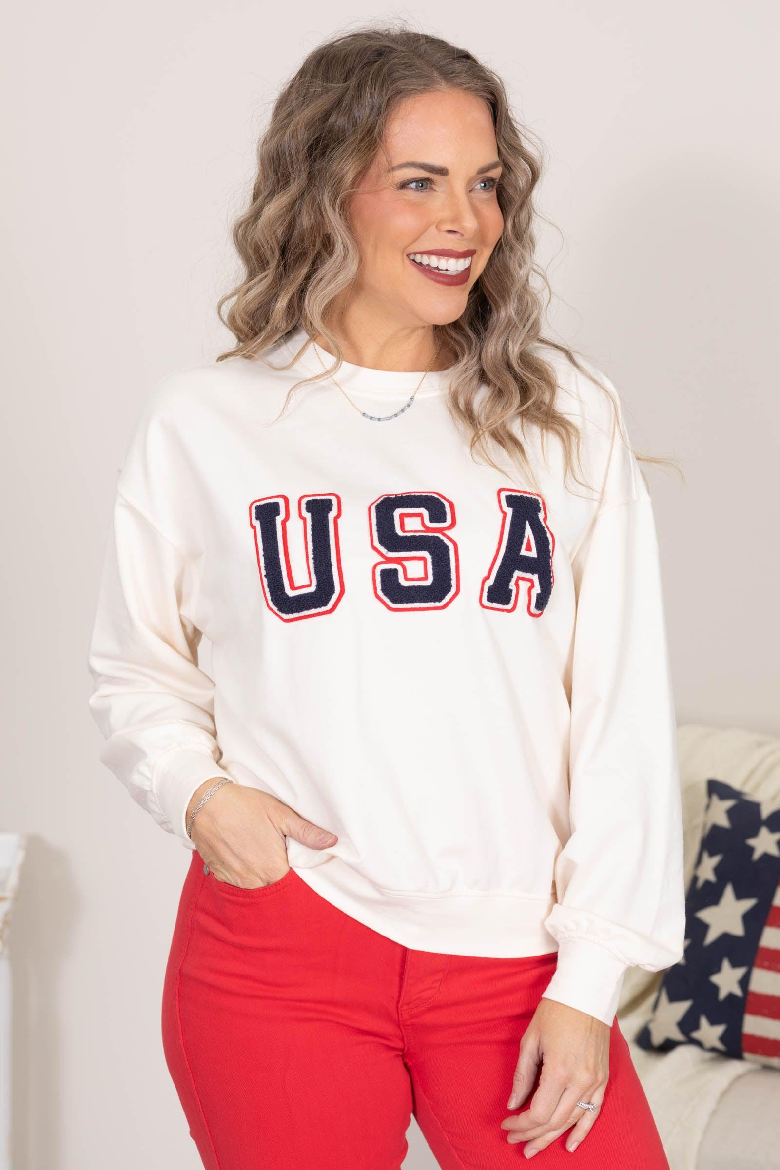 Product Details Colors: Cream, Navy, Red, White Print: Americana Neckline: Round Sleeve: Long Sleeve Hemline: Straight Brand: J.O.A. Material and Care 60% Cotton 40% Polyester Hand Wash Cold Hang/Line Dry Size and Fit Small: Bust 46" Waist 44" Length 23.5" Medium: Bust 48" Waist 46" Length 24" Large: Bust 50" Waist 48" Length 24.5" Erica is 5'7 and wearing a size small