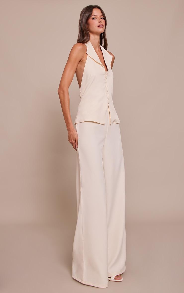 Navigate any event with an innate sense of style, courtesy of a design that redefines modern dressing. The cream waist coat straight leg jumpsuit brings a confident edge to occasion dressing with its distinctive vest upper, featuring a refined V-neckline and polished button fastening down the front, seamlessly merging with a sleek halter-neck design. This striking silhouette flows effortlessly into a sophisticated straight-leg pant, creating an elongated and balanced line perfect for evening wear. For an effortlessly put-together look, complete this cream ensemble with elegant black kitten heels and a pair of delicate drop earrings, ensuring you own the room with understated confidence.Length approx 155cm/61inch (Based on sample size US 4)Model wears size UK 8/ EU 36/ AUS 8/ US 4Model Height - 5ft 7inchp]:!mb-4inch>Category: DressesProduct type: Wide Leg JumpsuitColor: CreamMaterial: Tailored WovenOccasion: Evening