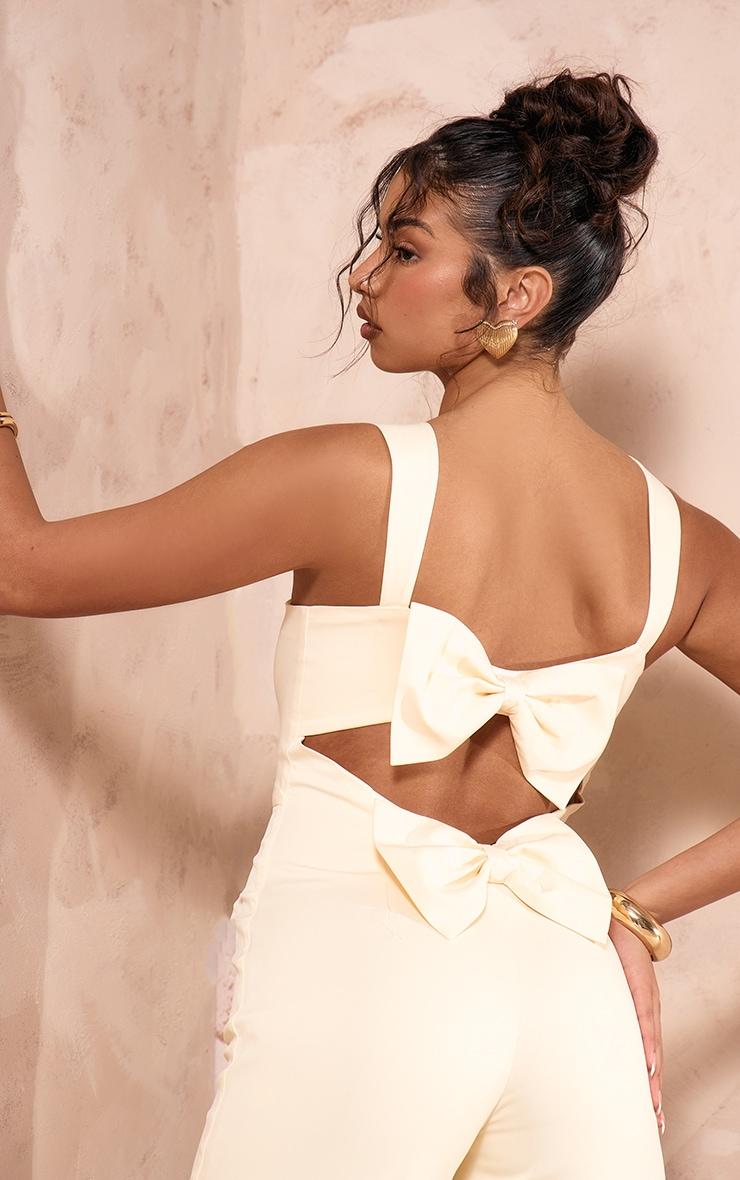Enter the weekend in style with this cream woven cut out bow detail jumpsuit. Brought to you in a cream hue woven material with a cut out design and bow detailing for that extra touch of glam, how can you not fall in love? Seriously chic and in a figure-flattering fit, you are guaranteed to steal all the stares in this cream jumpsuit. Just add court heels and simple gold accessories for the perfect finishing touch. Length approx 160cm/63inch (Based on a sample size UK 8) Model wears size UK 8/ EU 36/ AUS 8/ US 4 Model Height - 5ft 8inch Model Height - 5ft 8inchp]:!mb-0inch>Category: Jumpsuits & PlaysuitsProduct type: JumpsuitColor: CreamMaterial: Woven CrepeDesign: PlainNeckline: ScoopSleeves: SleevelessOccasion: Occasion