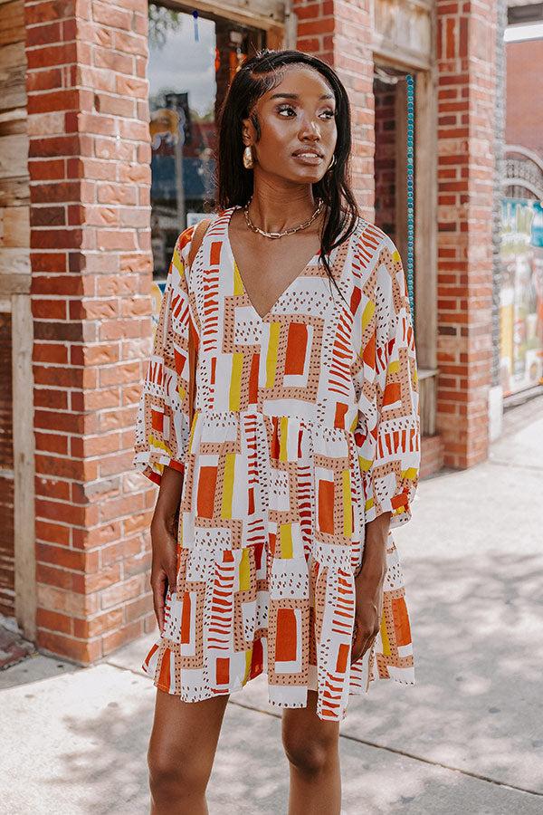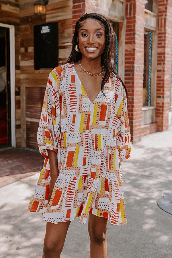 - Let your unique fashion sense shine through in this fabulous shift dress! - Lightweight material with a yellow, orange, and brown hued abstract print and a built-in lining - A v-cut neckline with back button closure and a keyhole detail - 3/4 length sleeves - A flowy yet flattering silhouette that ends in a straight mid-thigh length hemline Measurements S : Bust 40", Hip 42", Length 33.5", Sleeve Length 19.5", Waist 36". M : Bust 42", Hip 44", Length 34", Sleeve Length 20", Waist 38". L : Bust 44", Hip 46", Length 34.5", Sleeve Length 20.5", Waist 40".