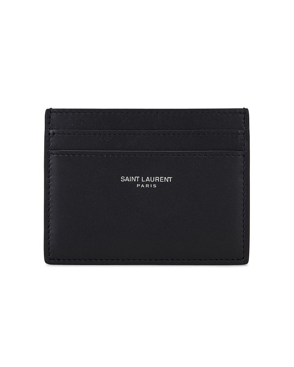 caseLeather card holder / One central compartment and two card slots on each side / Silver-tone Saint Laurent logo at front / Measures approx 4" W x 3" H / This item is not available to ship to Indonesia / Made in Italy / Our Style No. SLAU-MY245 / Manufacturer Style No. 375946-0U90E-4100 /