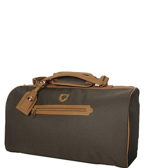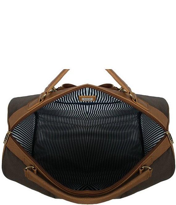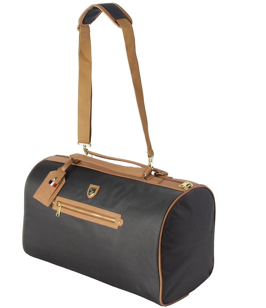 From the Provence collection by Cremieux, the Satchel Duffel Bag features: Material: Dobby Weave Premium hardware Luxurious stripe interior lining Comfort carry handle Adjustable shoulder-strap Front and rear smart phone EZ access pockets Drop-bottom EZ compartment Interior pockets Rear fabric strap fits around the extension handle of a spinner suitcase for secure stacking and hands-free mobility. Approx. 21" x 8.5" x 11.5" Weight approx. 2.6 lbs. Imported.