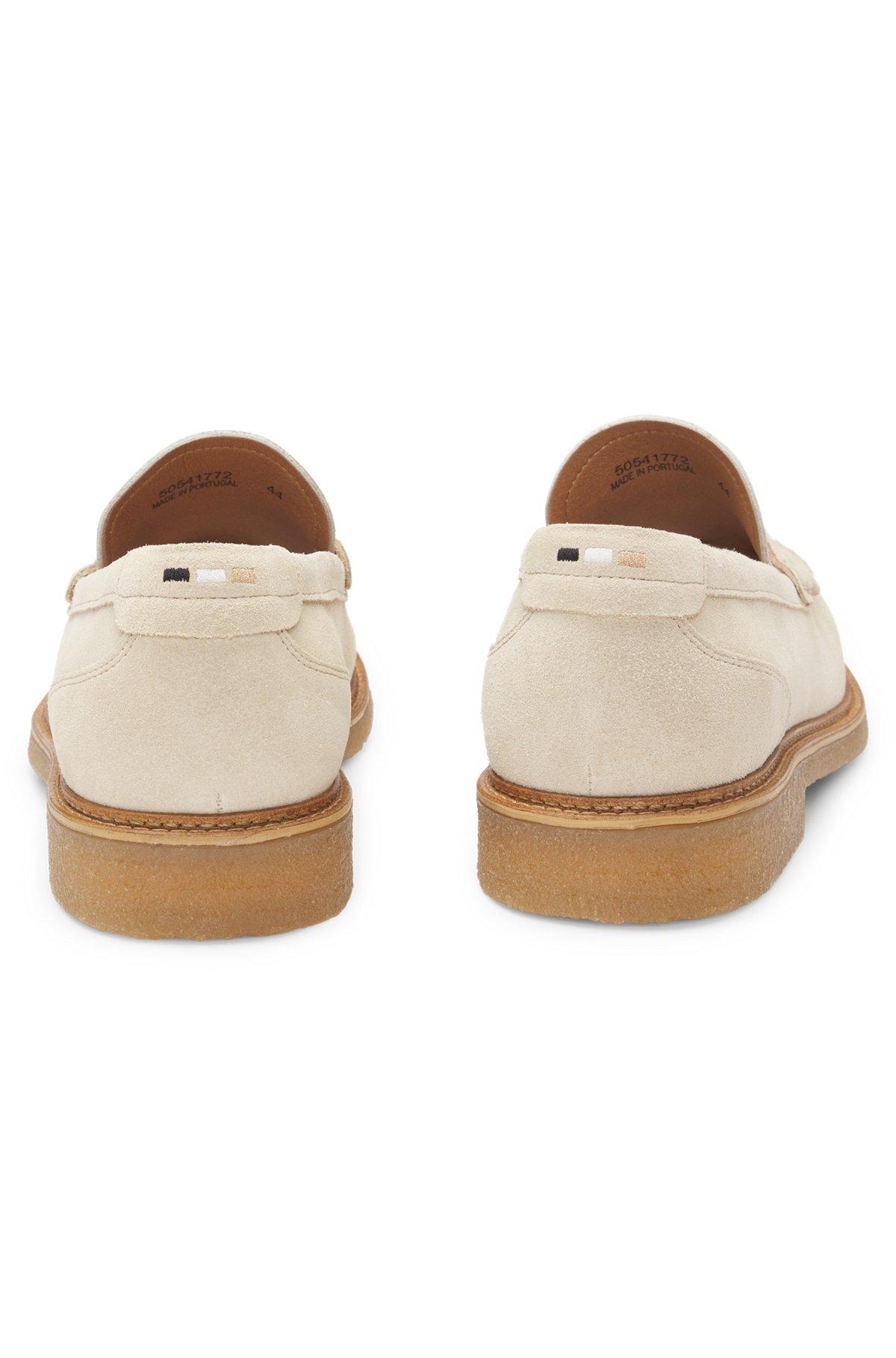 With a durable crepe outsole, these BOSS Menswear moccasins make a refined casual statement. Penny trim on rich suede uppers.