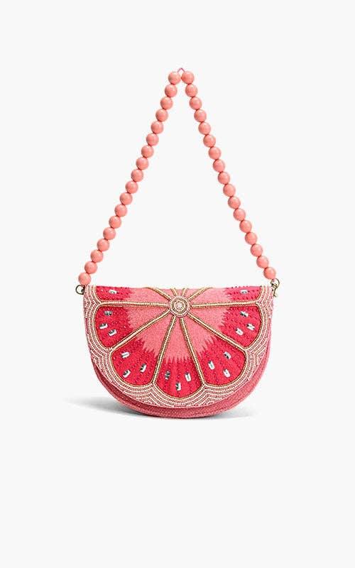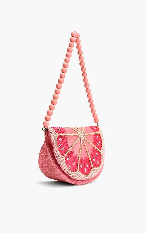 - Bag shaped like a half moon with a playful pink hue - Beaded handle adorned with pearls for a touch of whimsy - Adorned with an embellished flap on the front - Magically closes with a foldover design and magnet - Lined inside with a pocket perfect for treasures - Measures 9.5 x 6 x 3.5" for a compact and cute appeal