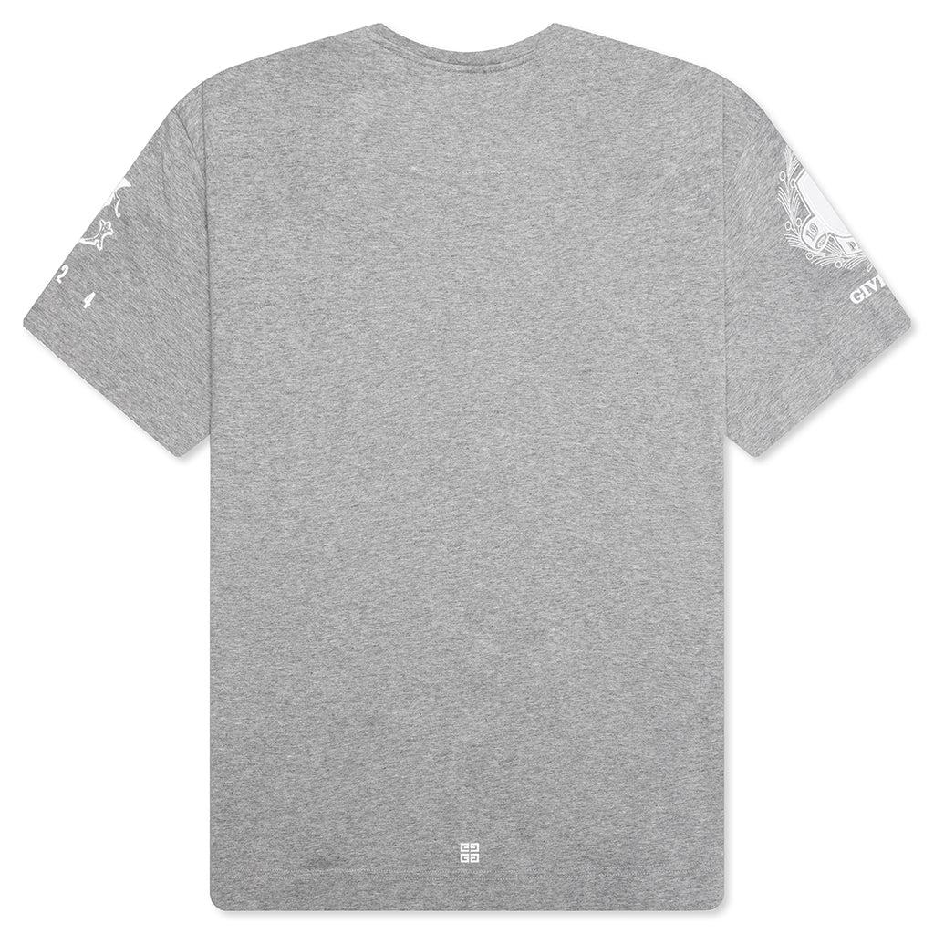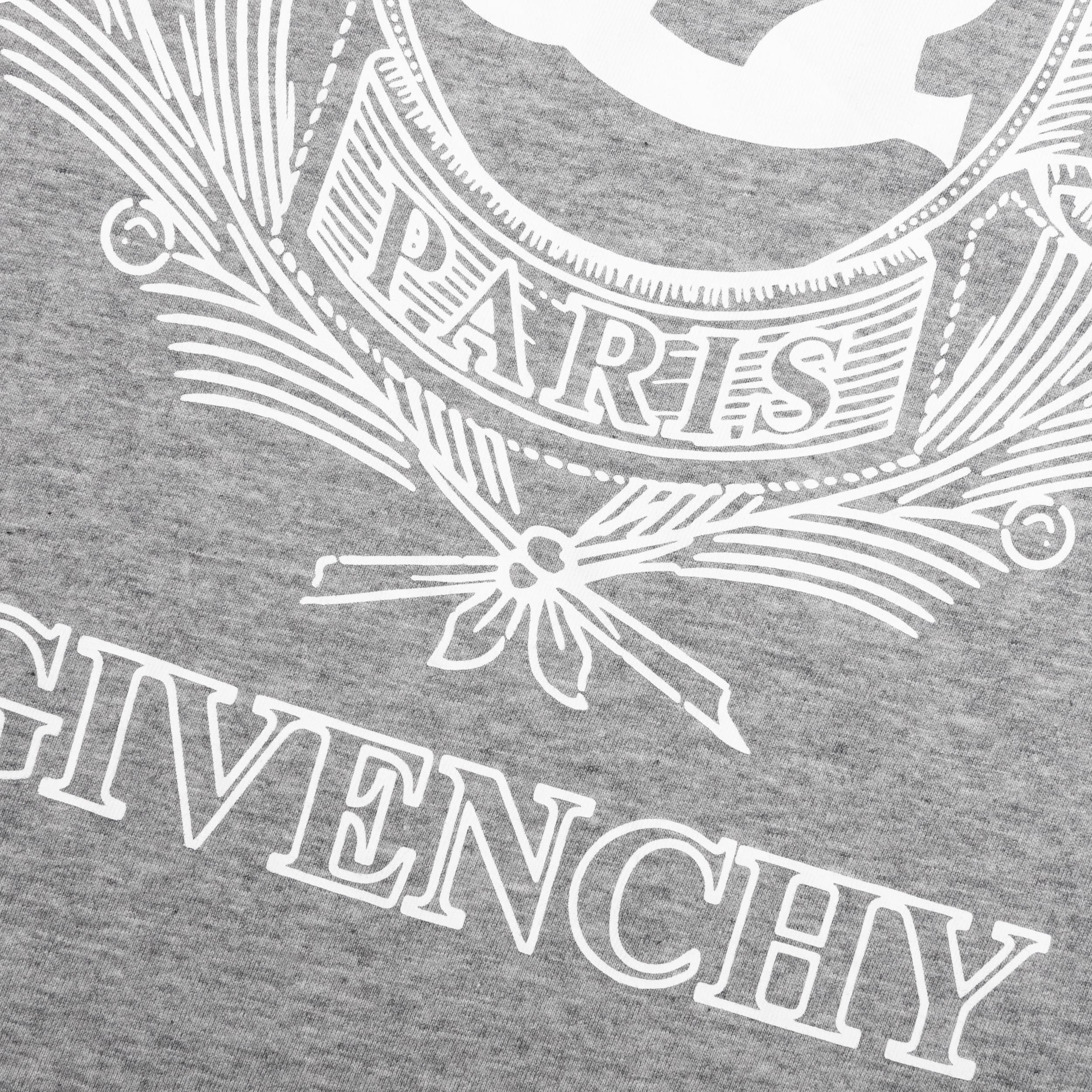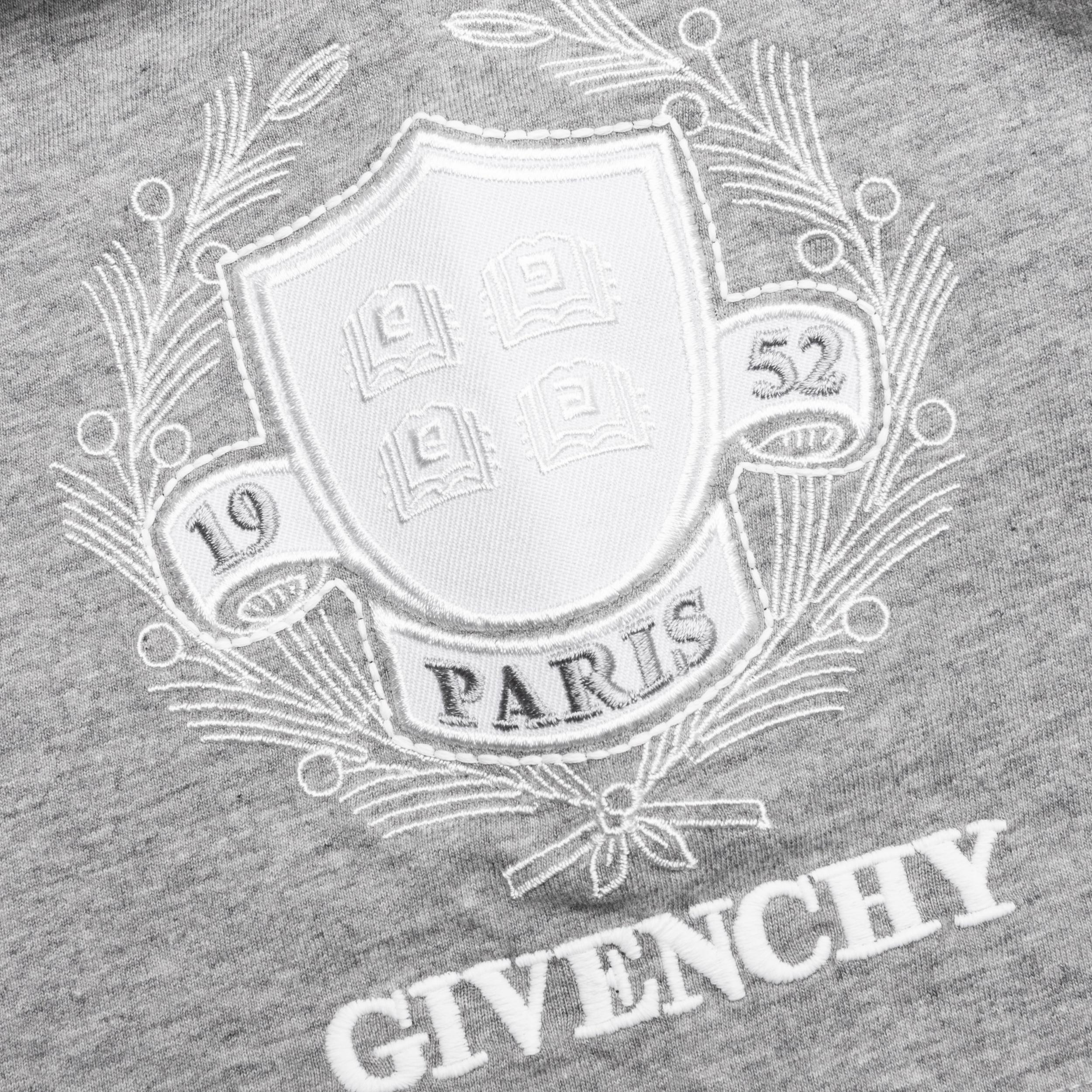 The Givenchy Crest T-Shirt in Light Grey Melange offers a blend of style and sophistication. With its classic crew neck design, this shirt features the iconic Givenchy Crest emblem adorned with mixed prints and embroideries on the front and sleeves, adding a touch of luxury to your look. The small 4G emblem printed on the lower back finishes the look. Crewneck design 100% cotton Givenchy Crest emblem with mixed prints Small 4G emblem printed on the lower back. Classic fit Style no: BM71JA3YL6-055