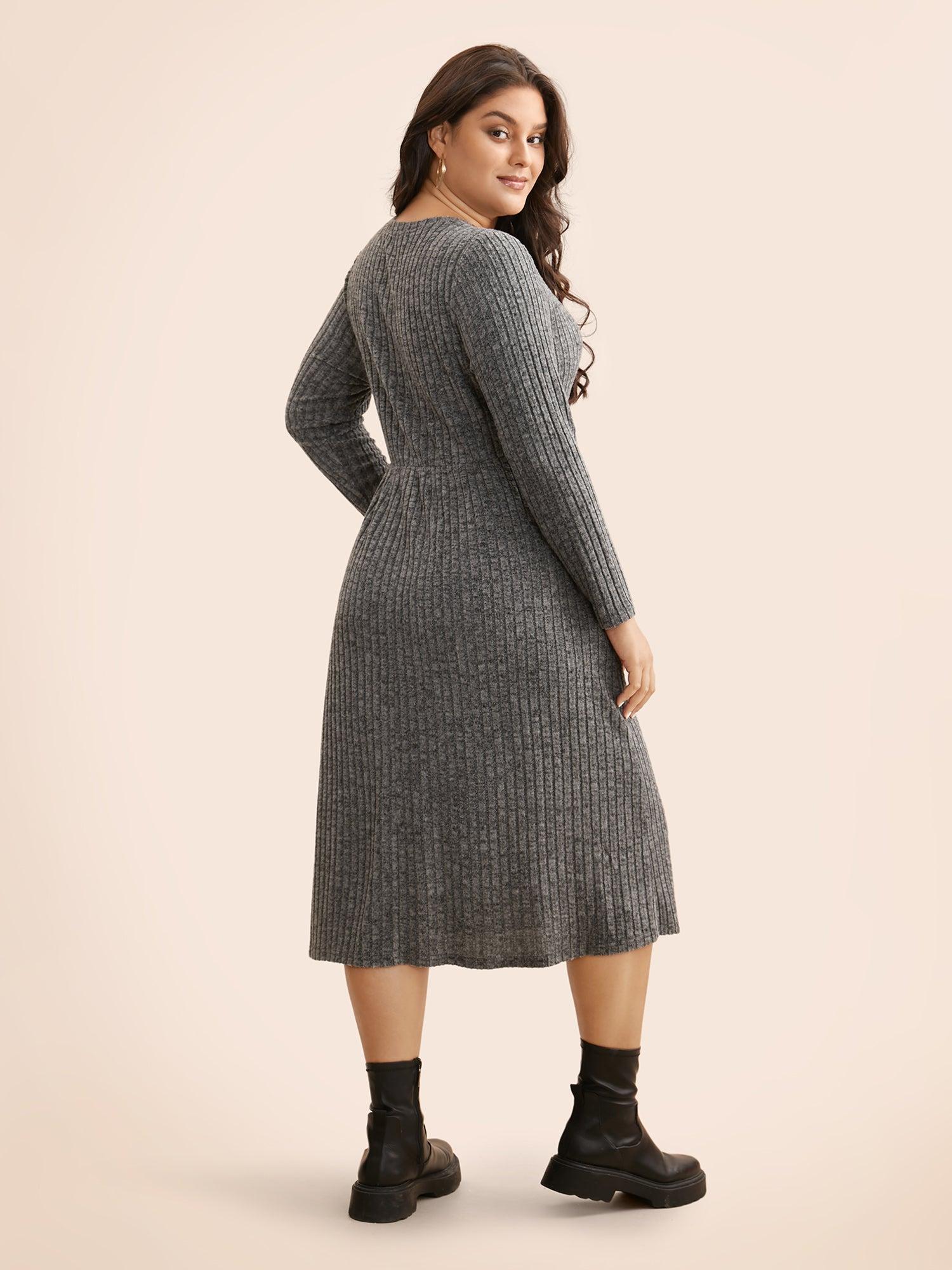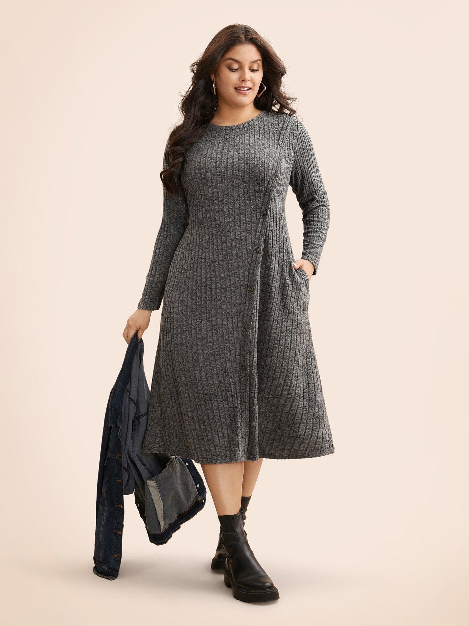 Shop Crew Neck Button Detail Slim Fit Dress now and redefine your style with confidence at BloomChic. Tailored for mid and plus-size women. This trendy Dress, sizes 10-30. You can never go wrong with BloomChic Dresses. Season:Winter;Color:DimGray;Style:Casual;Neckline:Round Neck;Sleeve Type:Regular Sleeve;Prints:Non;Details:Button, Texture;Pocket:Side seam pocket;Belt:No-belt;Closure Type:False placket