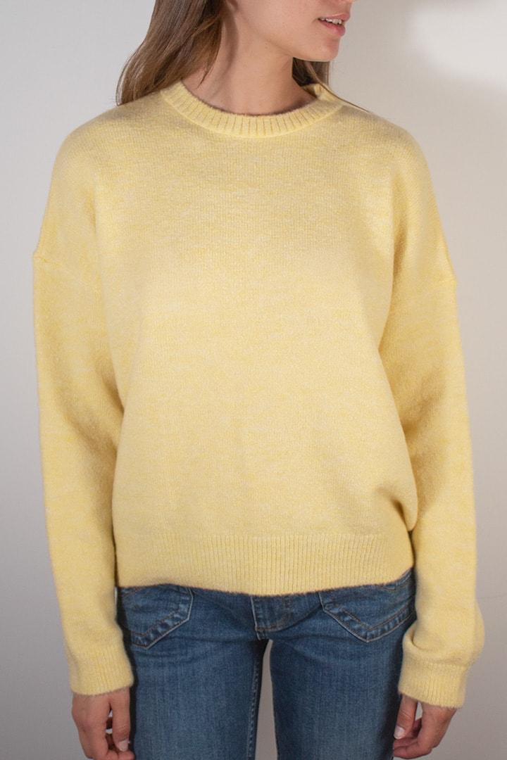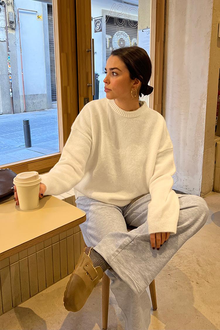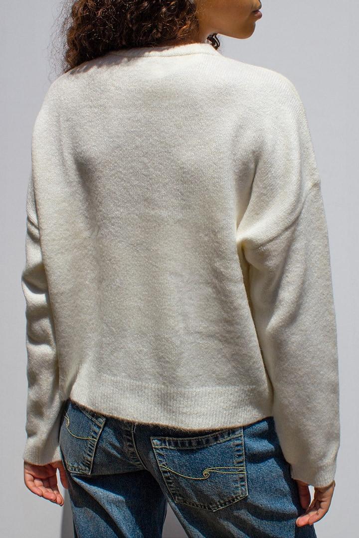 Crew neckline sweater, long sleeves, ribbed hem, regular length, relaxed fit.