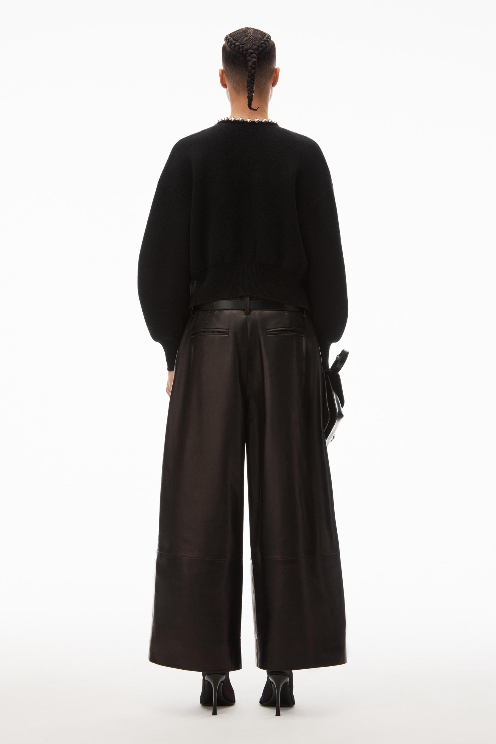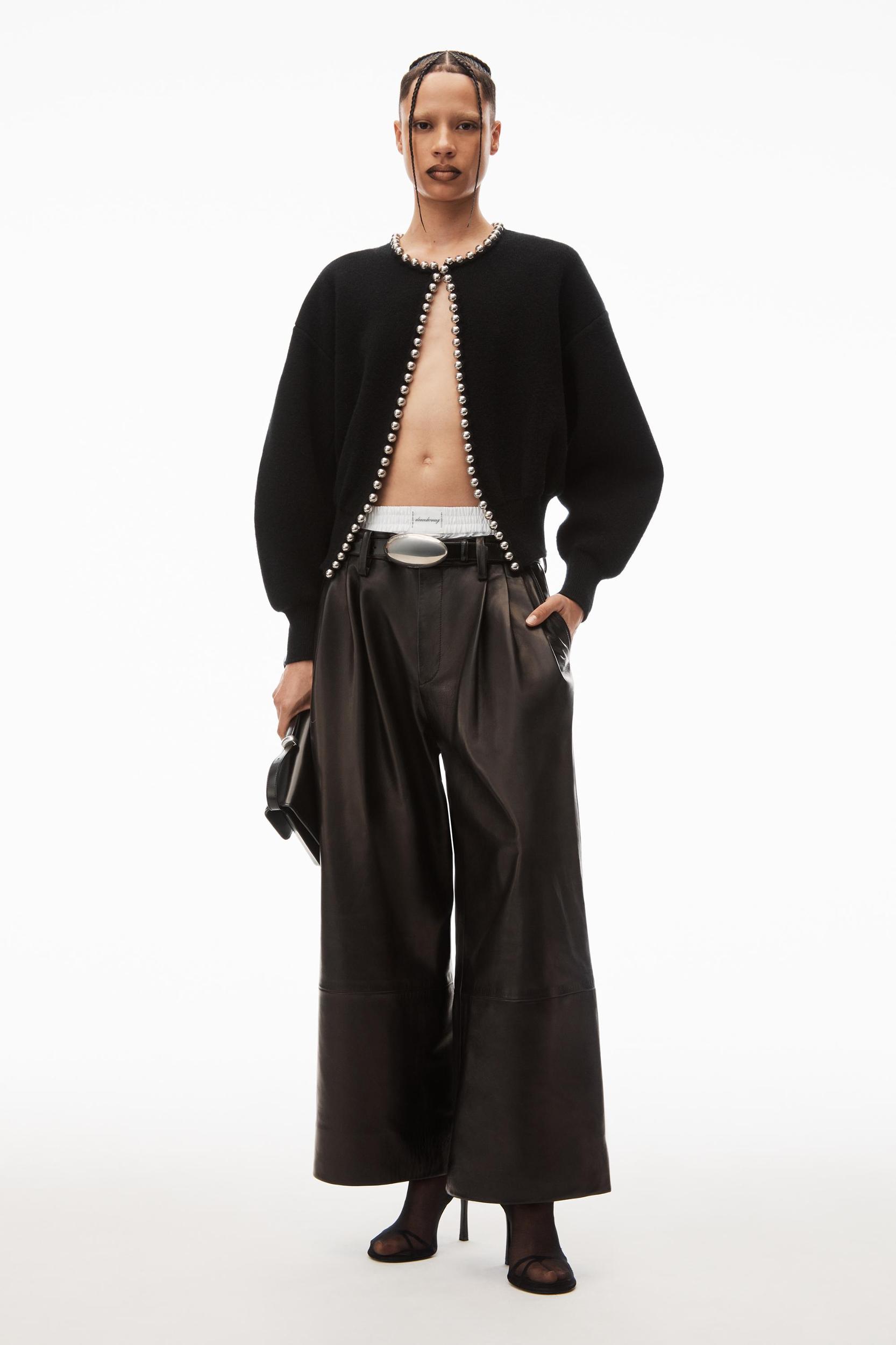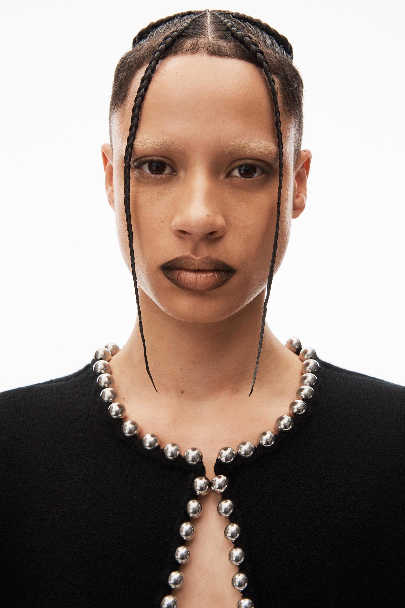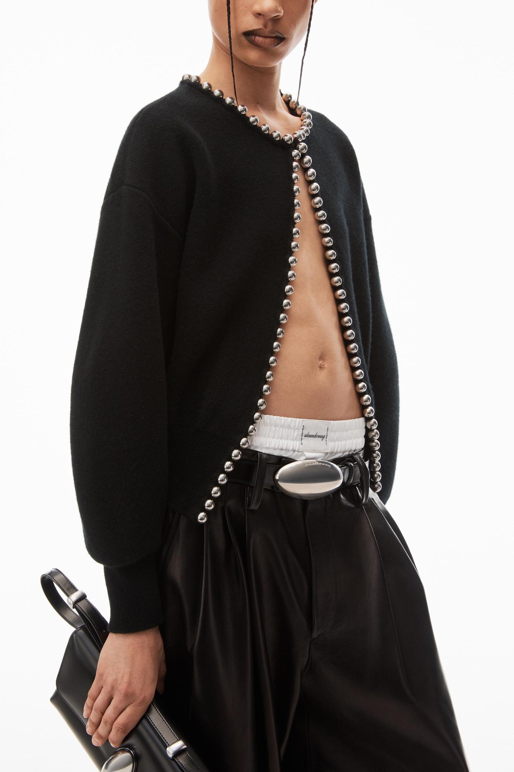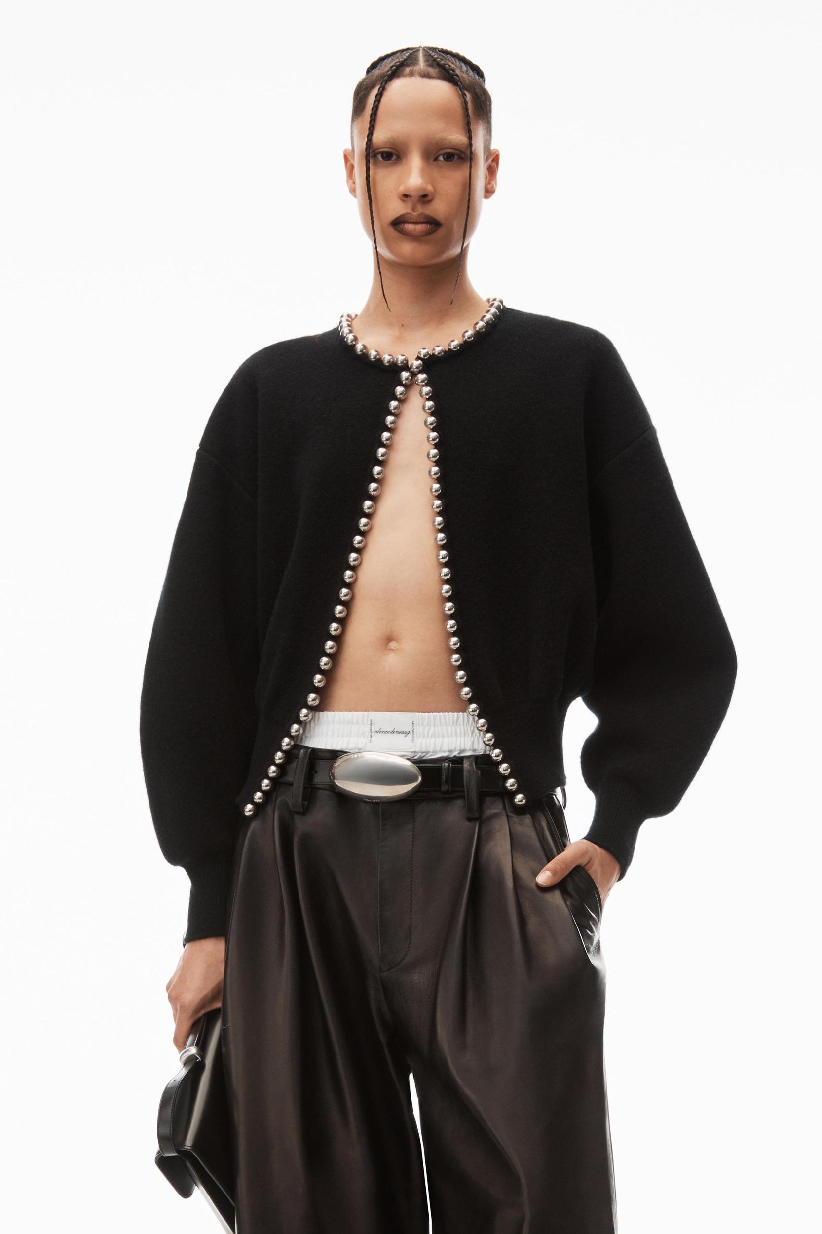 Black long-sleeve cardigan in boiled wool cashmere with metal ball chain trim on neckline and placket