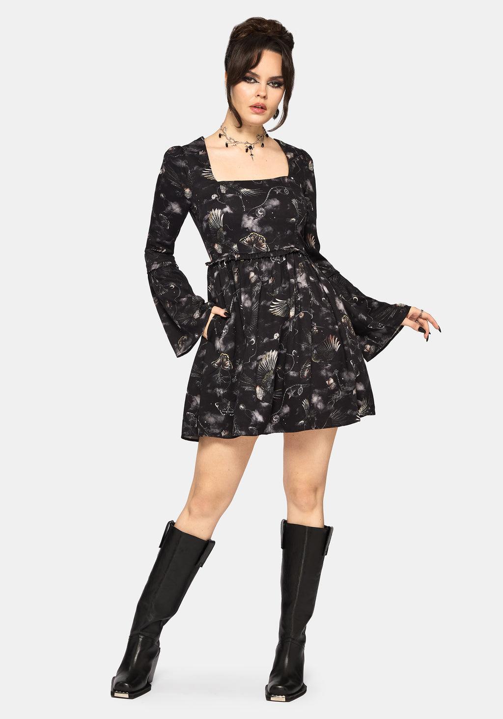 Crimson Magpie and Moth Print Mini Ruffle Dress