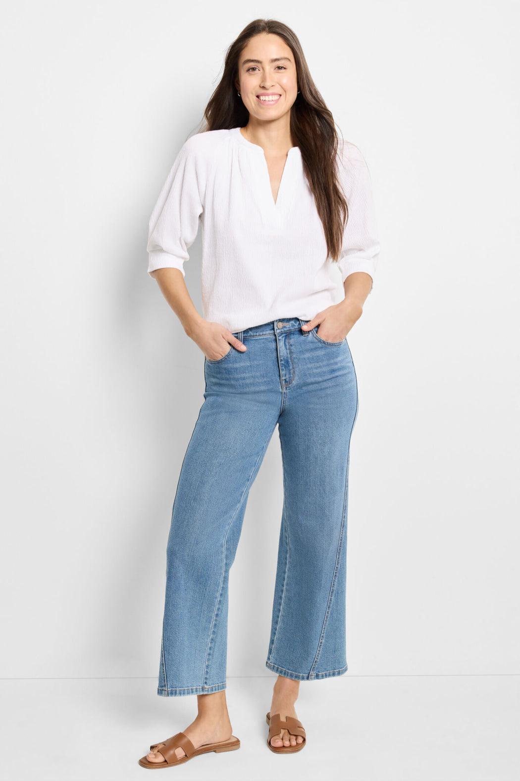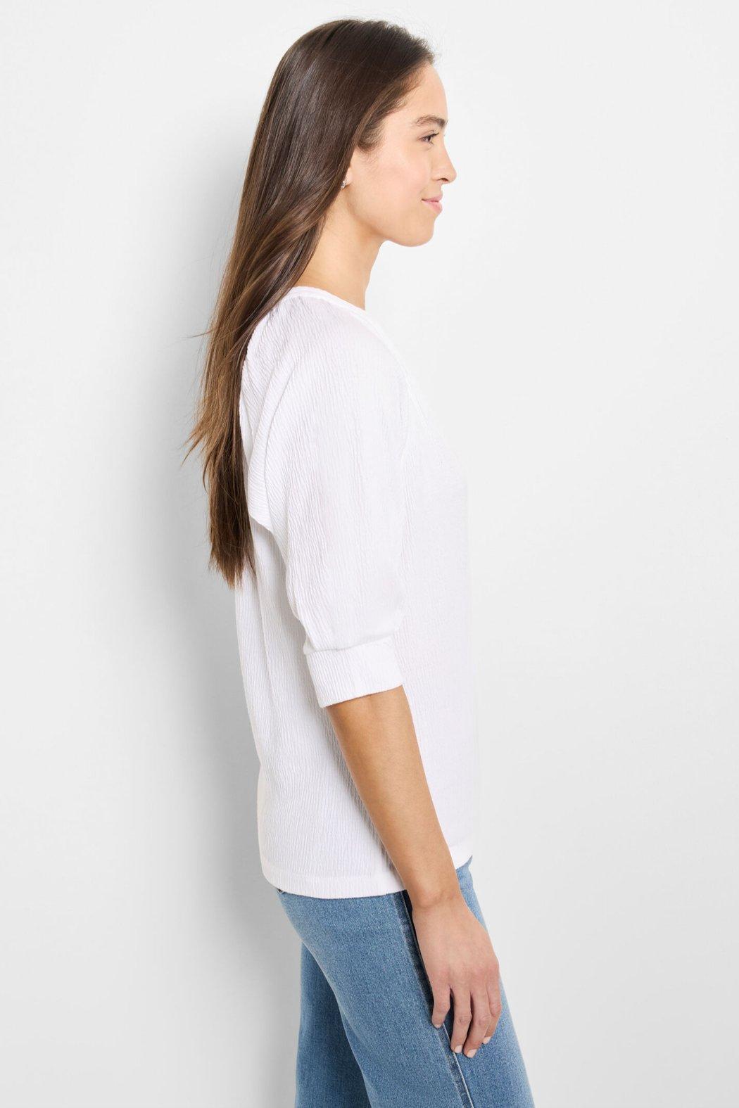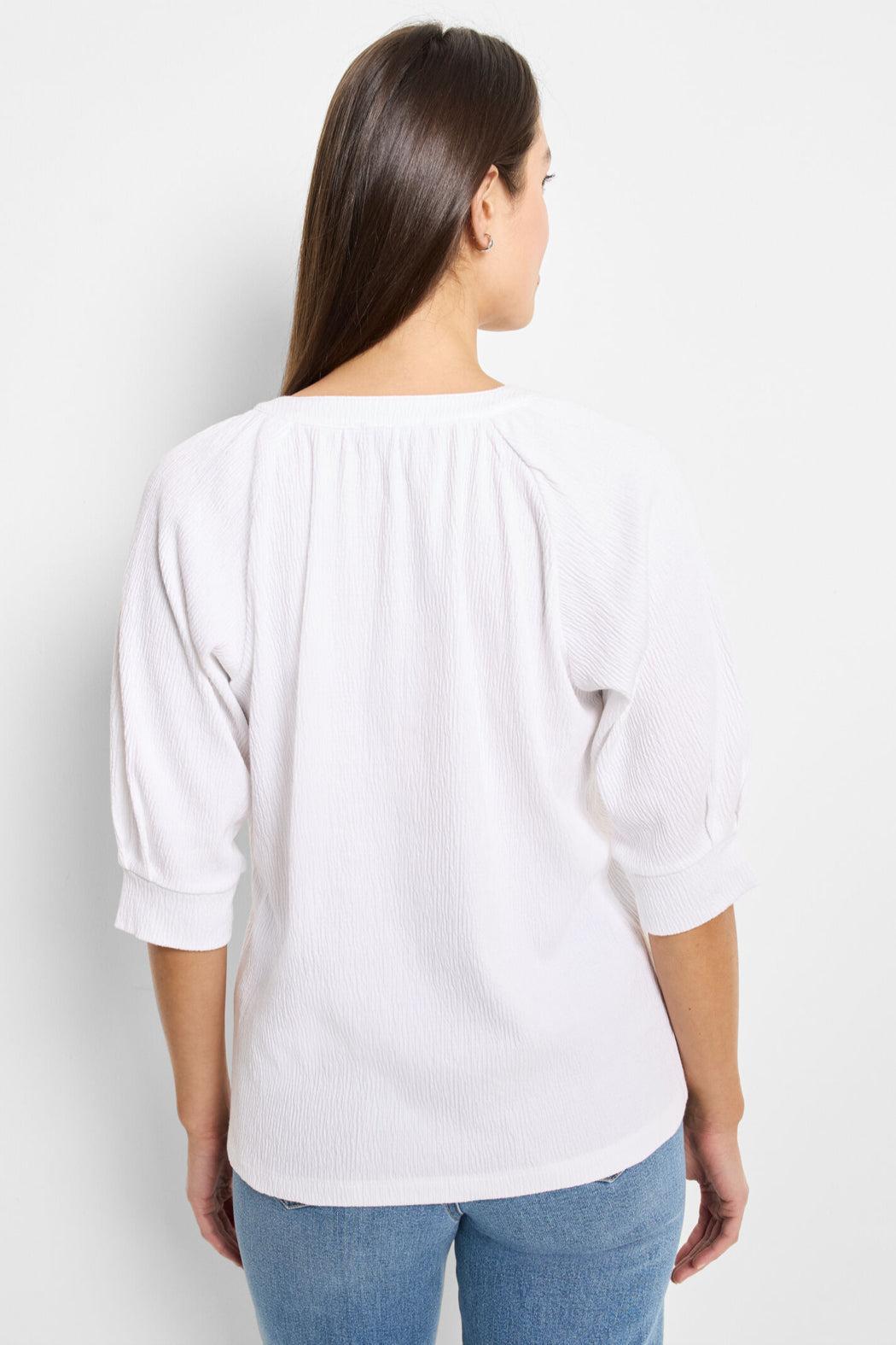 What to wear on your next coffee run, whether you're hitting the drive through or taking your time. This elevated everyday knit top features raglan elbow sleeves, a slight gathering over the cuff, and a split neck. Made from a new fabric with the perfect combination of texture, drape, and stretch. Designed with an easy silhouette that sits at the hip. Goes great with jeans!