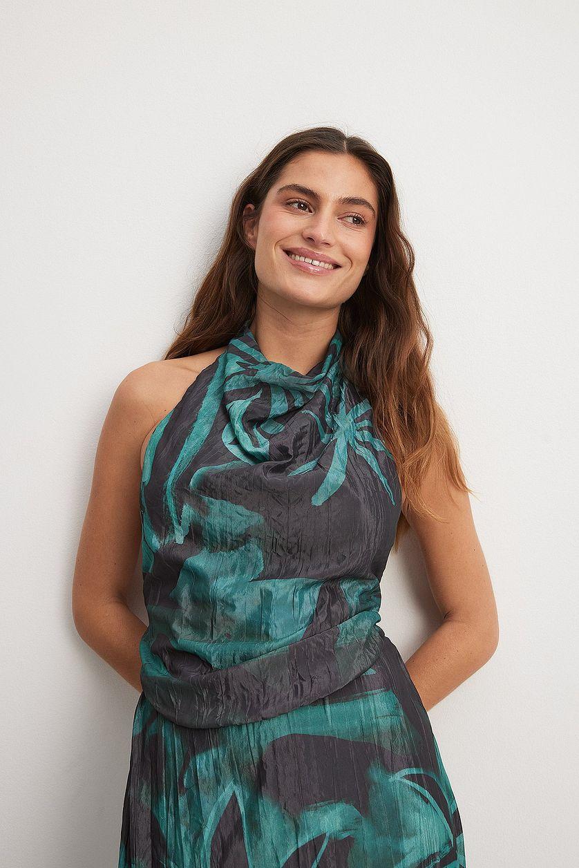 This top features a structured material and a halterneck design. It has an open back with an elasticated band.