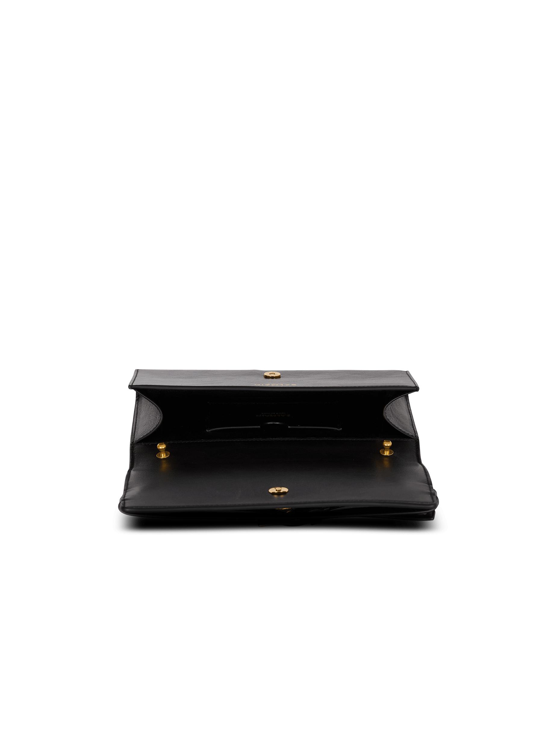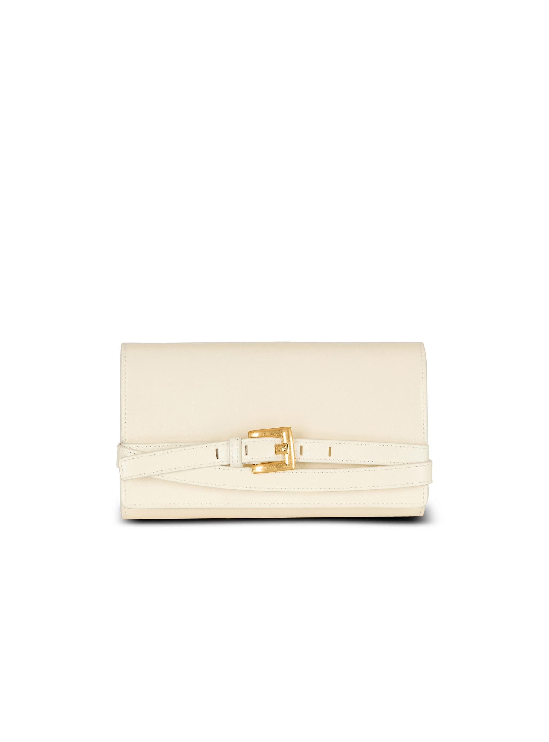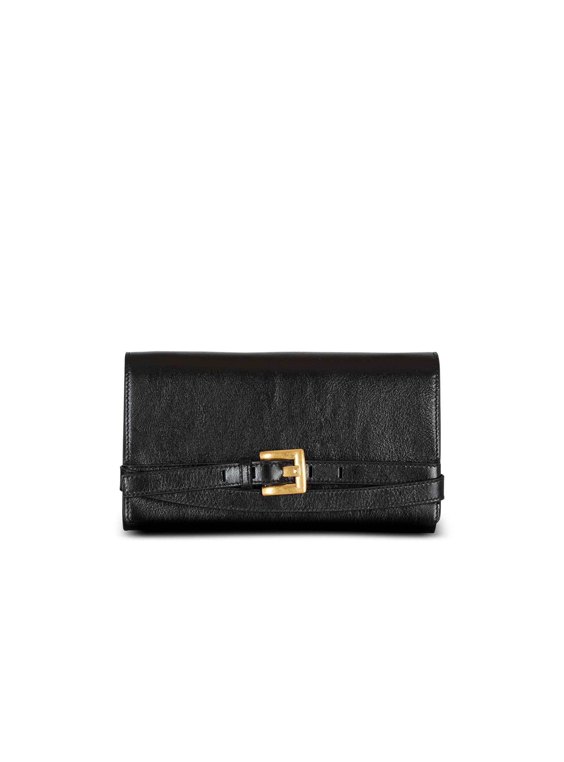 Crinkled leather wallet with Shuffle chainCarry in the hand, on the shoulder or across the bodyDetachable chain and leather shoulder strapFlap with belt embellished with a metal buckleEmbossed Balmain Paris logo on the backMagnetic fasteningLeather card pocket, embossed Balmain logoLeather liningDimensions: 2.5 x 21 x 12 cmMain material: 100% calfskinMade in ItalyItem: FN1ON259LTFL