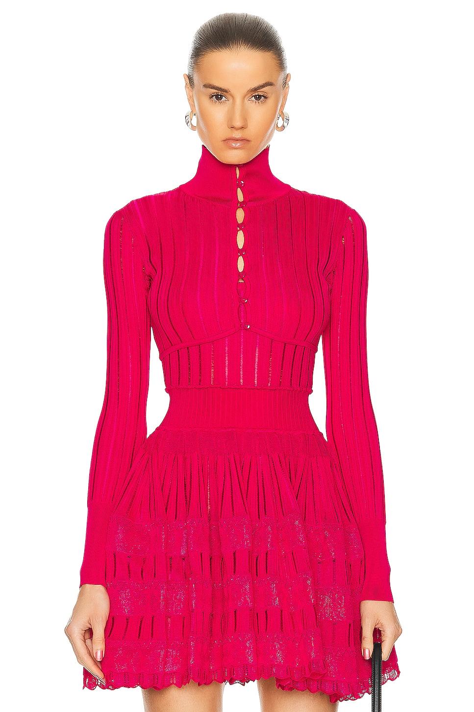 Founded by Azzedine Alaïa; today the maison; under the direction of Pieter Mulier; continues the revered couturier's uncompromising vision which champions masterful cuts that accentuate the female form. The house is perhaps best known for its statement bags; edgy footwear; and laser-cut accessories. With the high neck; button down front; and bright turquoise color; Alaia modernizes the crop cardigan. Style with a matching turquoise skirt and the label's wedges for a just off the runway outfit; or make your own by pairing with high waisted wide leg white trousers and leather shoulder bag.