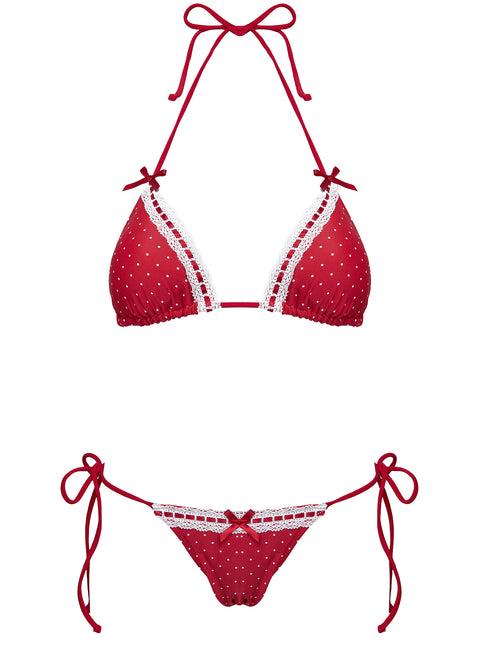 Lace trim, bow detail, tie-side fastenings, fixed coverage