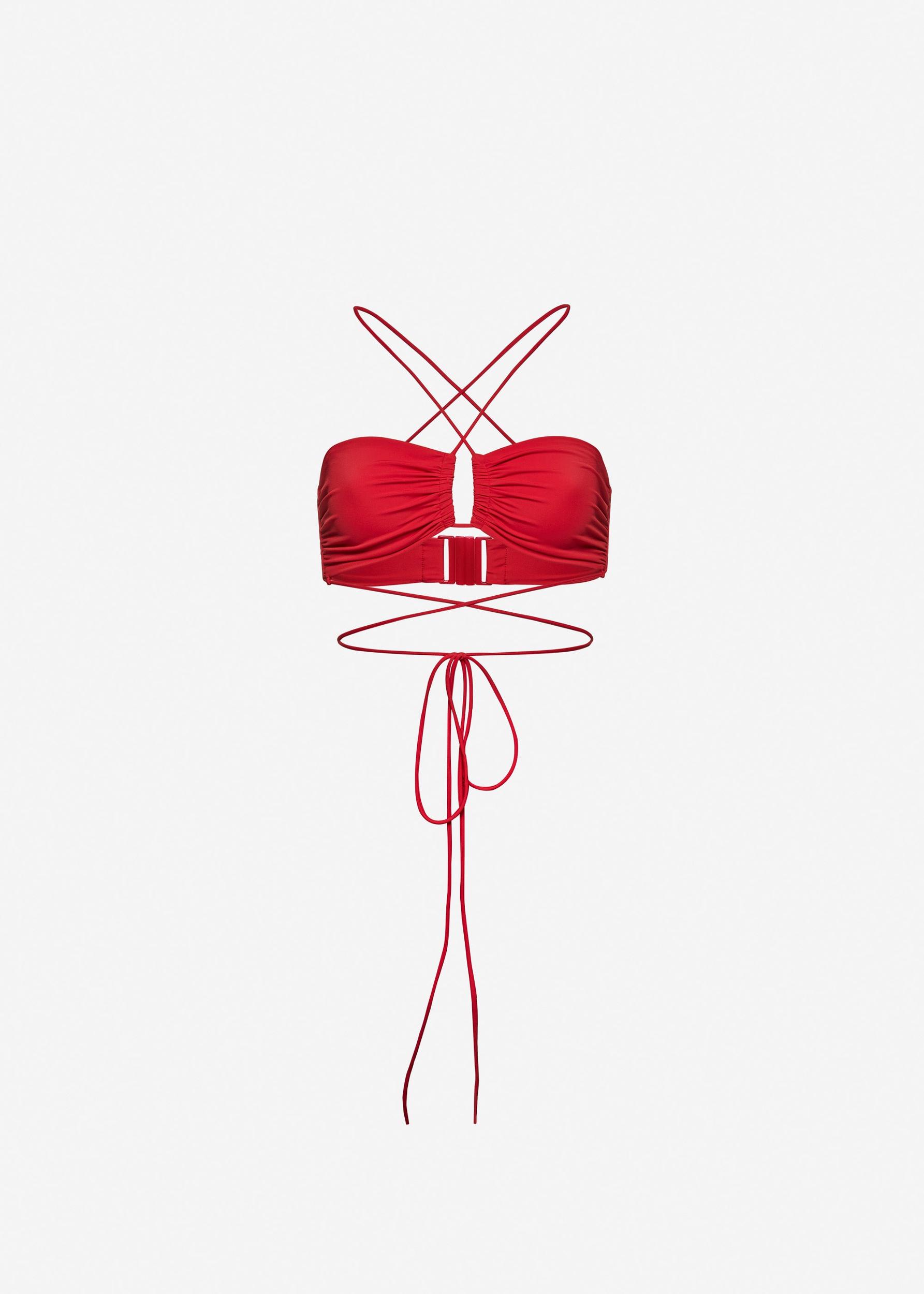 A bandeau style top which joins together in the middle with strings to create a keyhold sort of opening. The straps create a crisscross detail at the chest and in back, as well as underneath the bra on the abdomen.