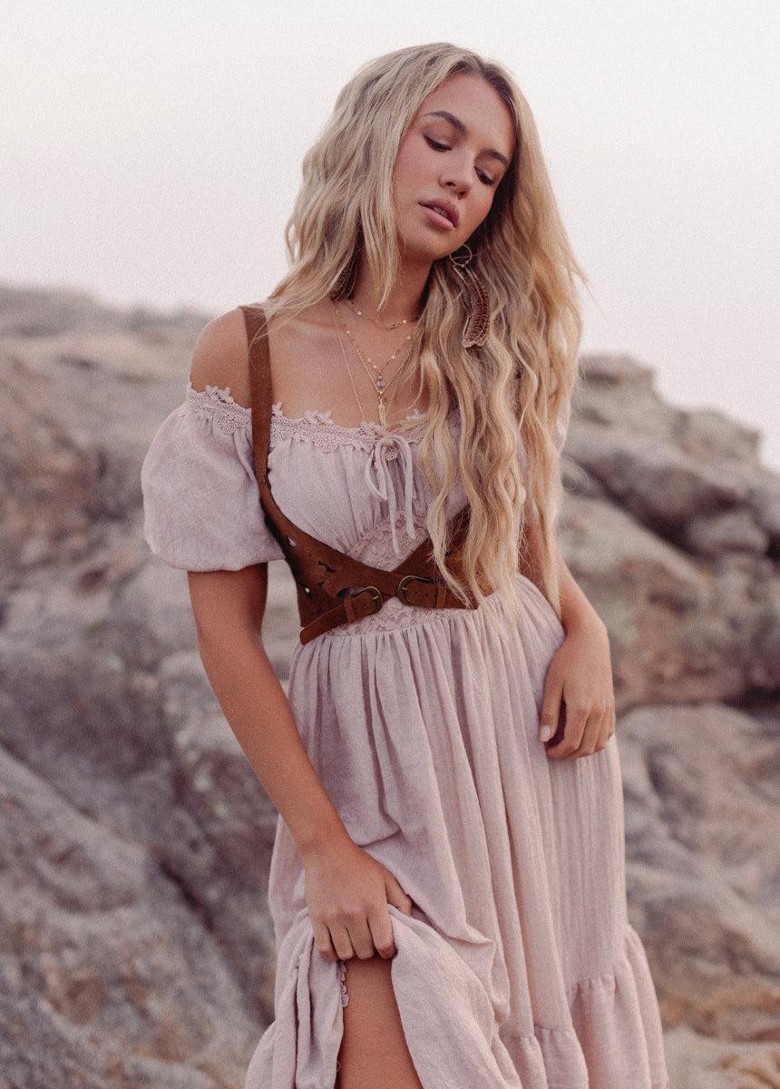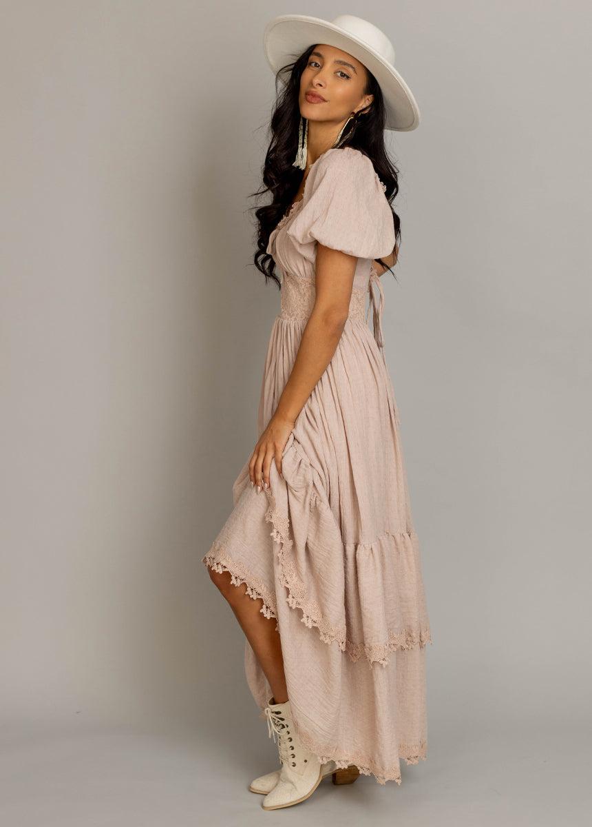 Embrace the soft, effortless beauty of spring in the Christina Dress—a perfect blend of romance and whimsy. The sweet sweetheart neckline and delicate lace trim add a touch of vintage charm, while the criss-cross lace-up back brings a playful twist. With gathered waist and full, flowing skirt, this dress dances with every movement, making it a dreamy choice for any occasion. Sweetheart neckline Tunneled elastic at neckline and shoulders Lace trim details Gathered shoulder seam puff sleeves Lined lace panel at waist Gathered waist Criss-cross functional lace-up back Center back invisible zipper closure Maxi length Fully lined Self: 20% Cotton 80% Polyester Lining: 100% Polyester Model is 5'6 wearing size XS