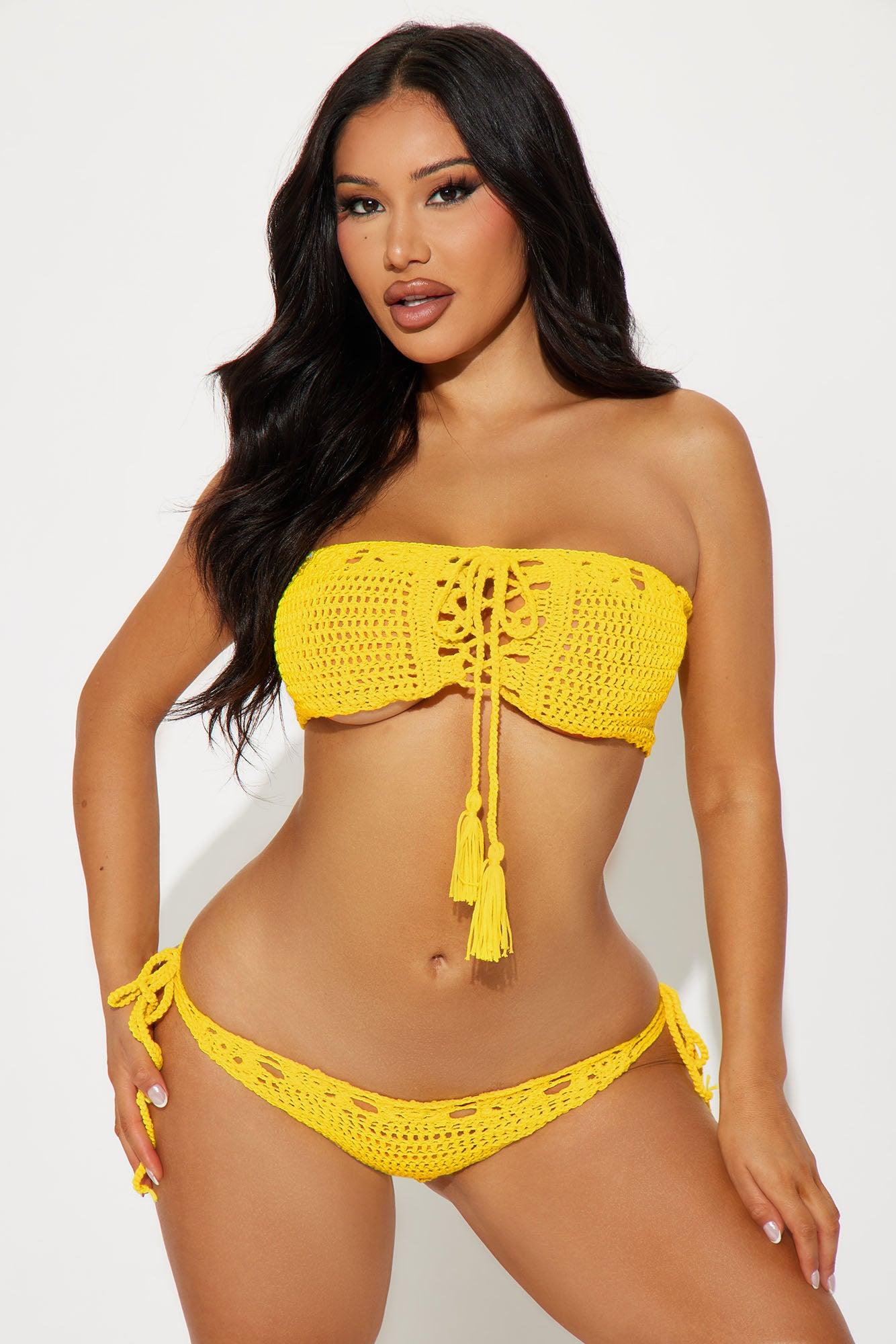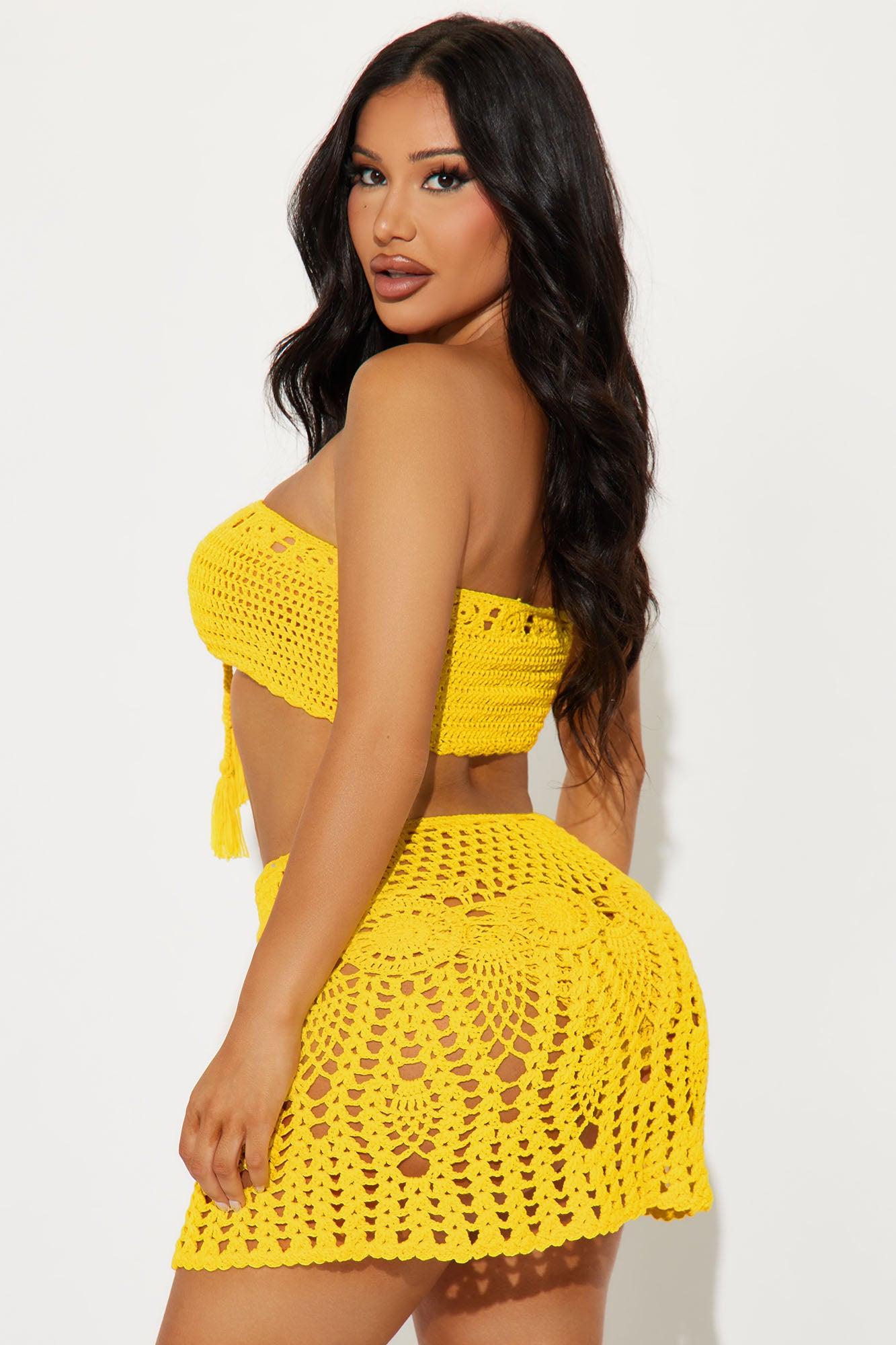 Available In Yellow. 3 Piece Ensemble Skirt Sunsuit Crochet Bandeau Top Front Adjustable Lace Up Side Tie Bikini Bottom Cheeky Skirt Drawstring Tassel Detail Full Stretch Final Sale Disclaimer: Recommended For Poolside Use - Not Water Resistant 100% Acrylic