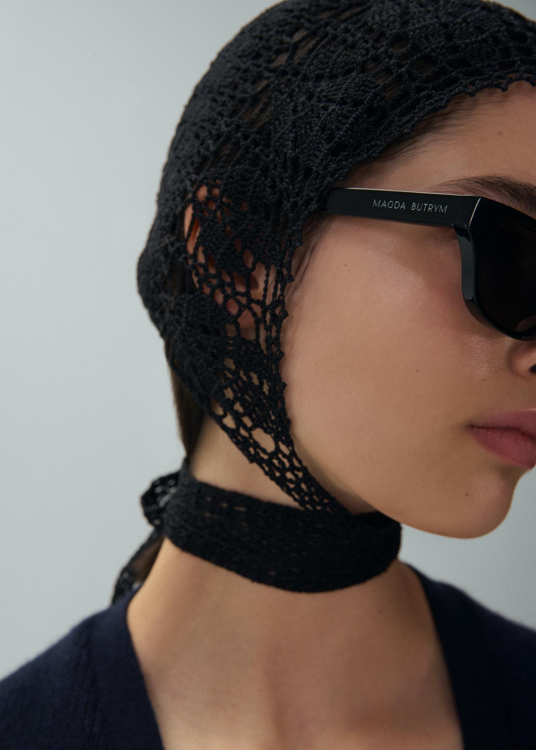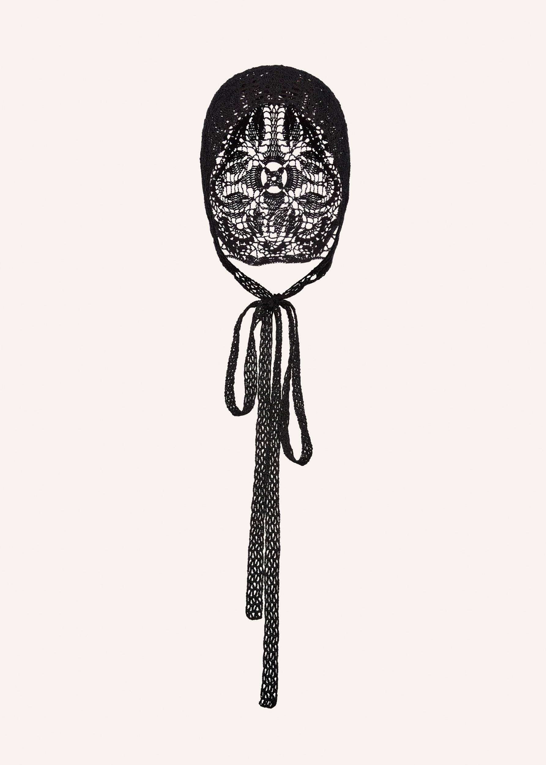 Pre-order: Expected to ship by 30.06.2025 A black crochet bonnet, handmade by Polish artisans, featuring a tie at the neck, showcasing the brand's dedication to cultural heritage and craftsmanship.