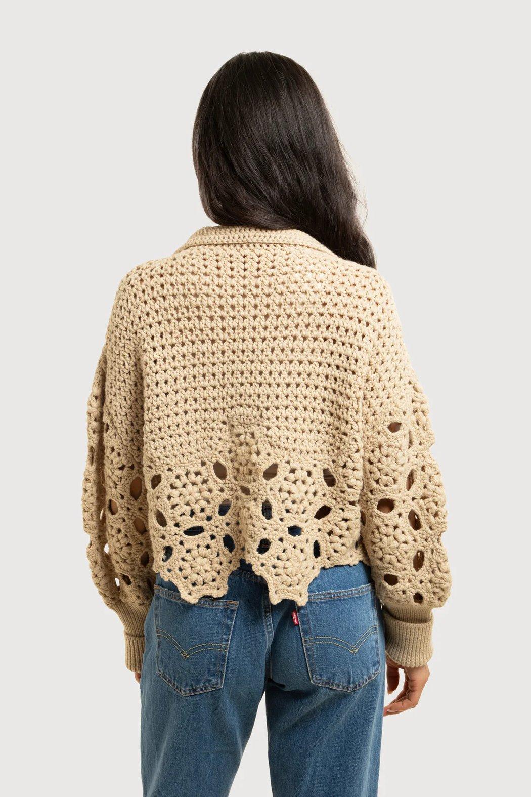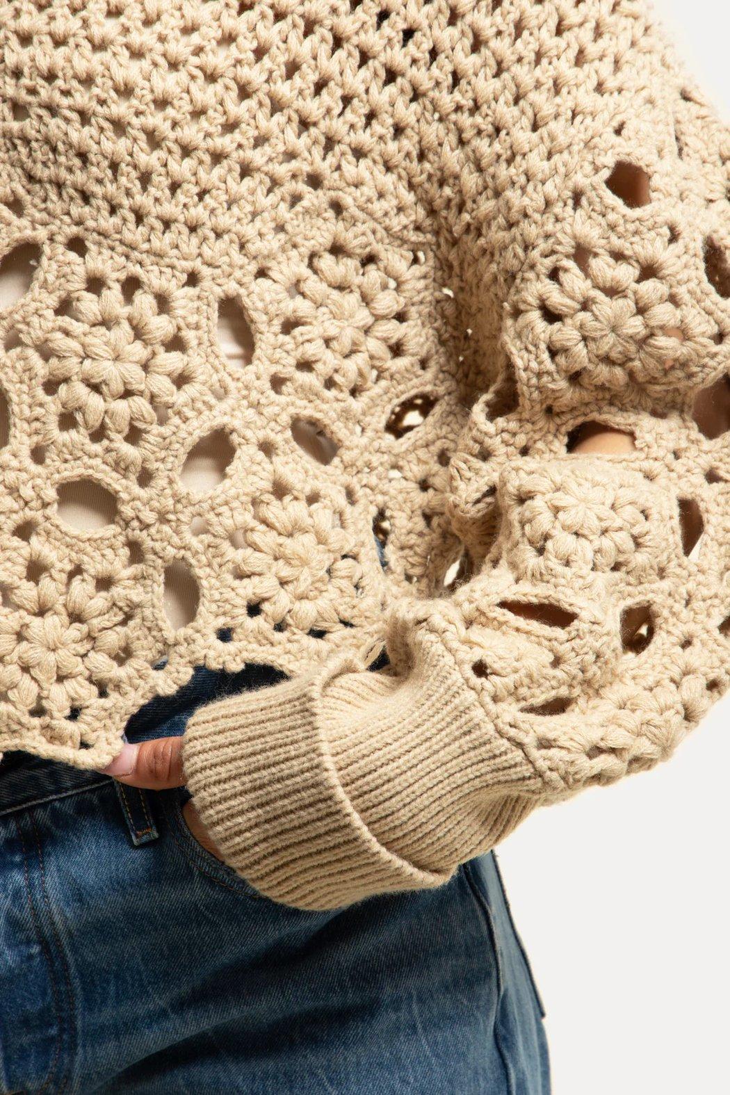 Introducing our Crochet Collared Pullover Sweater. Crafted with breathable crochet fabric, it features a unique hidden floral design and mixed geometric patterns, adding flair to its v-neck silhouette. With its crocheted collar and adaptable style, this sweater is perfect for layering over a camisole, pairing with jeans, or adding a touch of elegance to your work attire.