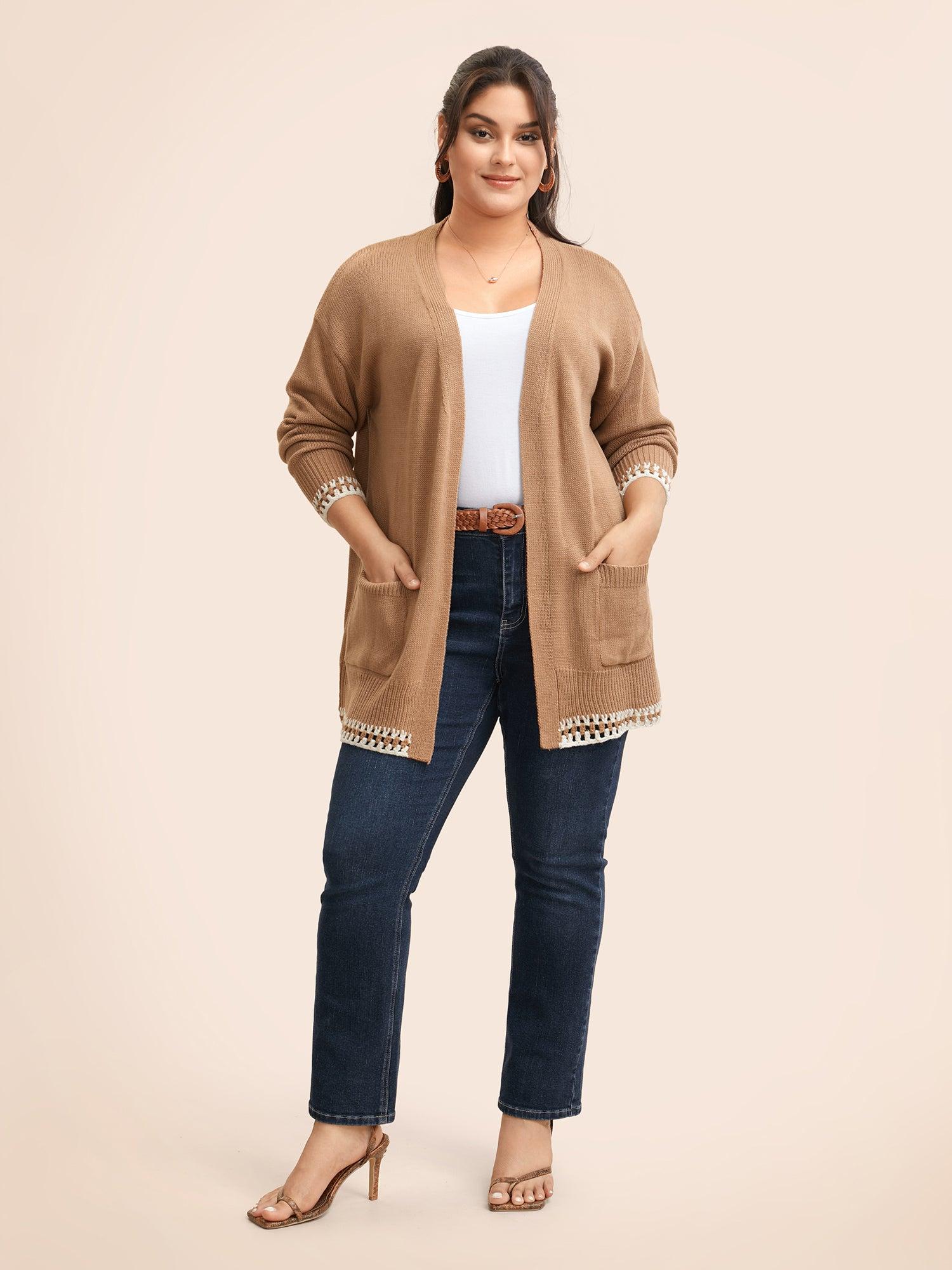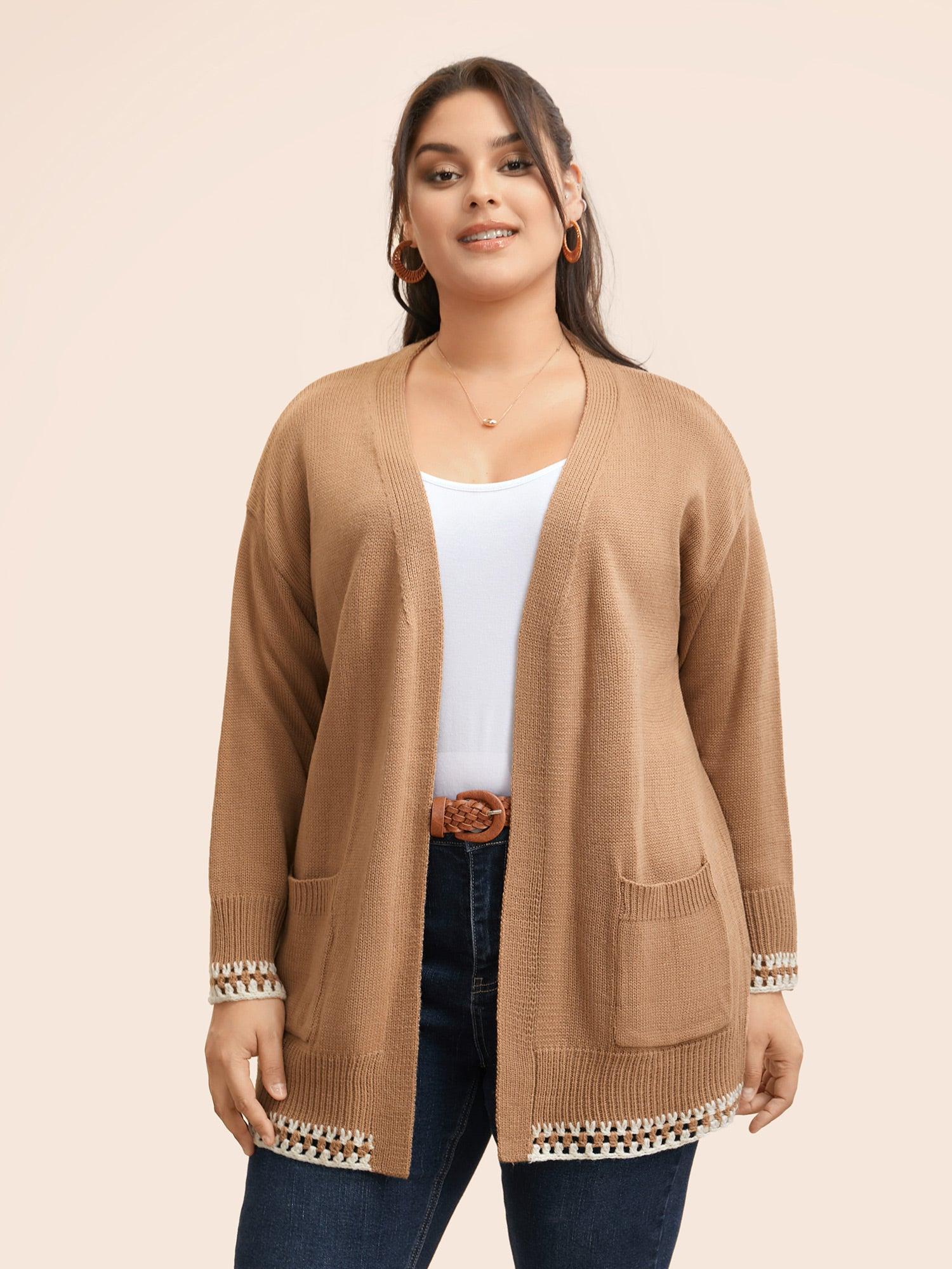 Shop Crochet Contrast Wool Blend Cardigan now and redefine your style with confidence at BloomChic. Tailored for mid and plus-size women. This trendy Sweaters Cardigans Women, sizes 10-30. Season:Winter;Color:Tan;Style:Casual Everyday;Neckline:Kimono collar;Sleeve Type:Drop shoulder sleeve;Prints:Non;Details:Crochet, Contrast;Pocket:Patch pocket;Belt:No-belt;Closure Type:Open front without closure