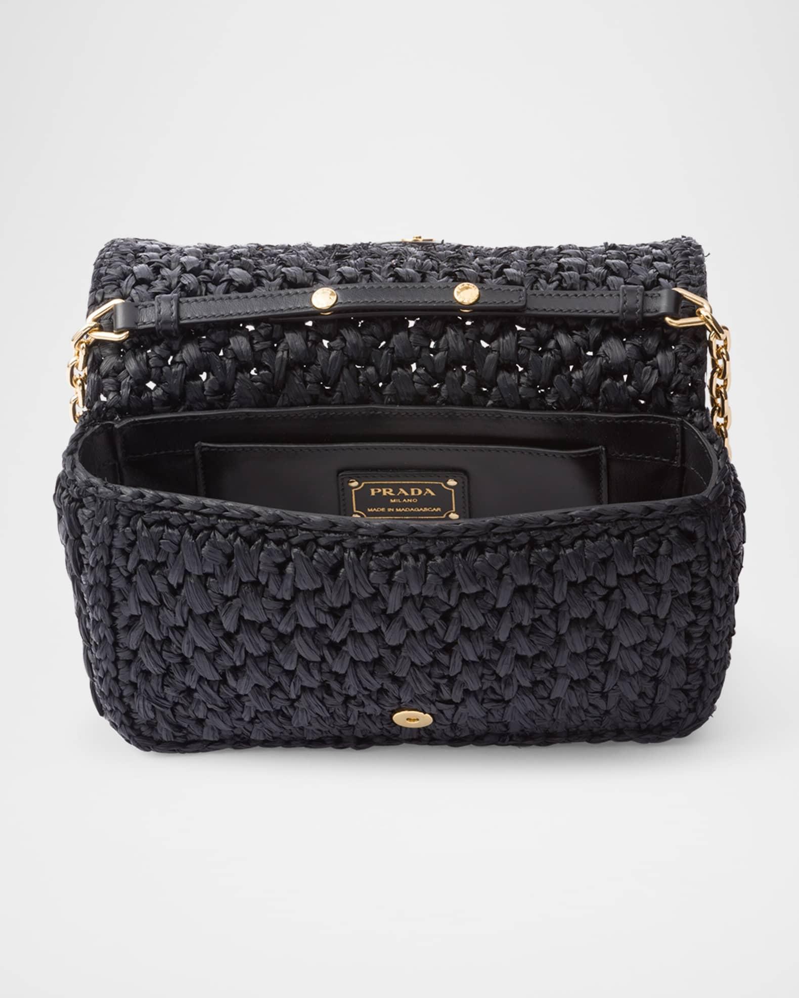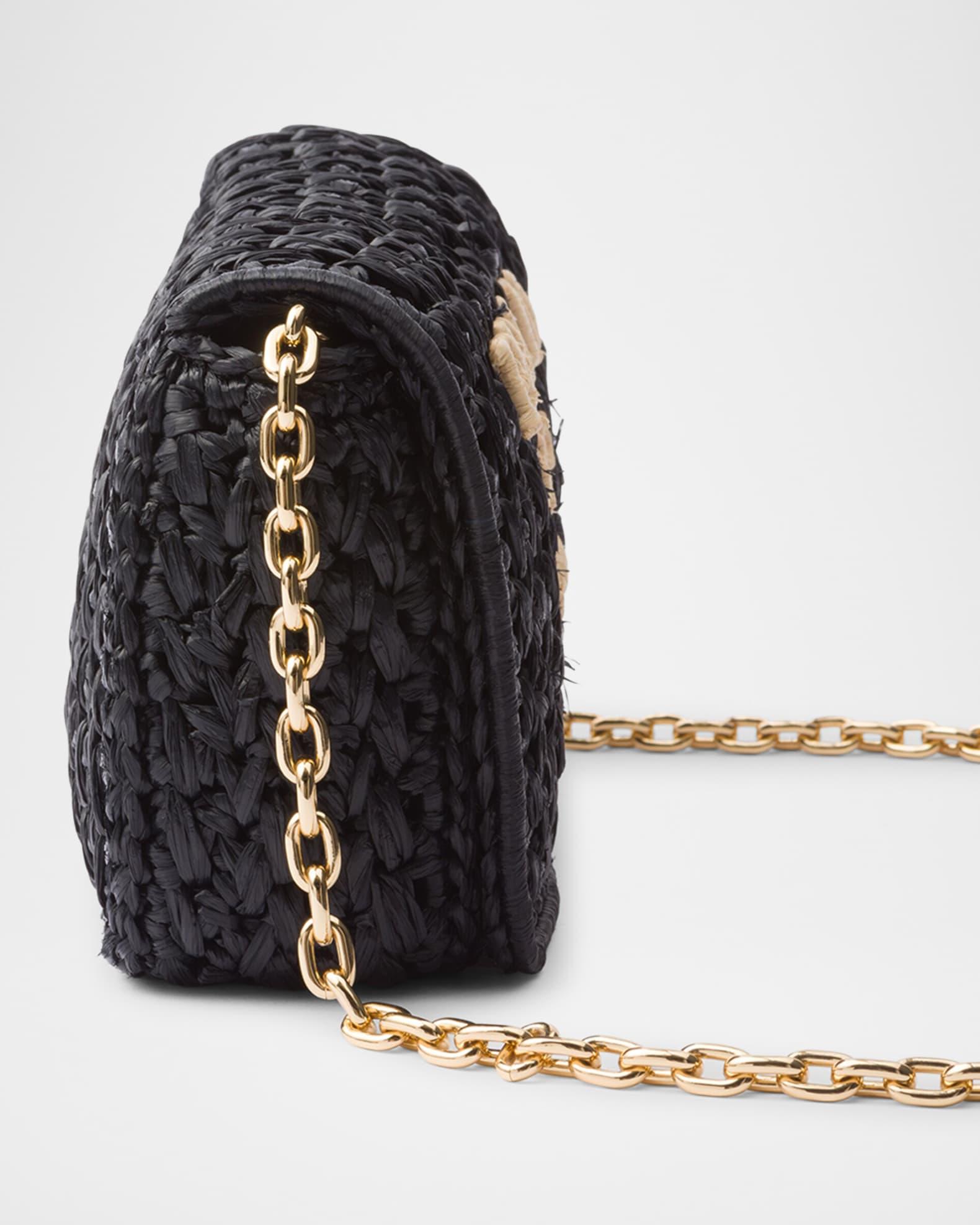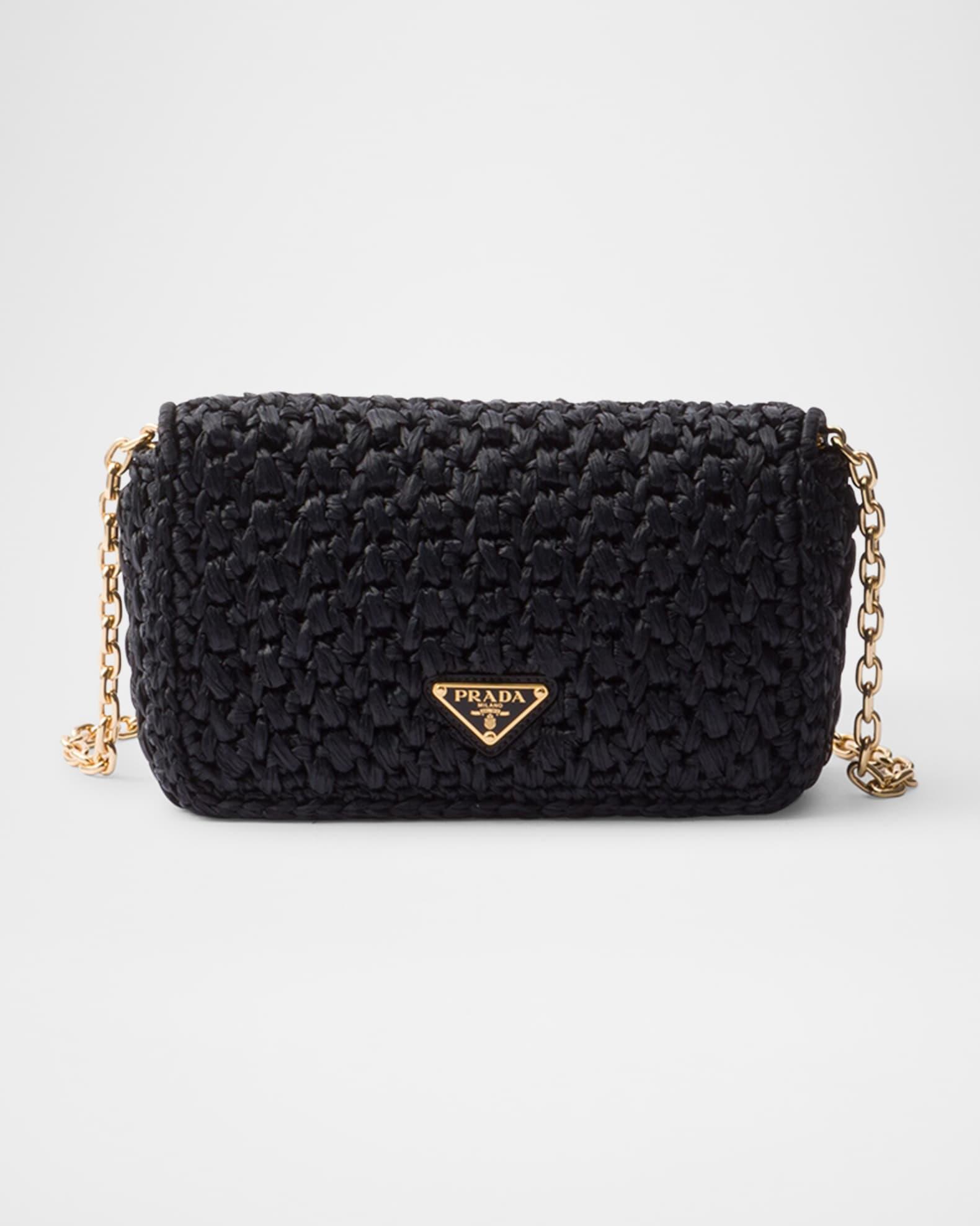 Prada shoulder bag crocheted in raffia-effect viscose with embroidered logo on the front Detachable chain shoulder strap, 20.5" drop Can be worn as a clutch or shoulder bag Flap top with magnetic closure Signature enameled metal triangle logo Nappa leather lining Interior, one slip pocket Approx. 4.7"H x 8.3"W x 2.4"D Imported
