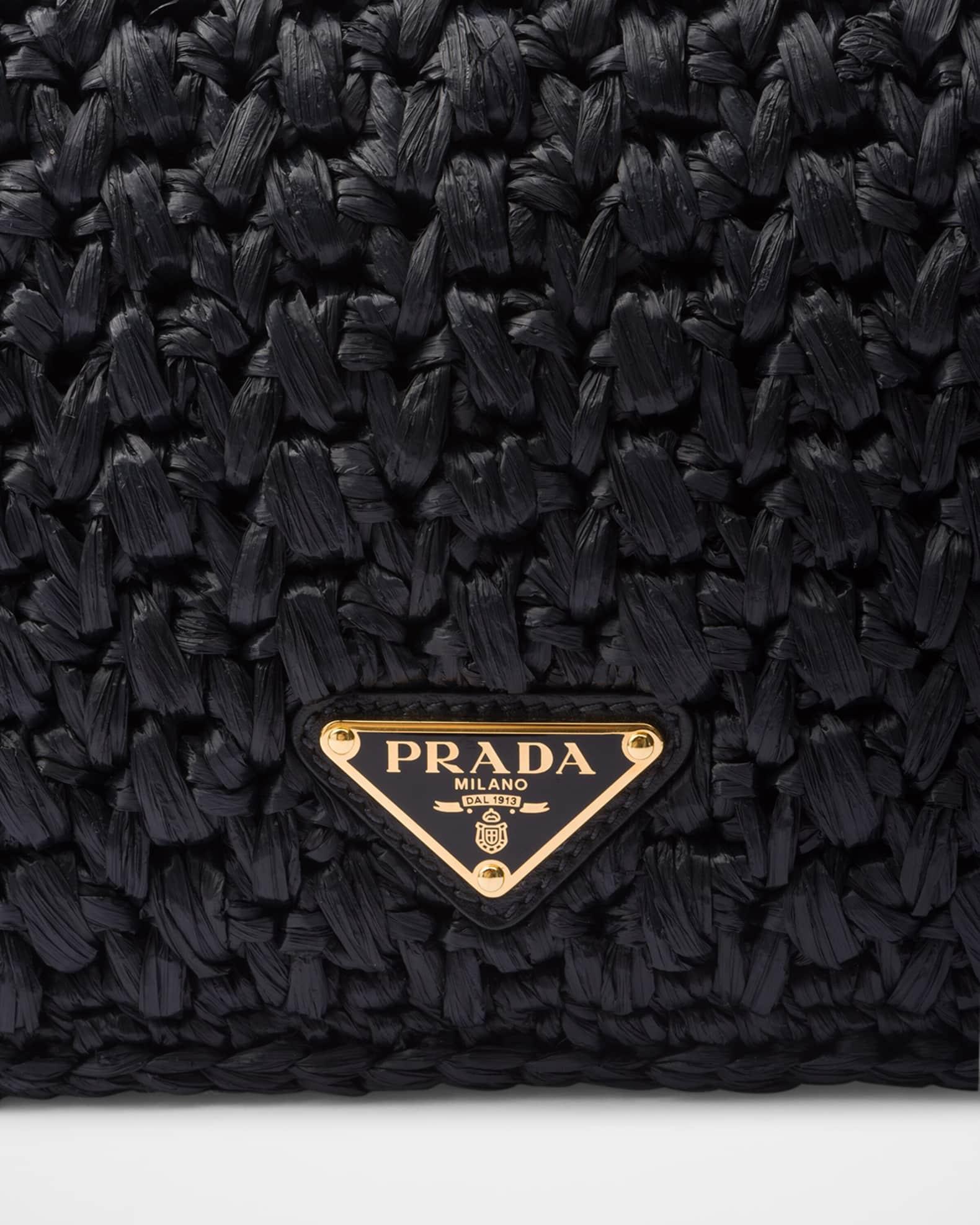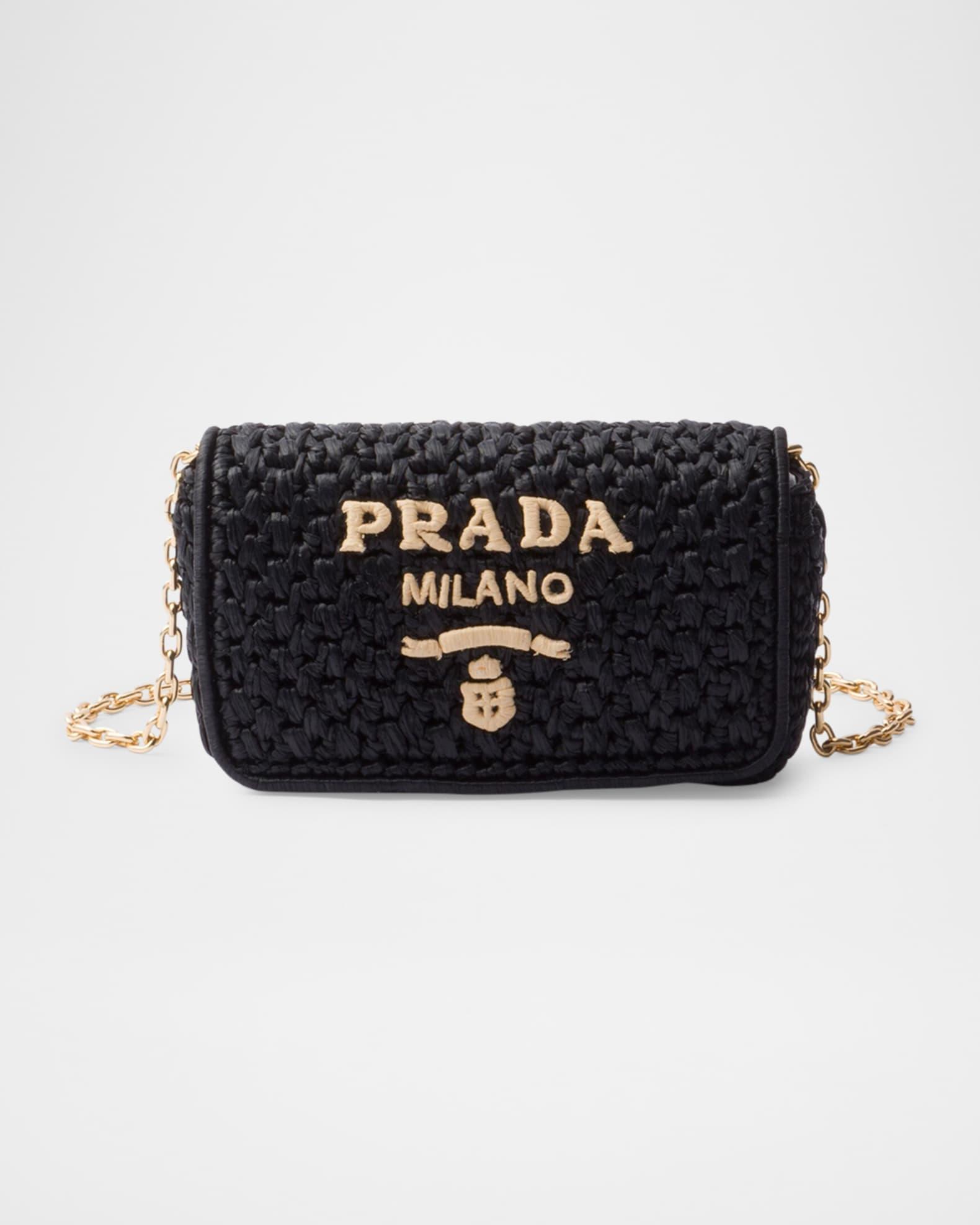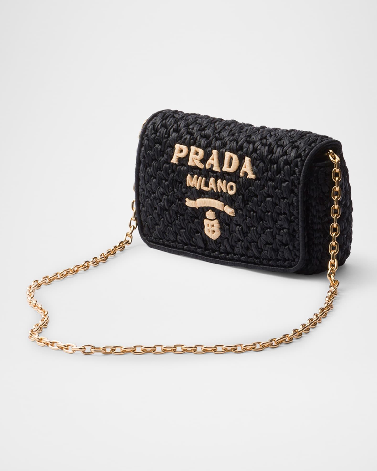 Prada shoulder bag crocheted in raffia-effect viscose with embroidered logo on the front Detachable chain shoulder strap, 20.5" drop Can be worn as a clutch or shoulder bag Flap top with magnetic closure Signature enameled metal triangle logo Nappa leather lining Interior, one slip pocket Approx. 4.7"H x 8.3"W x 2.4"D Imported