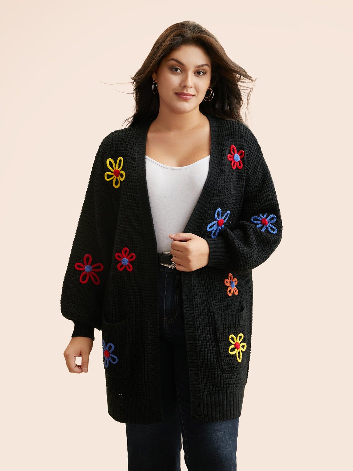 Shop Crochet Floral Puff Sleeve Pocket Cardigan now and redefine your style with confidence at BloomChic. Tailored for mid and plus-size women. This trendy Sweaters Cardigans Women, sizes 10-30. Season:Winter;Color:Black;Style:Casual;Neckline:Kimono collar;Sleeve Type:Puff Sleeve;Pattern Type:Natural Flowers;Prints:Non;Details:Crochet, Contrast, Texture;Pocket:Patch pocket;Belt:No-belt;Closure Type:Open front without closure