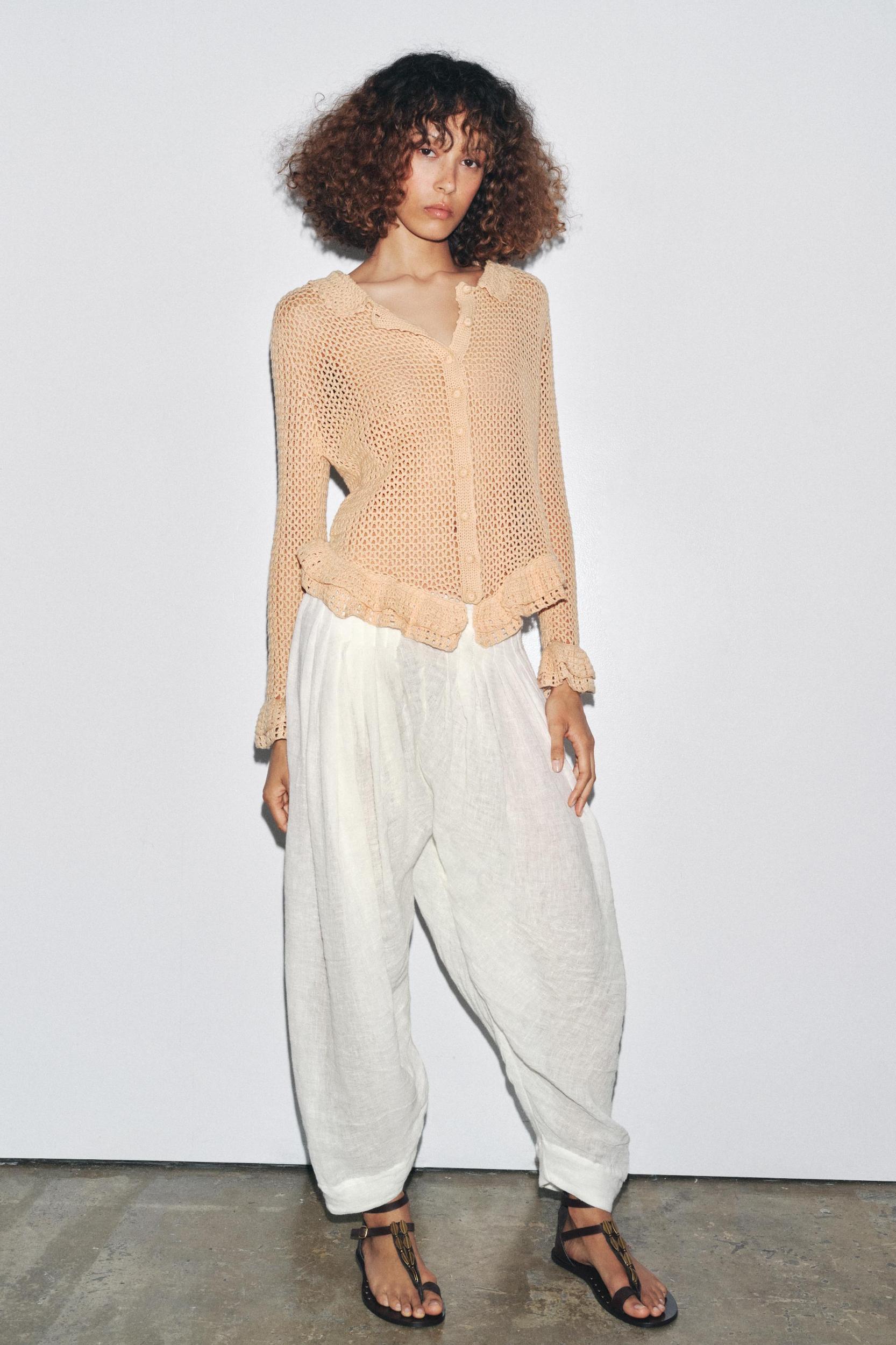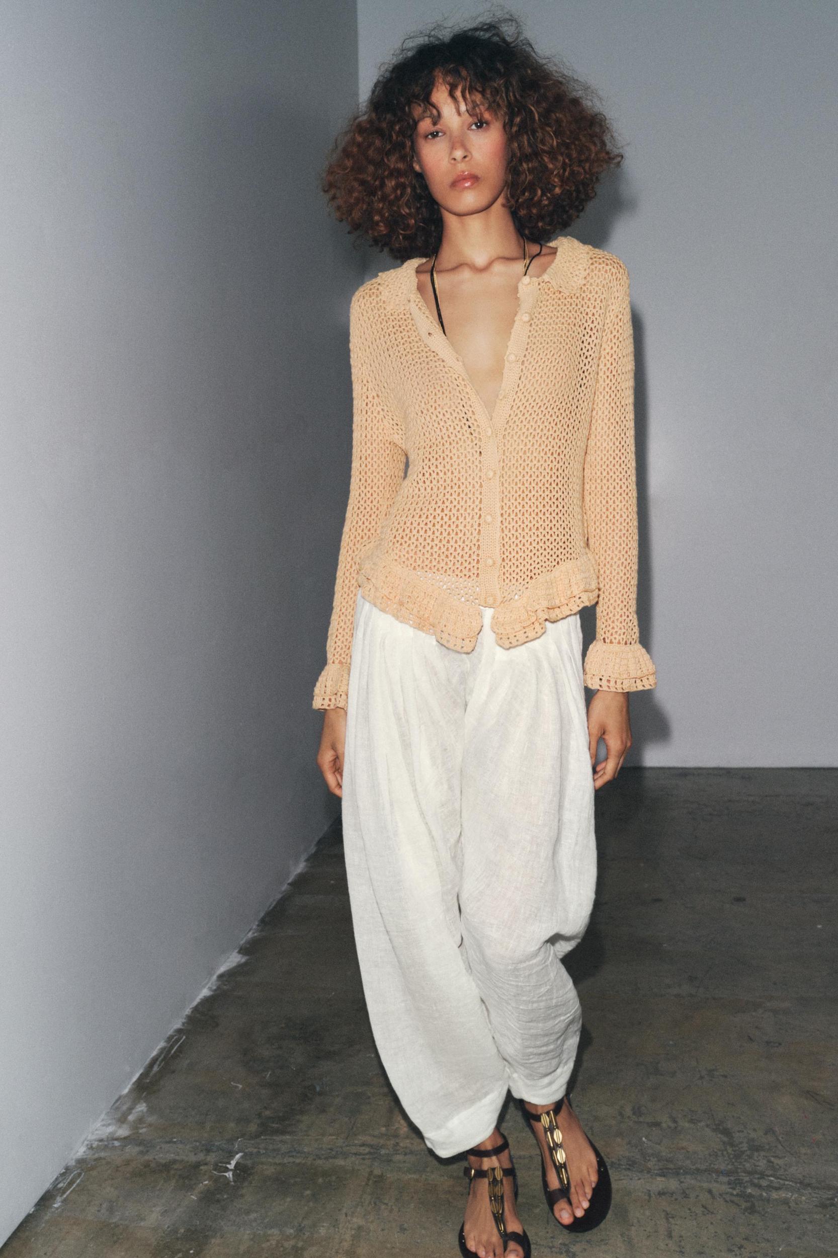 Cardigan with lapel collar and long sleeves. Finished with ruffles and tone-on-tone covered front buttons.