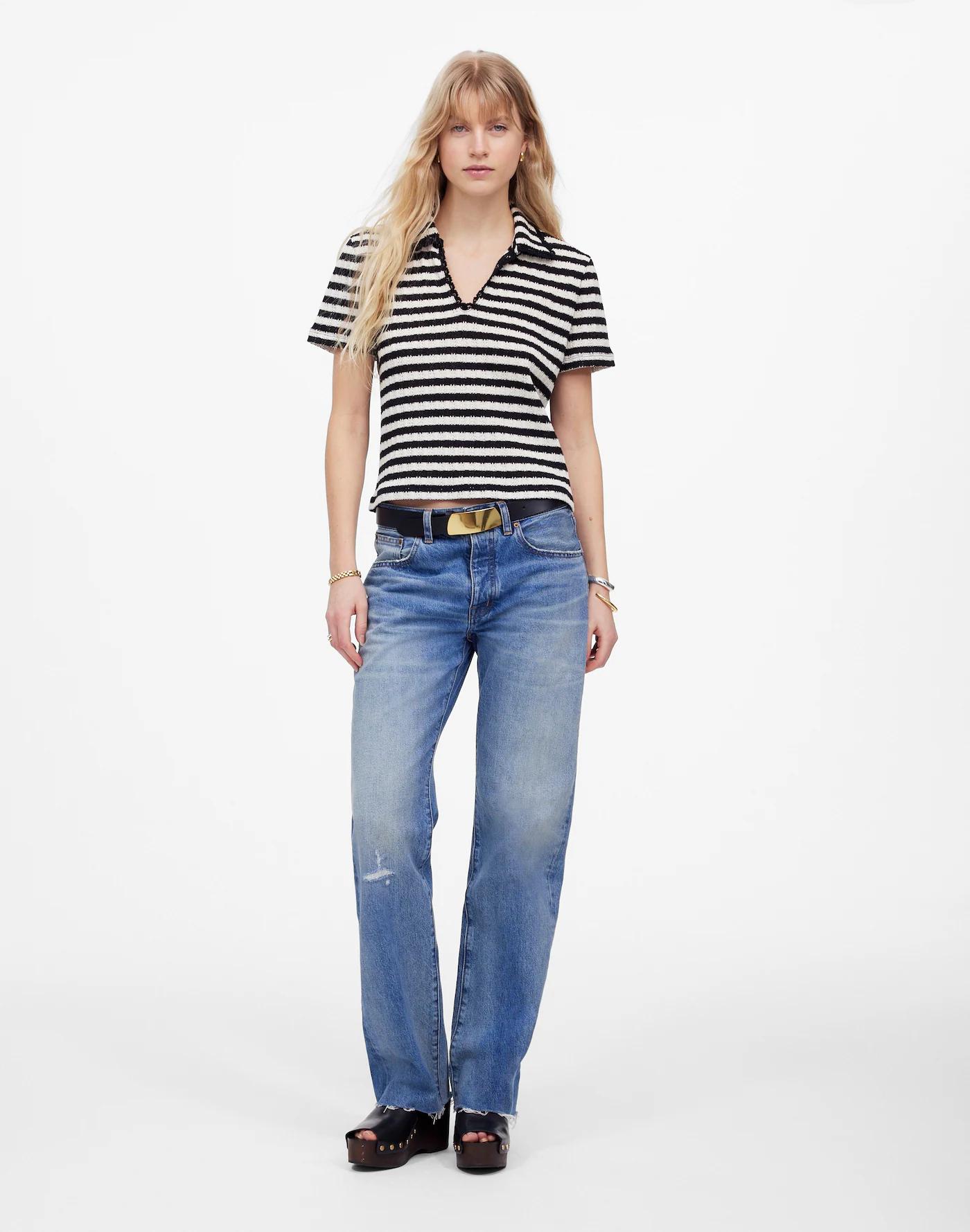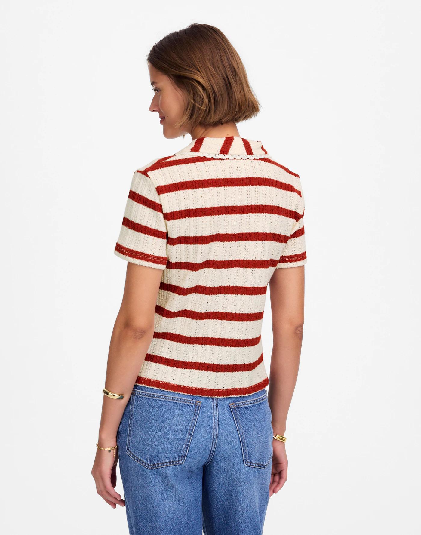 This crochet-knit V-neck sweater tee brings a modern twist to a vintage-inspired design. With classic stripes and intricate embroidered details, it's perfect for spring days when you want to feel effortlessly put together.