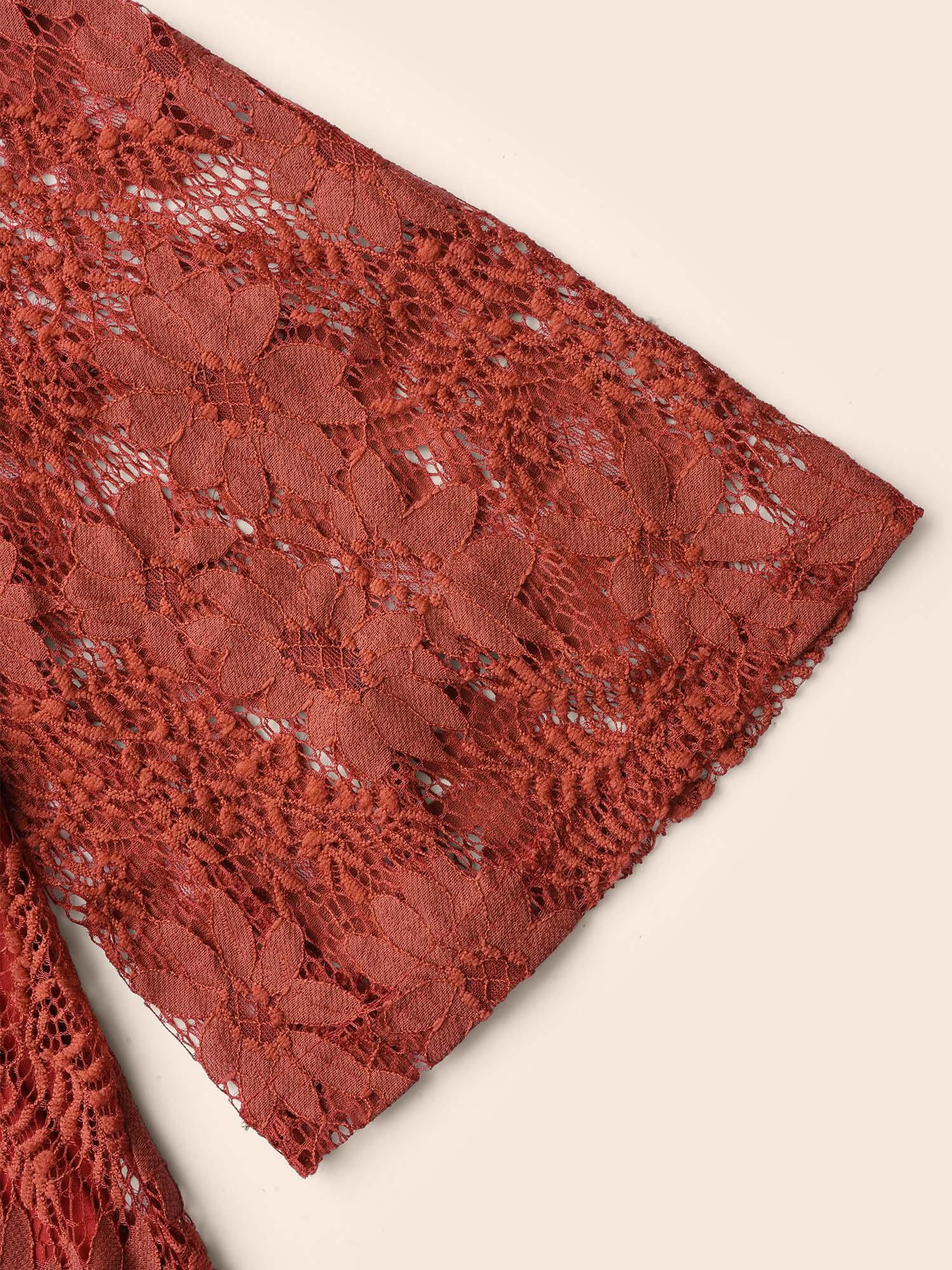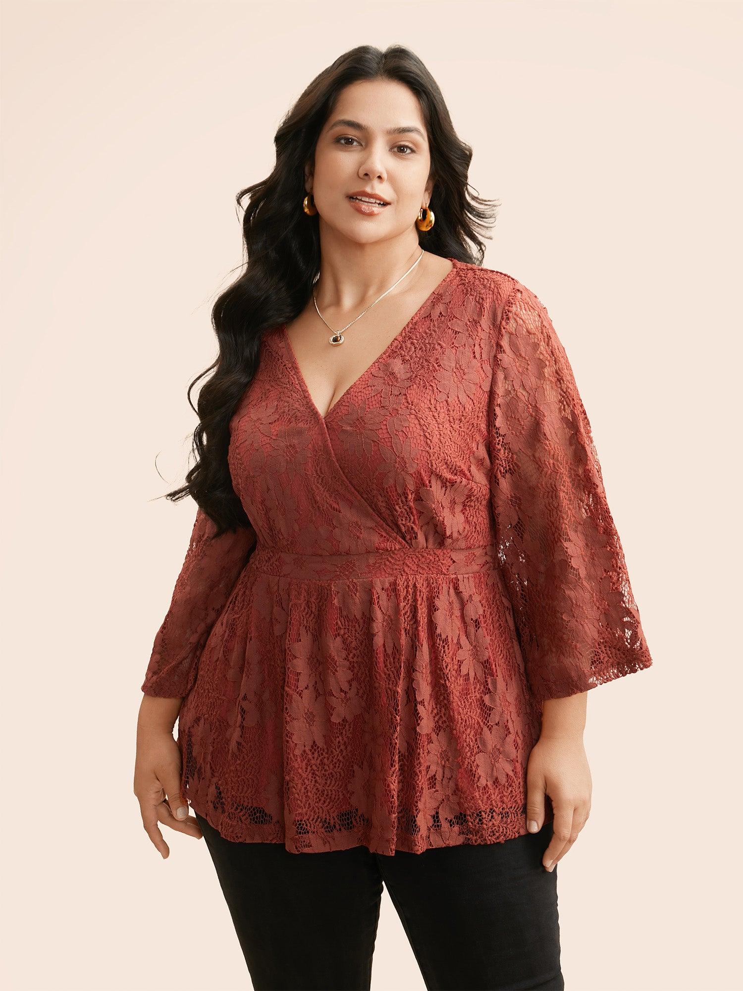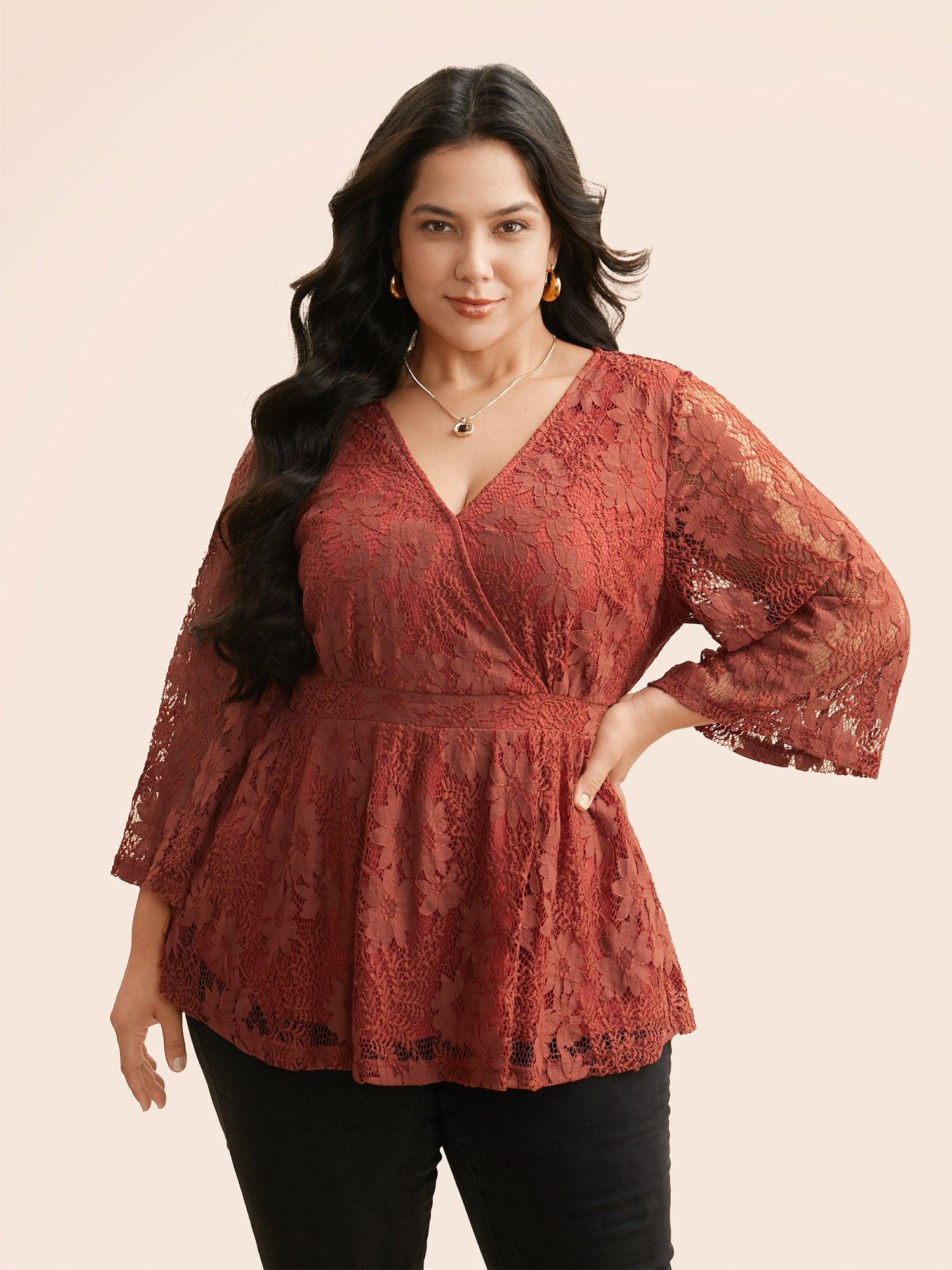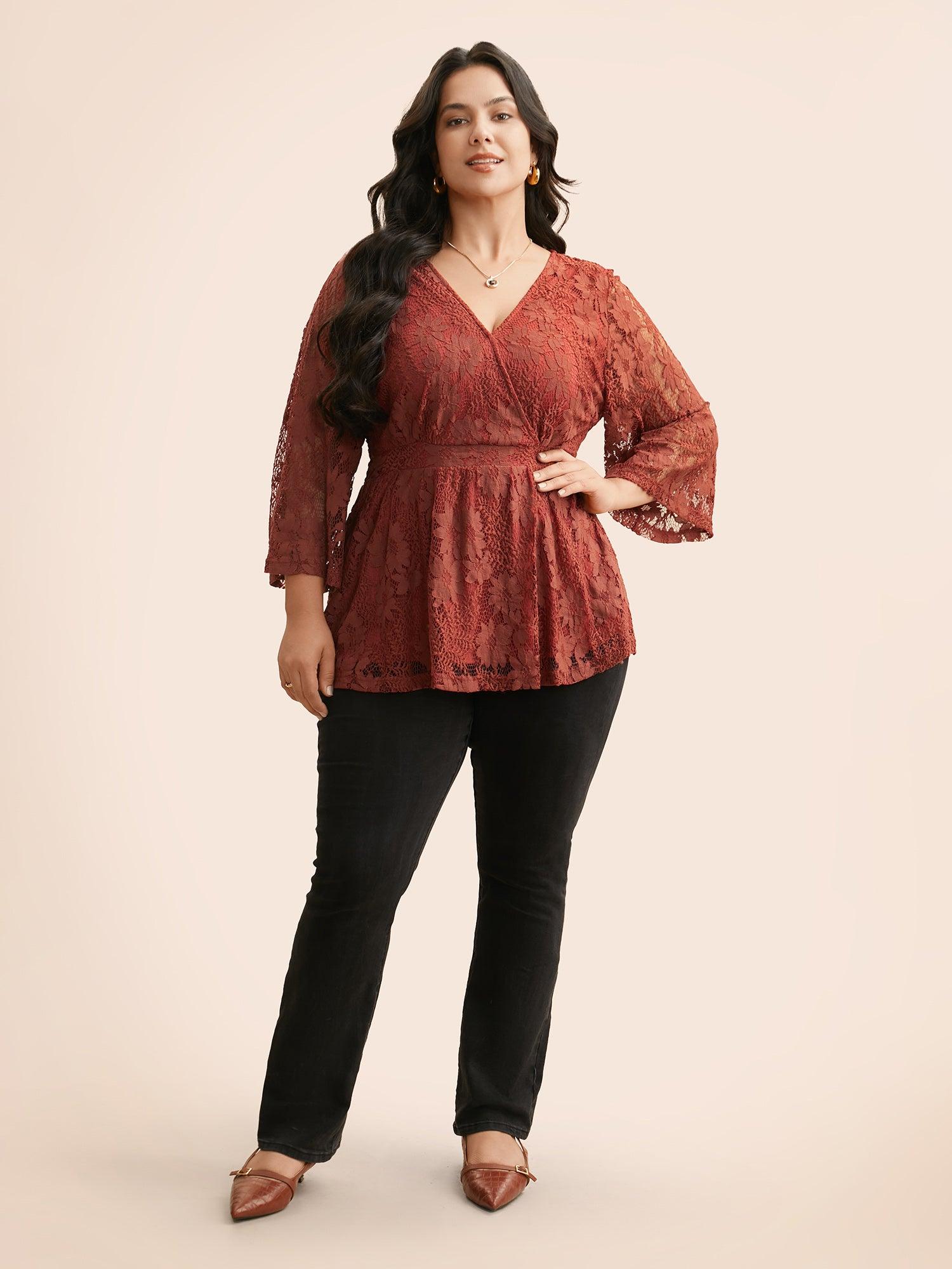 Shop Crochet Lace Mesh Bell Sleeve Blouse now and redefine your style with confidence at BloomChic. Tailored for mid and plus-size women. This trendy Tops Women, sizes 10-30. Season:Winter;Color:Russet;Style:Elegant;Prints:Non;Neckline:Overlap Collar;Sleeve Type:Bell Sleeve;Details:Overlapping, See through, Gathered;Pocket:No-pocket