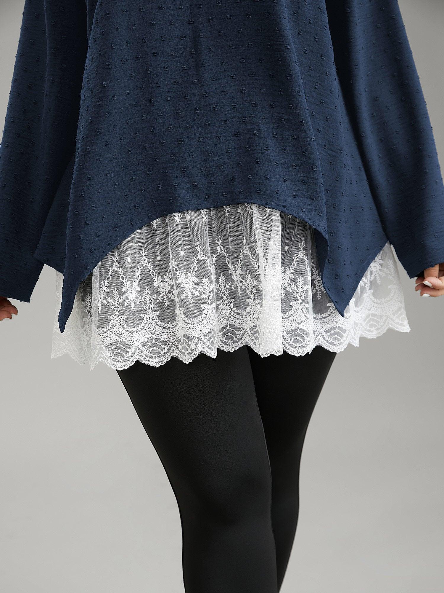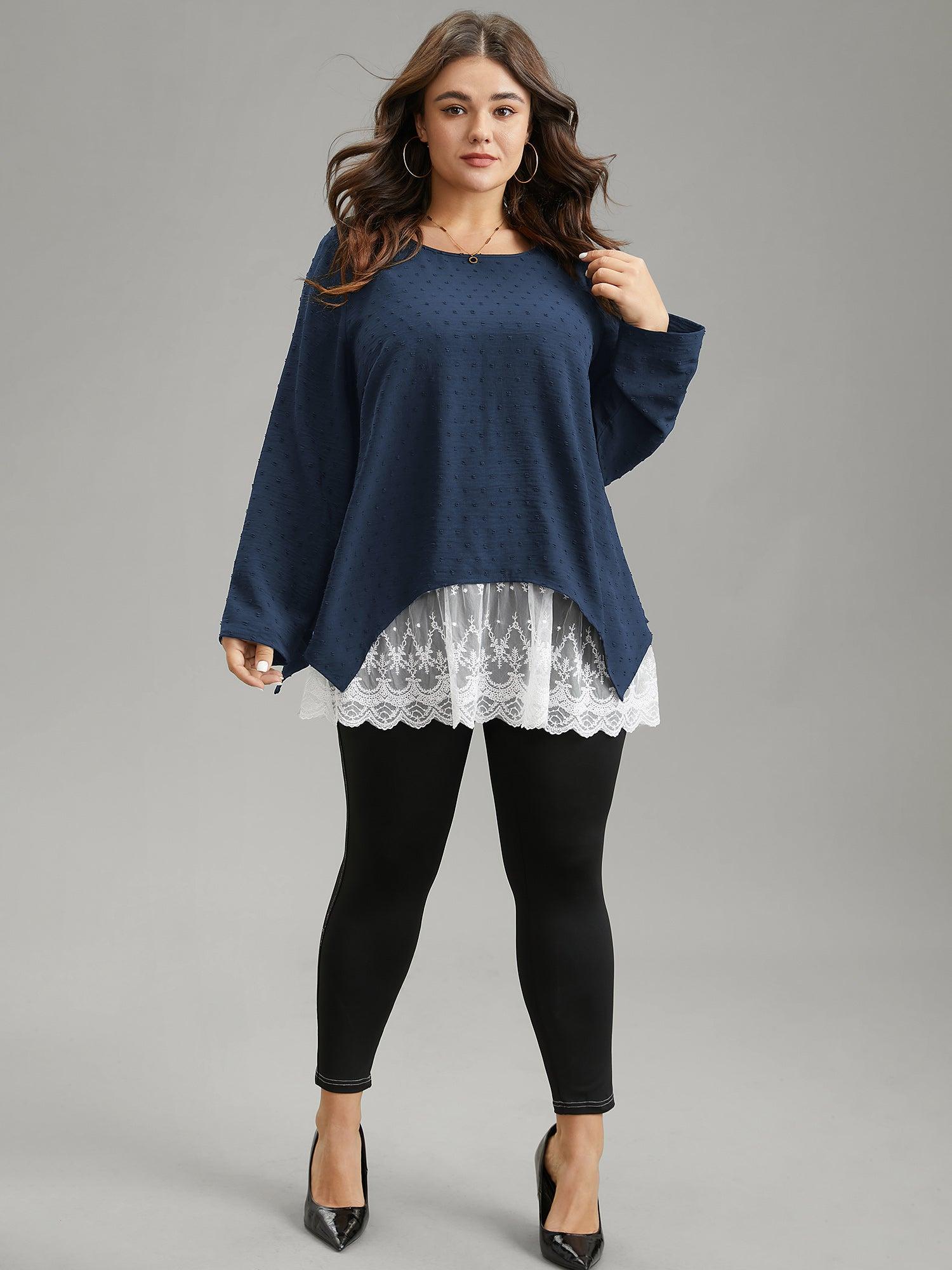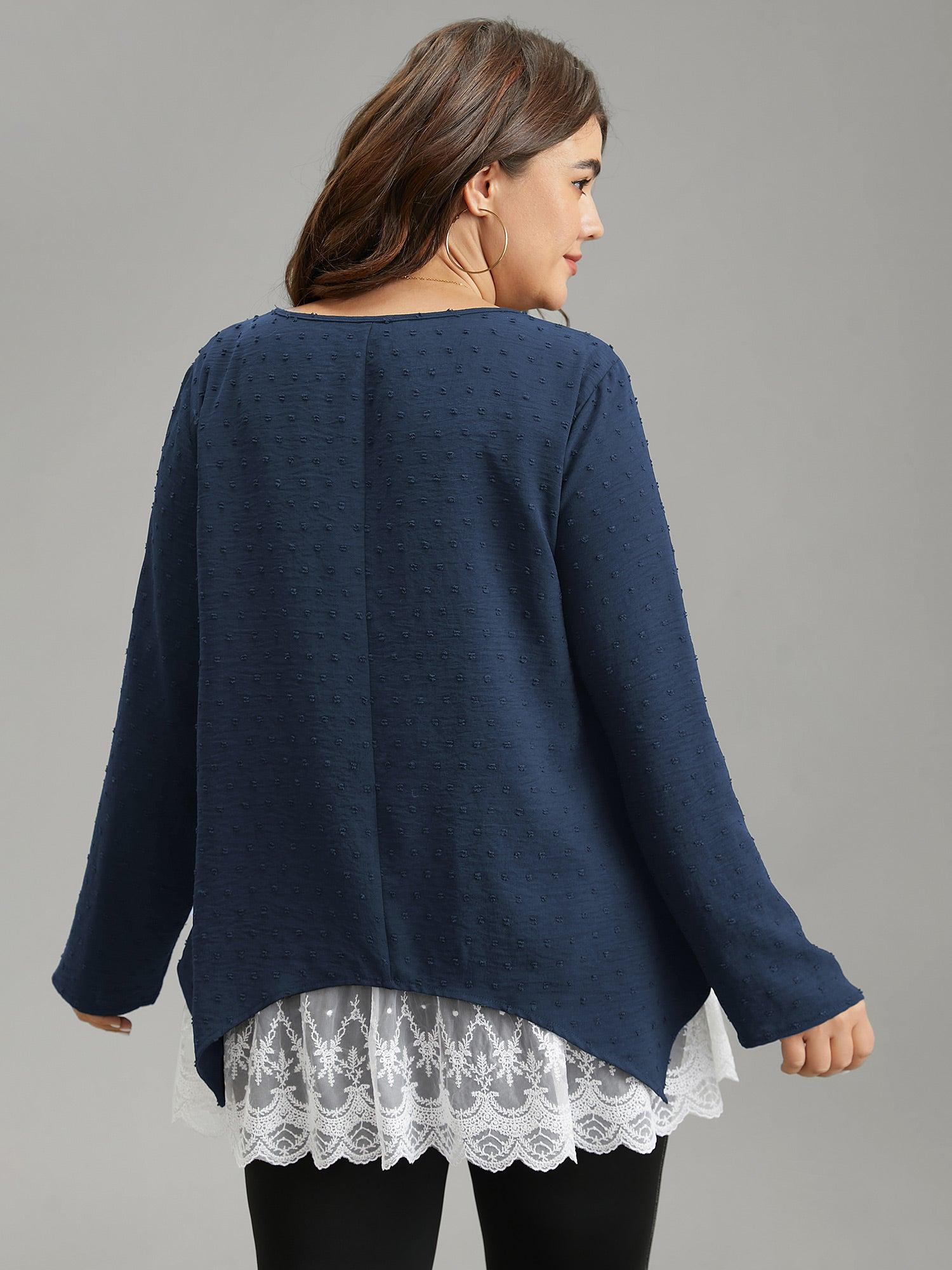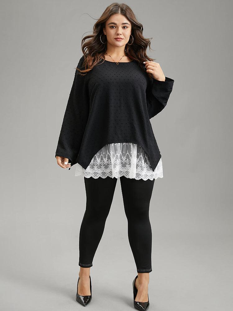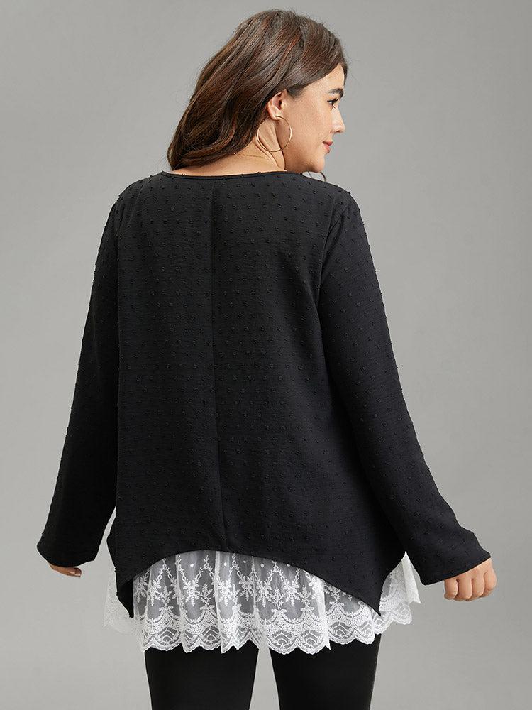 Shop Crochet Lace Mesh Polka Dot Asymmetrical Hem Blouse now and redefine your style with confidence at BloomChic. Tailored for mid and plus-size women. This trendy Tops Women, sizes 10-30. Color:Black;Pattern Type:Patchwork;Neckline:Round Neck;Sleeve Type:Regular Sleeve;Details:Asymmetrical, Lace, Patchwork, Contrast, Texture;Pocket:No-pocket