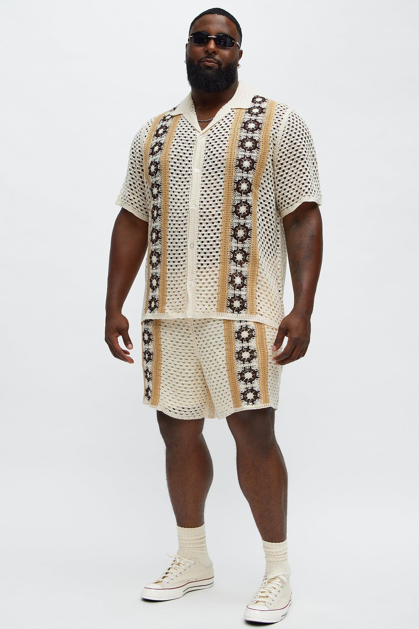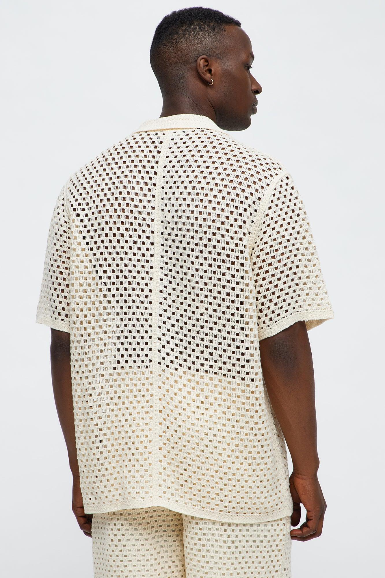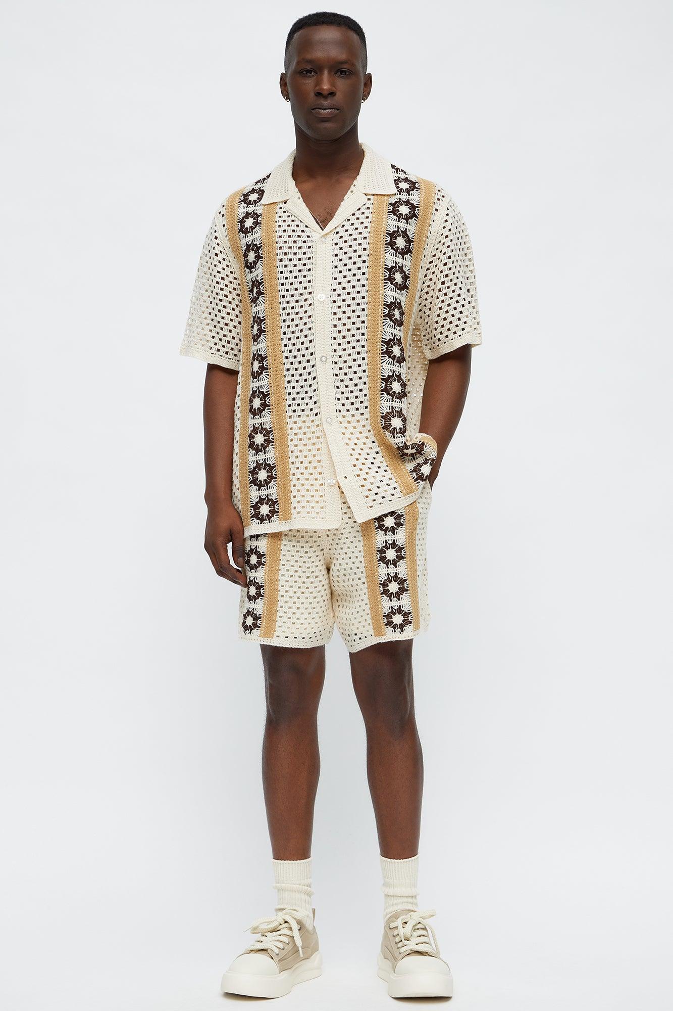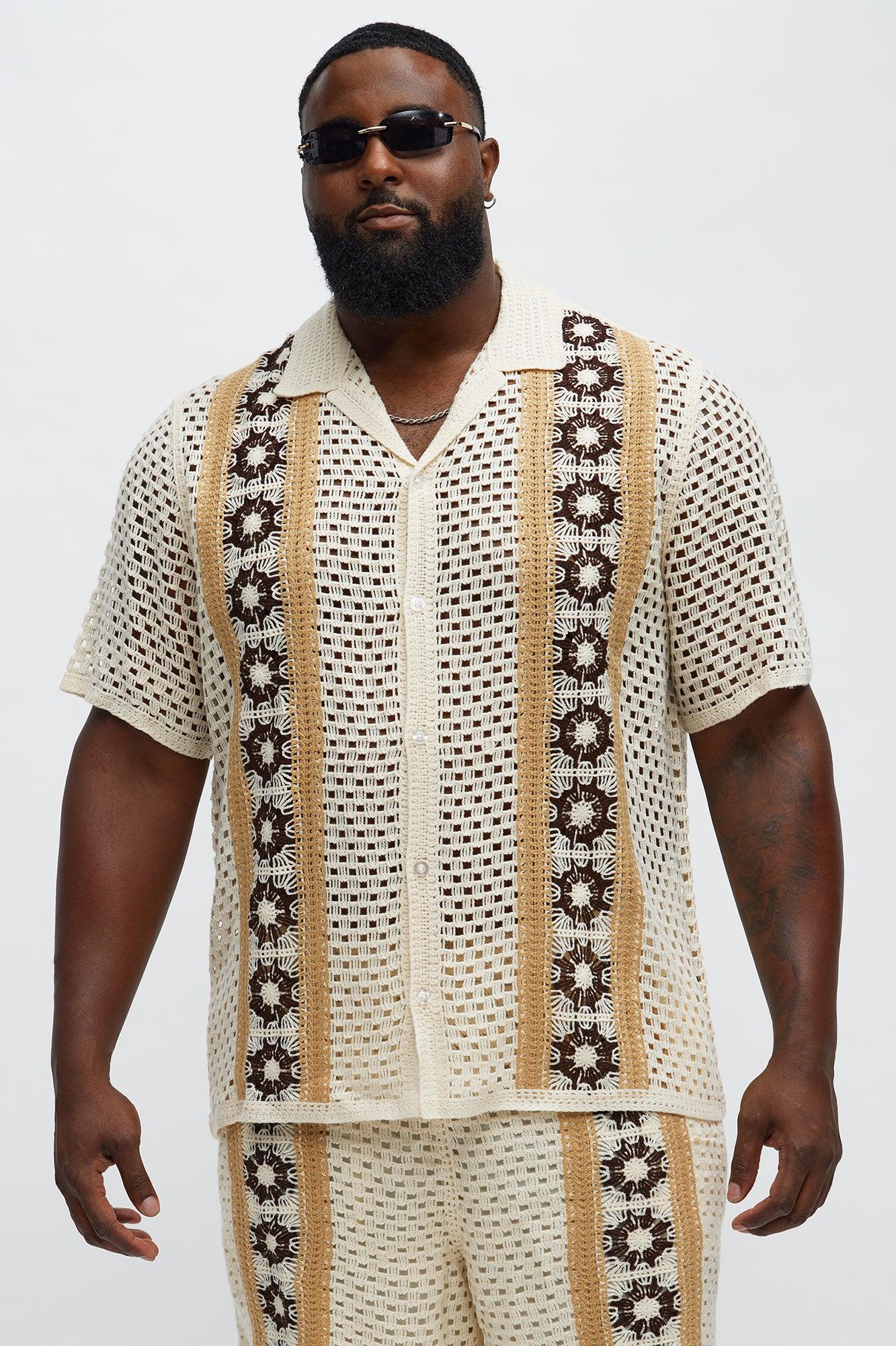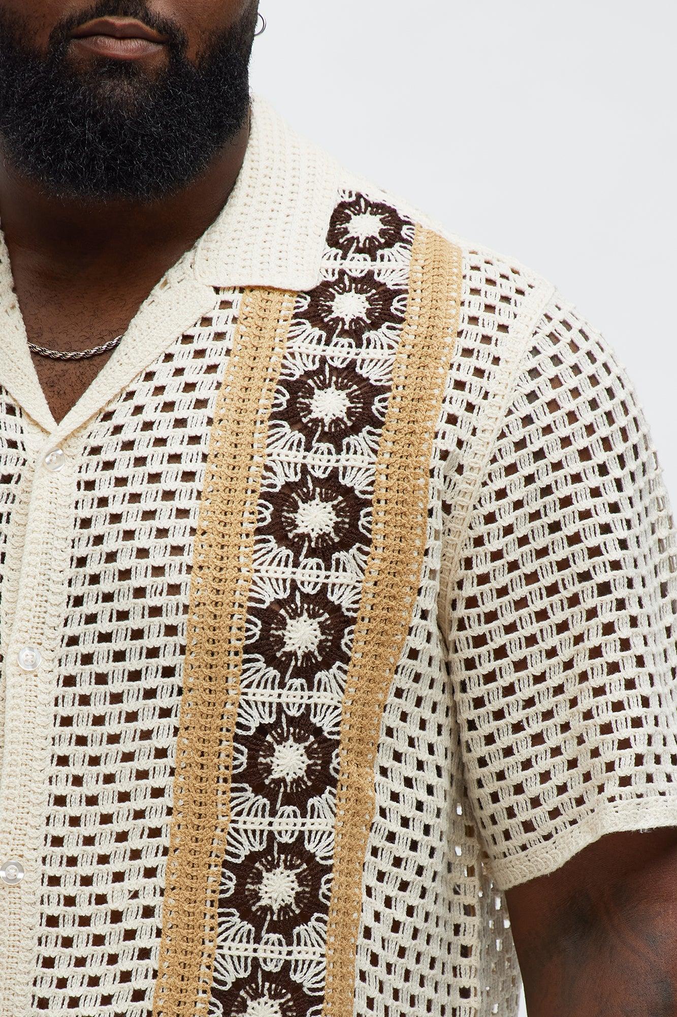 Crochet Panel Cuban Collar Button Up Shirt - Cream/combo