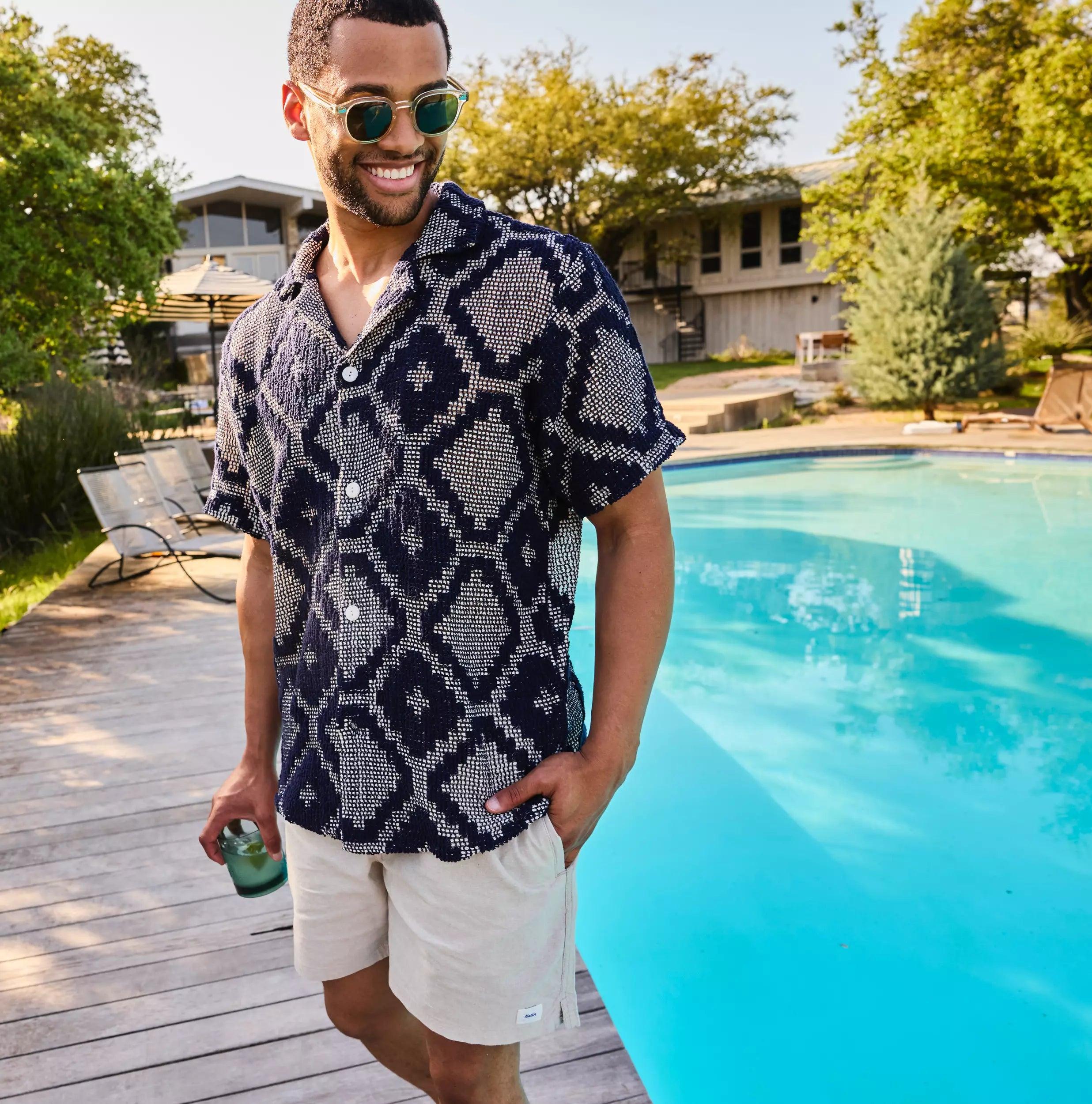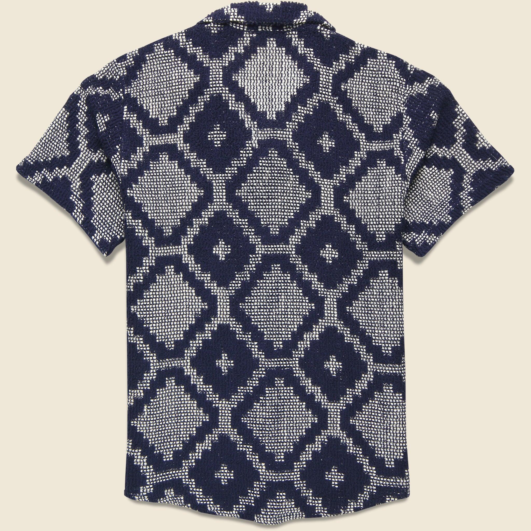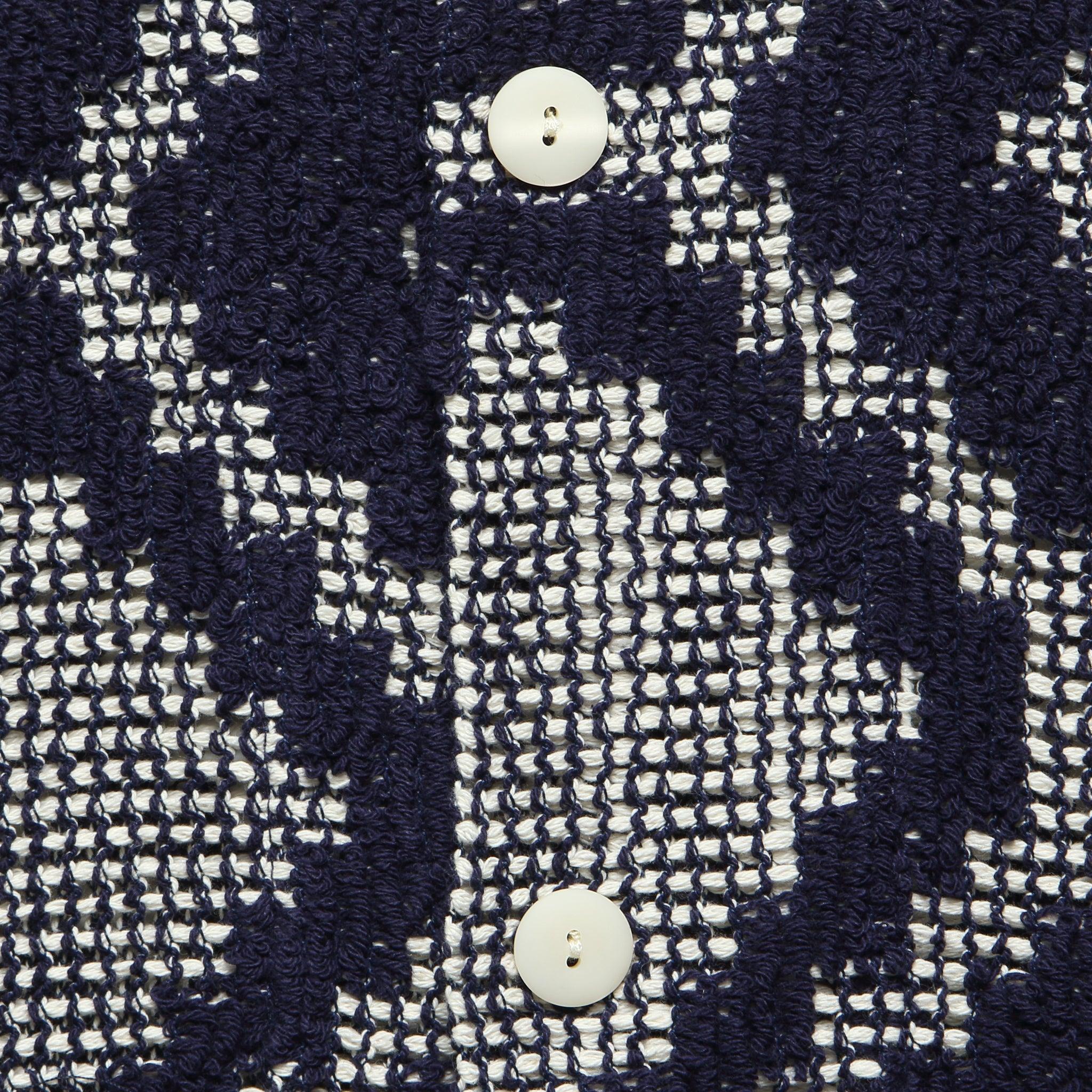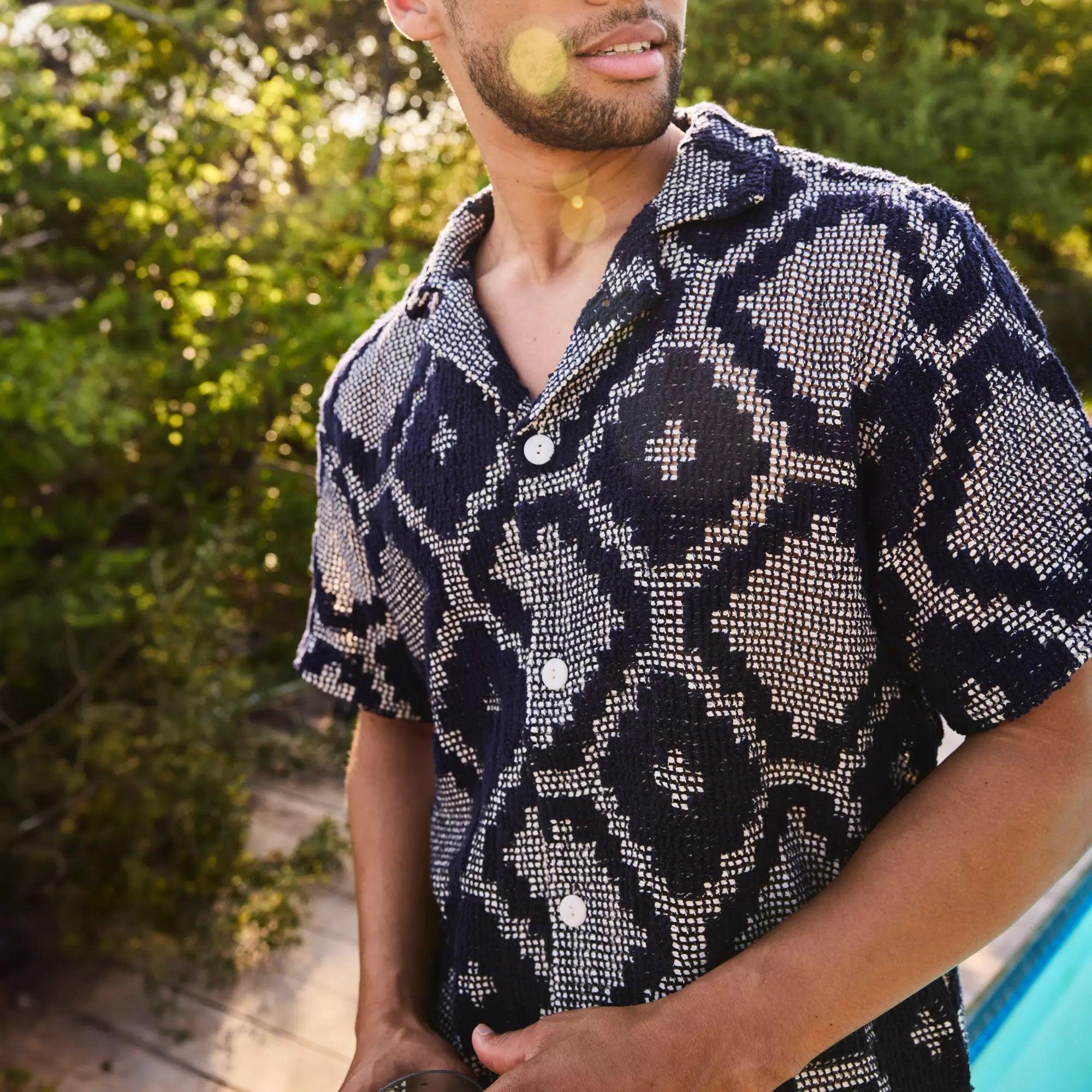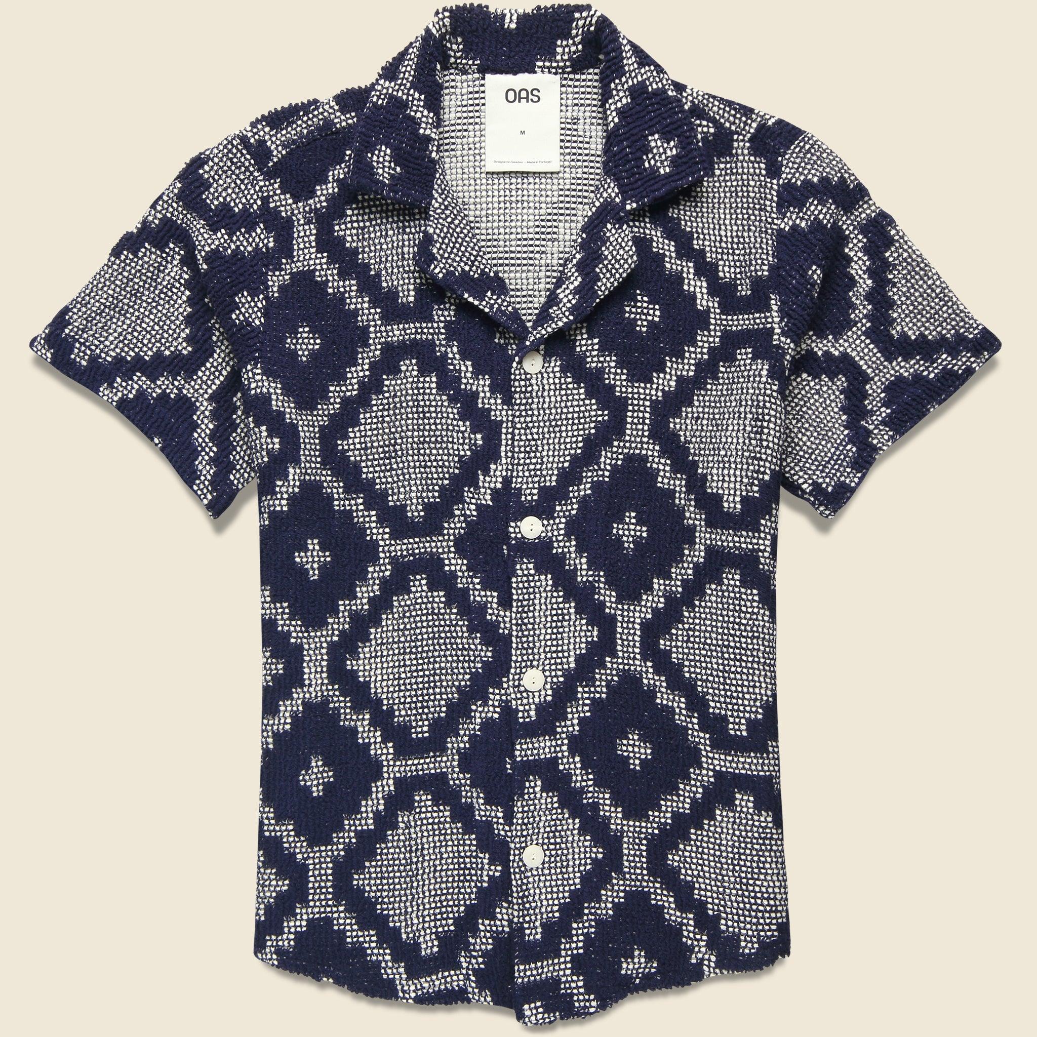This Crochet Terry Shirt from OAS is made with a soft, midweight cotton-poly blend that’s woven with a two-toned, textured jacquard pattern inspired by classic mosaic motifs. It’s tailored with a traditional fit that runs true to size and comes with a simple, four-button placket, an open camp collar, and a slightly curved hem to round things out. Soft, midweight cotton blend Two-tone, textured jacquard pattern Simple 4-button placket Open camp collar Slightly curved hem Traditional fit that runs true to size We recommend taking your normal size Made in Portugal Materials: 90% cotton, 10% polyester The following measurements are for size Medium: Chest: 42” | Shoulder: 17 ½” | Sleeve: 18” | Length: 29 ½”