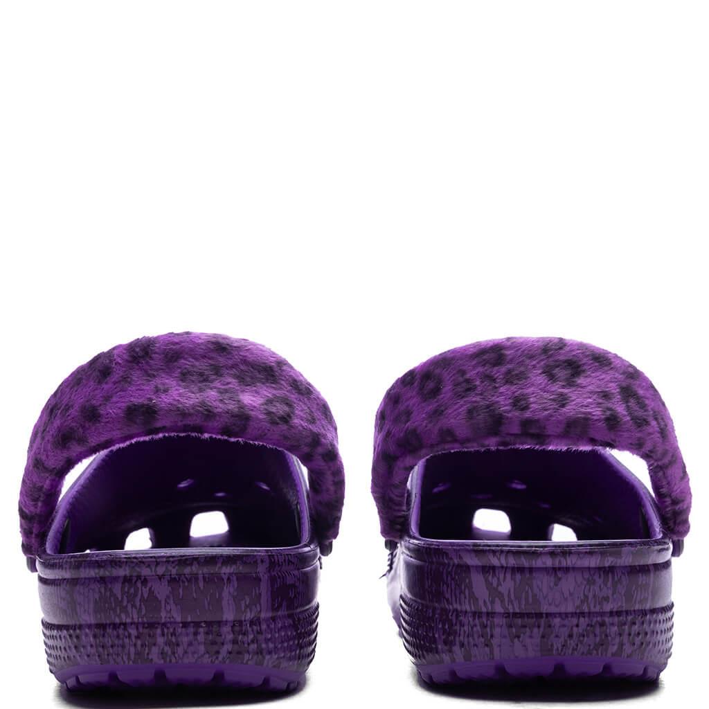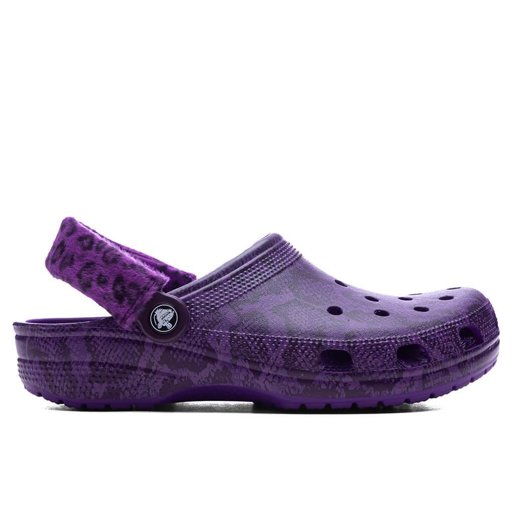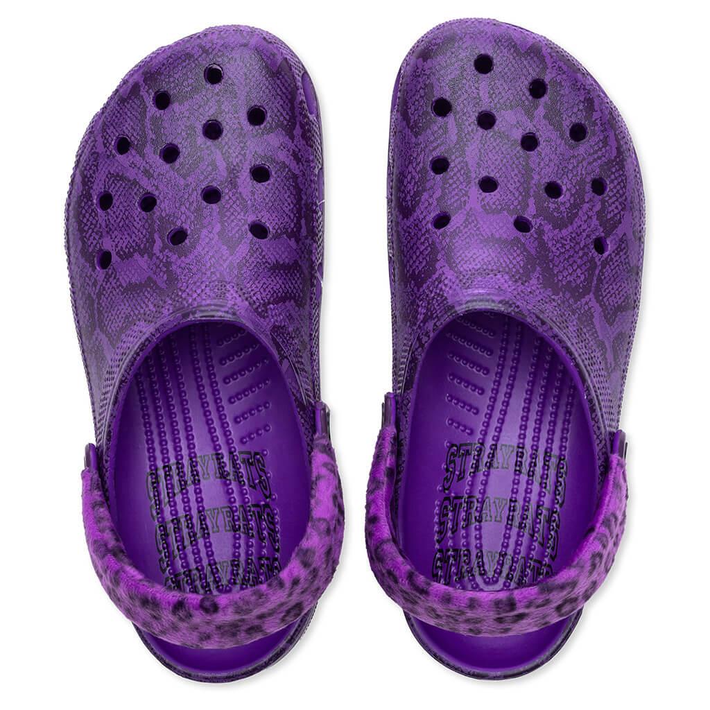 Crocs and Stray Rats come together to create their iteration on the Classic Clog. Featuring a rubber upper, this design combines natural textures with Crocs' signature comfort. Stray Rats branding and a functional heel strap with a leopard print design and furry texture adds familiar touches to this unique collaboration, blending utility and style effortlessly. Rubber upper Stray Rats x Crocs branding Furry heel strap Style No: 211083-506