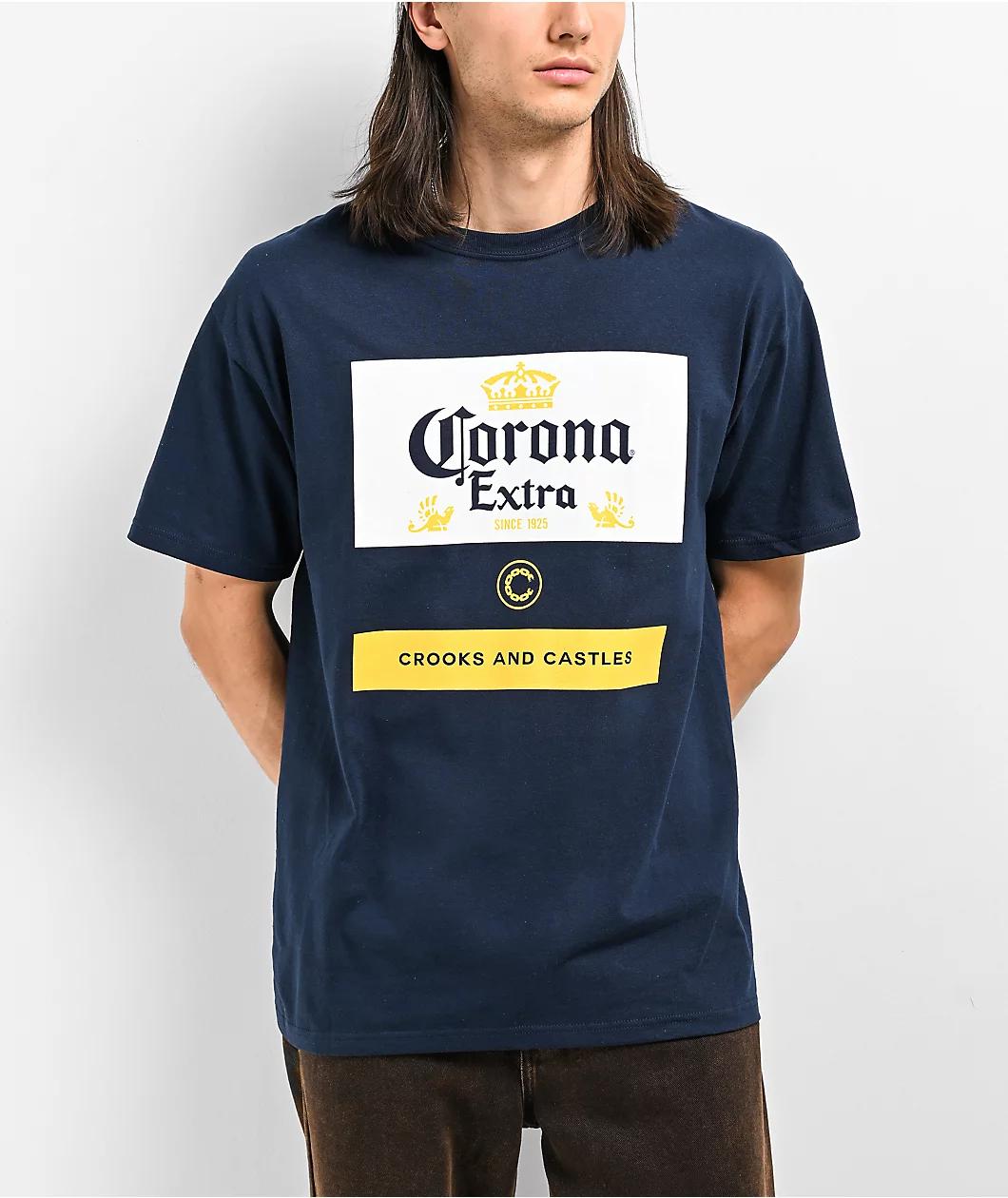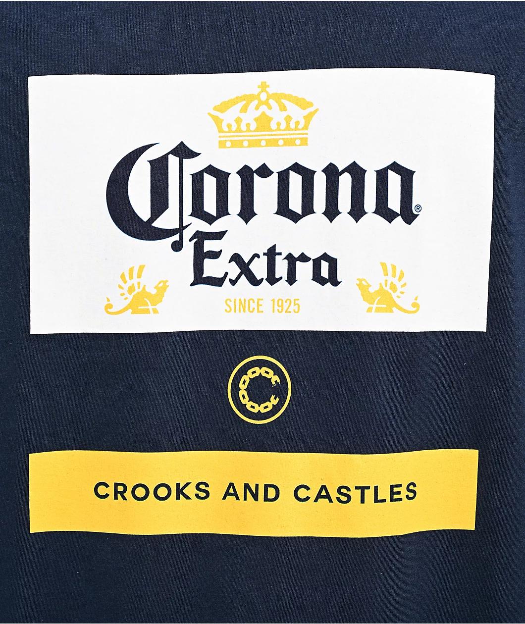 Featuring a navy blue colorway, the Klepto t-shirt arrives as a collaboration between Crooks & Castles and Corona Brewing. Highlighting a screen-printed graphic on the front, the tee displays iconic Corona branding underlined by a vibrant yellow rect