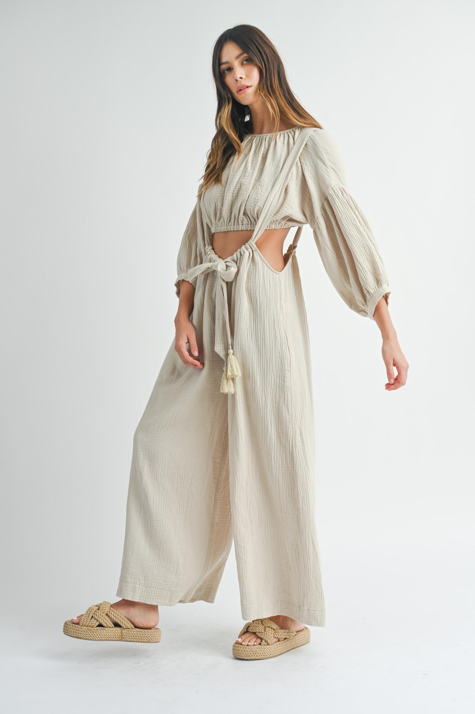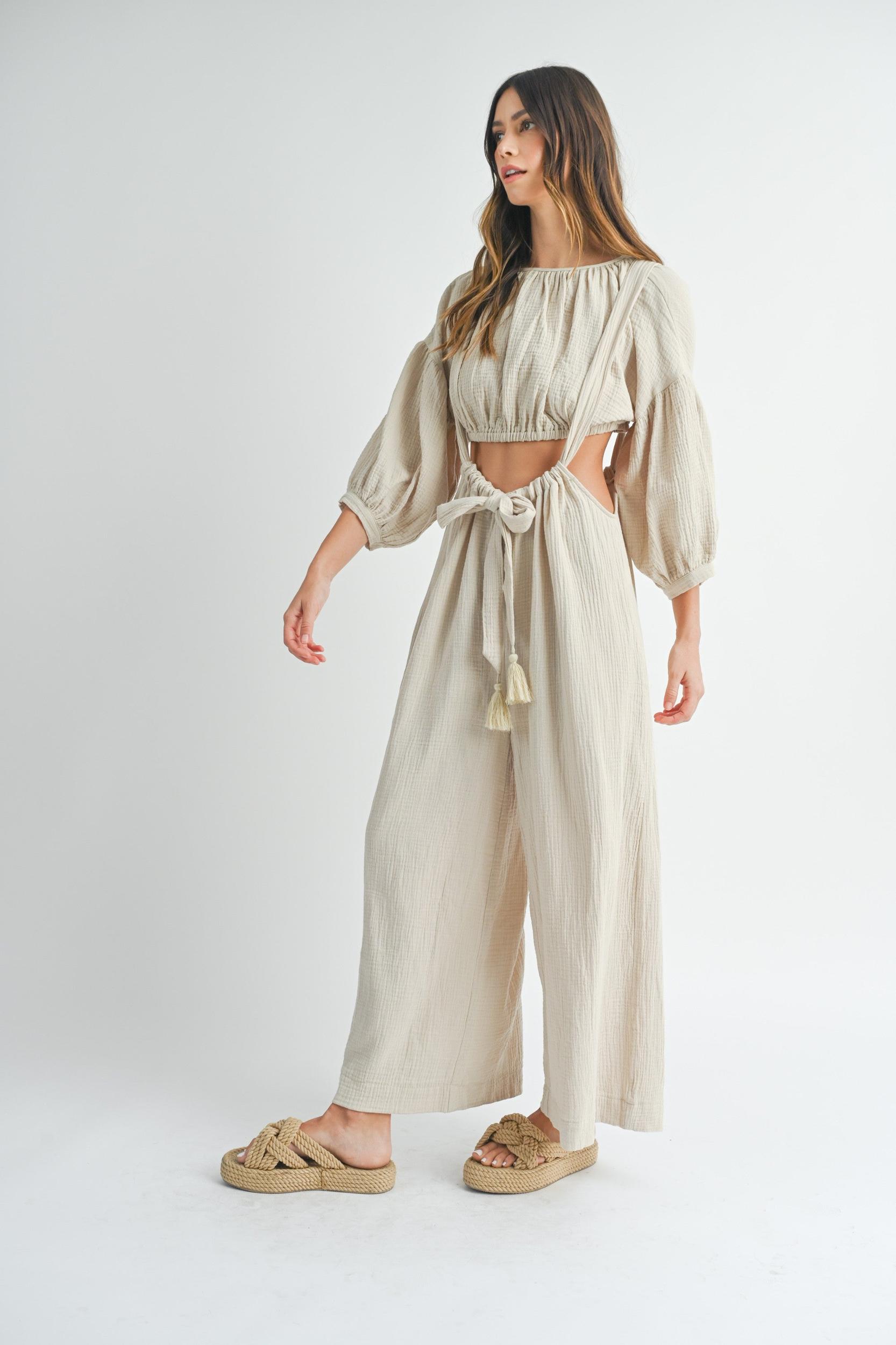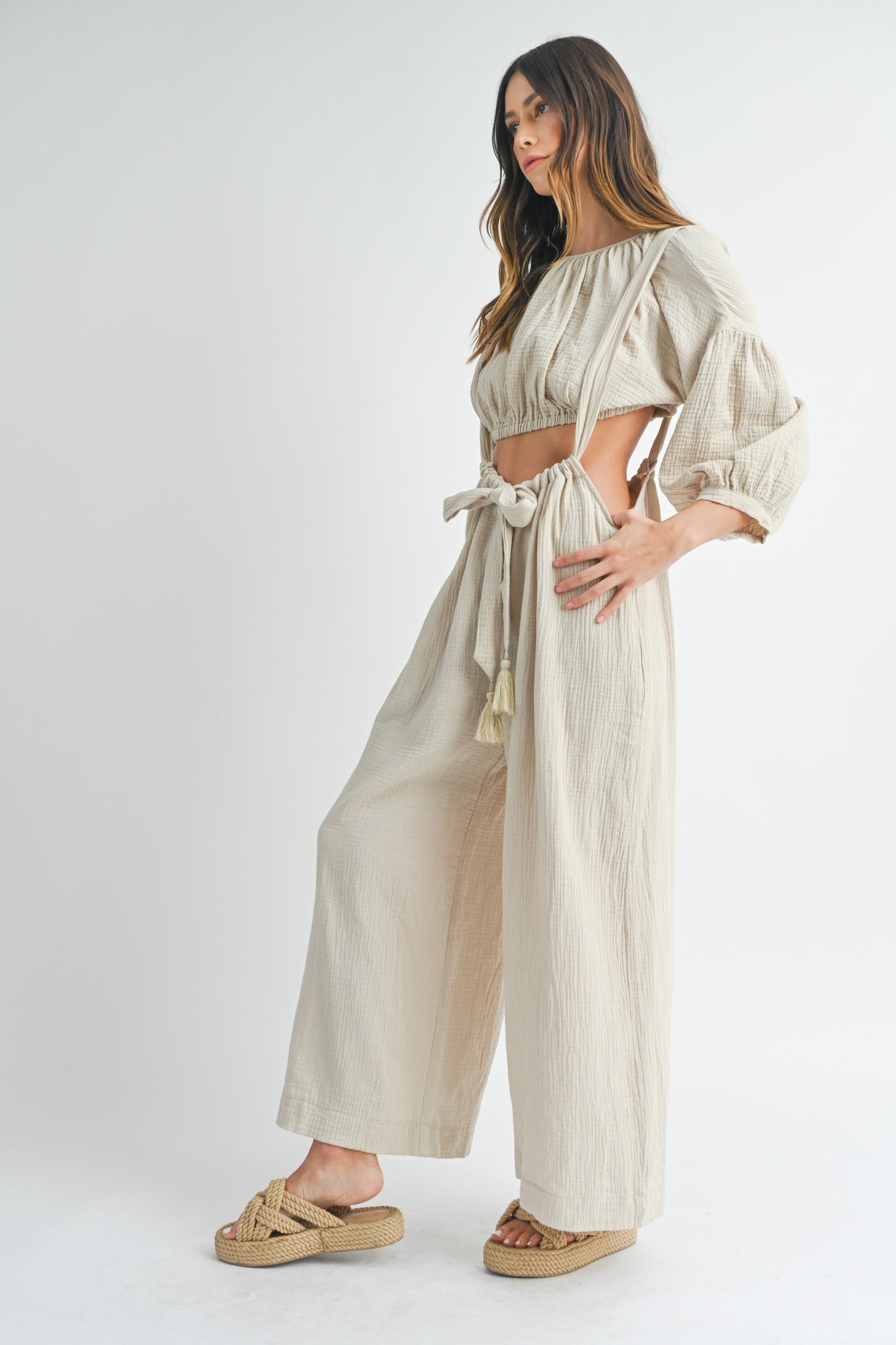 Introducing our Wrinkle Gauze Crop Top and Loose Pants Set, featuring a 3/4 puff sleeve design and drawstring overall style. Made with wrinkle-resistant fabric for easy care and a relaxed baggy fit for all-day comfort. Elevate your wardrobe with this versatile and stylish set.
