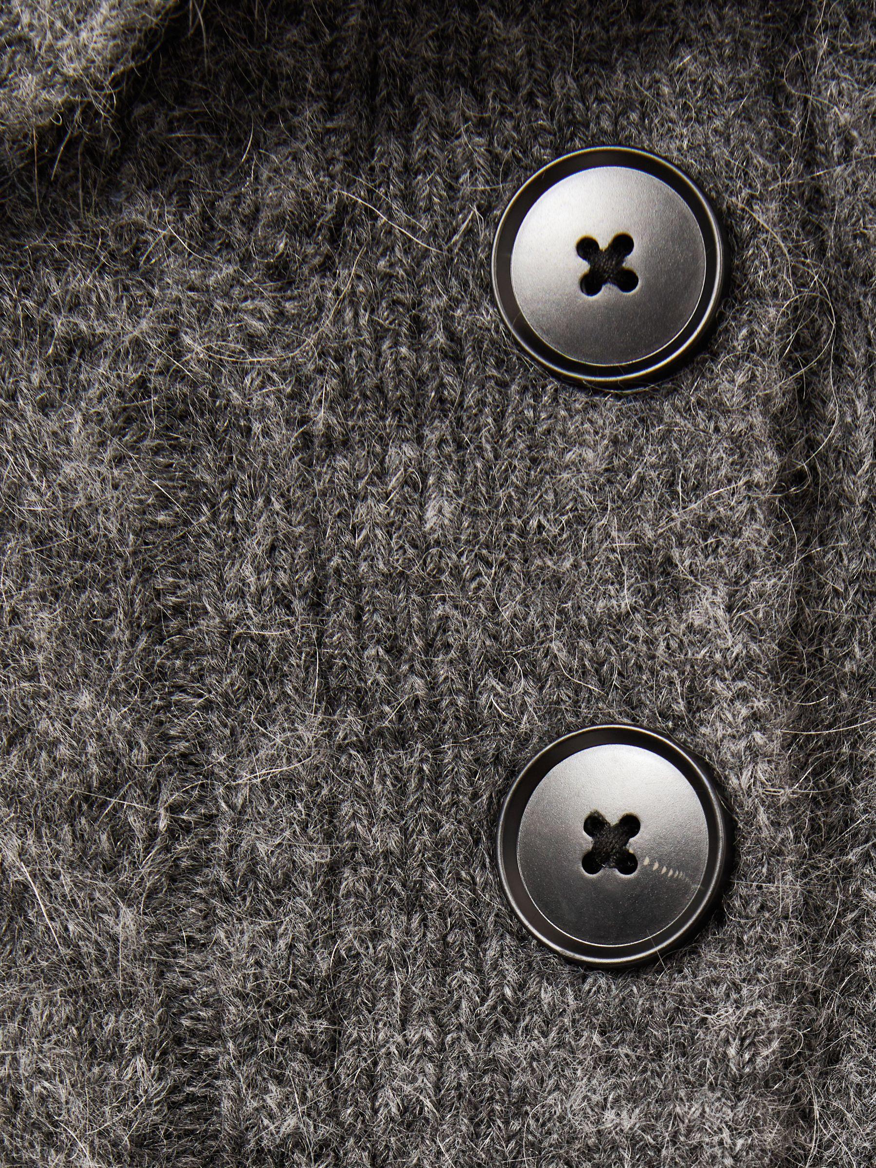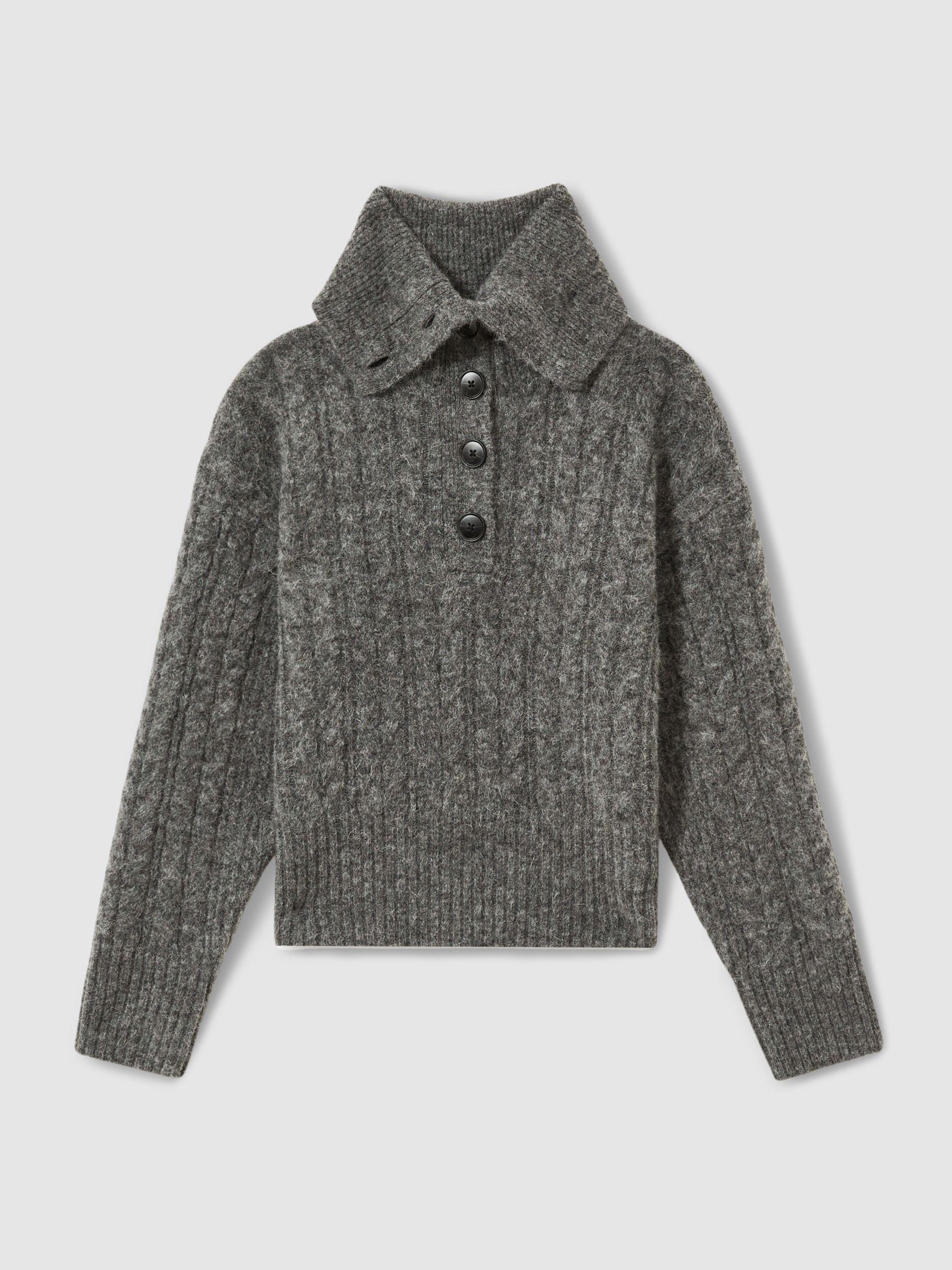 The Etta jumper is crafted from a cosy wool and mohair blend in a classic cable knit. It has a foldover collar with a buttoned placket, and is finished with a ribbed hem and cuffs. Made with wool and mohair Cable knit Foldover collar with button placket Drop shoulders Ribbed hem and cuffs Cropped