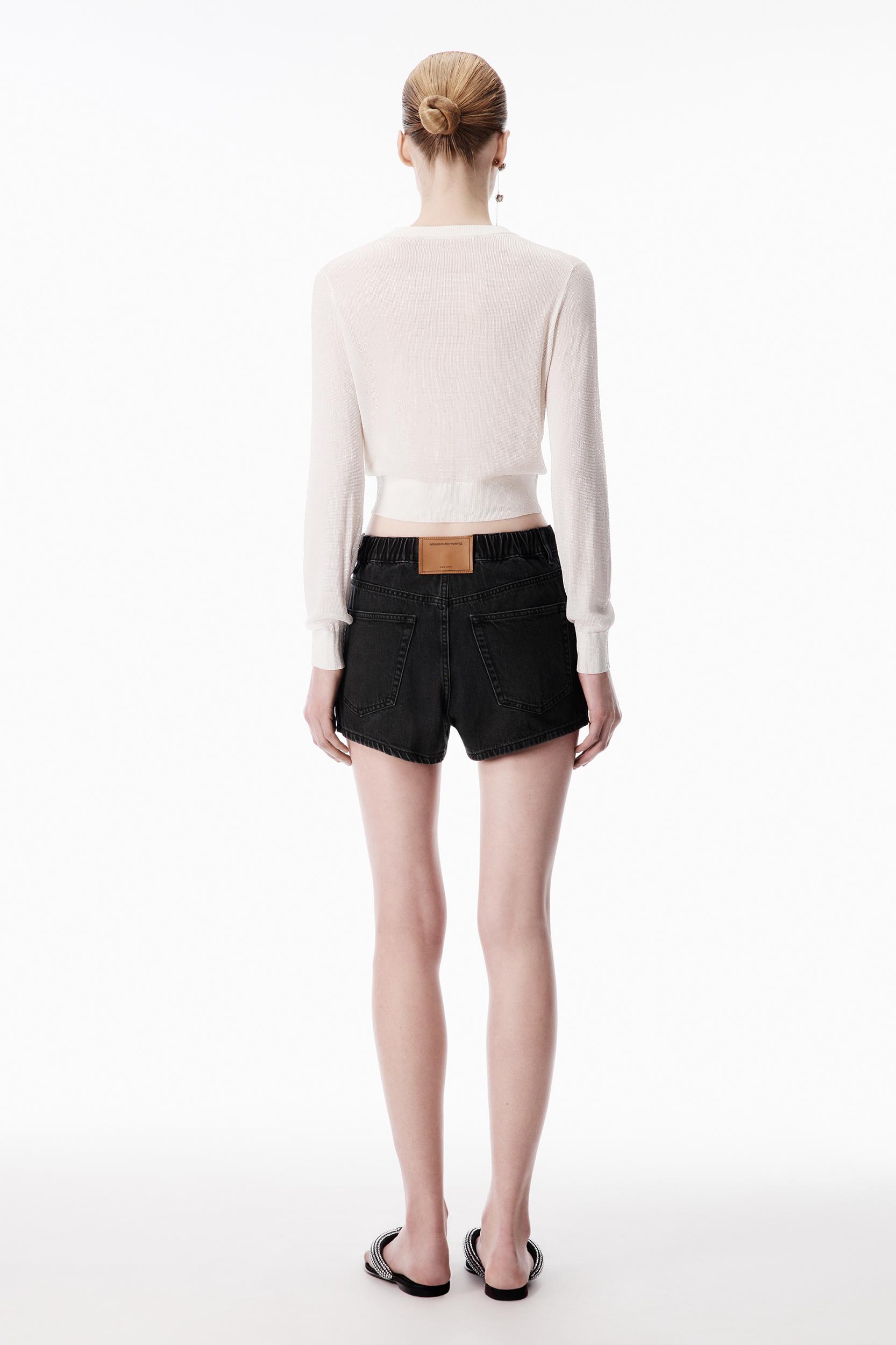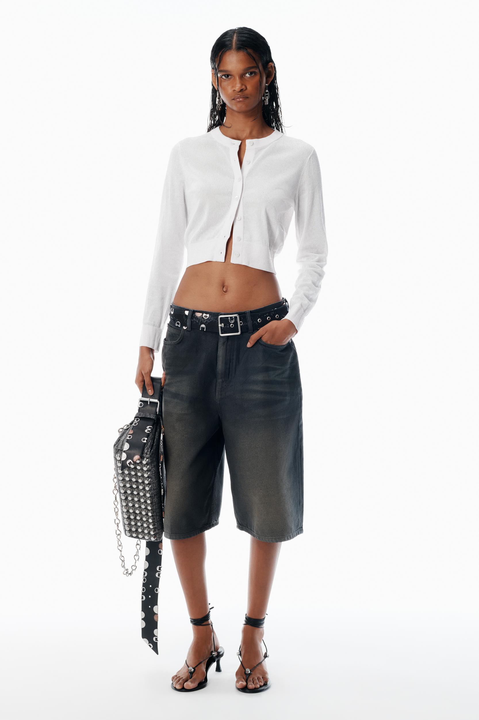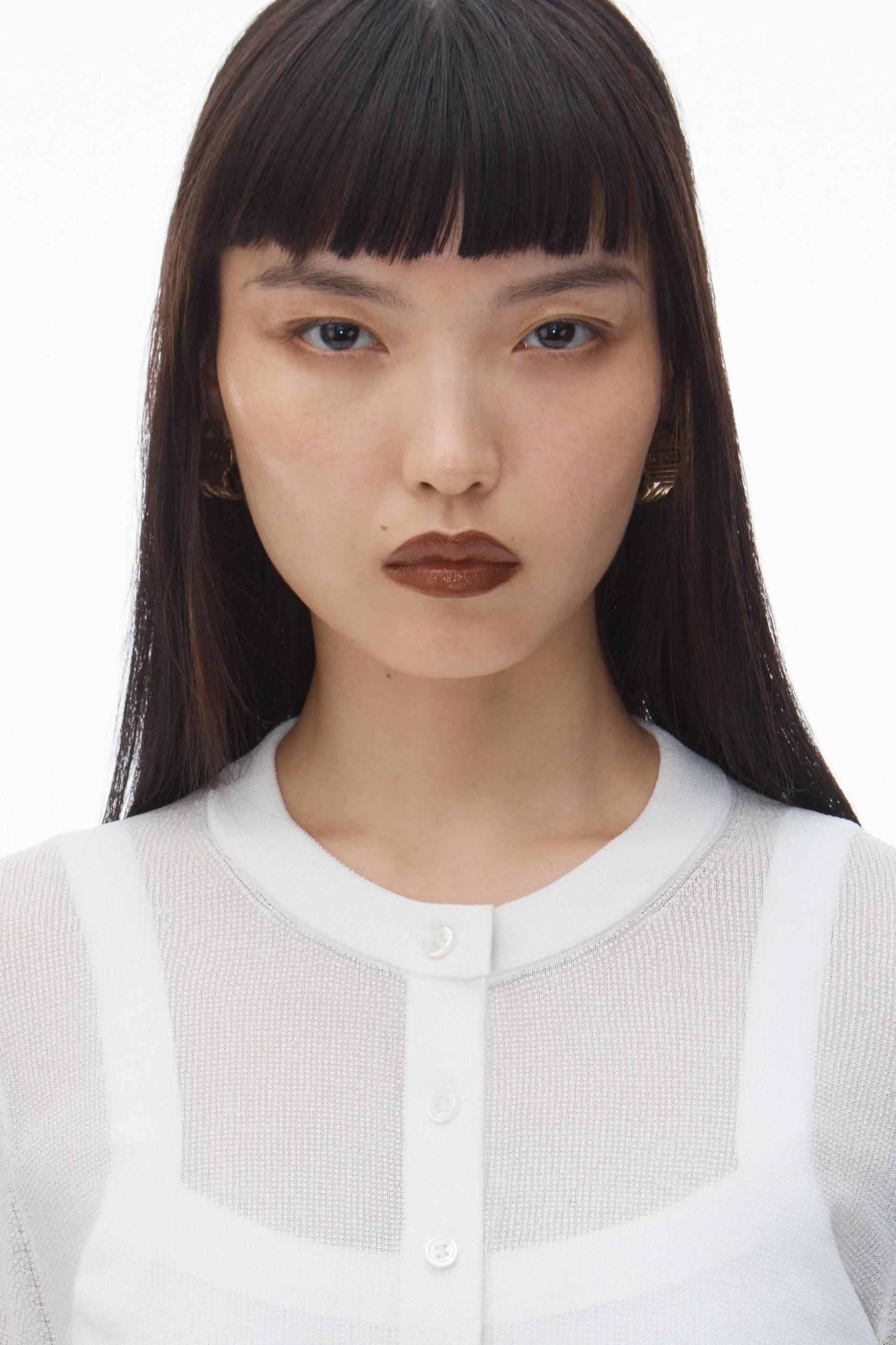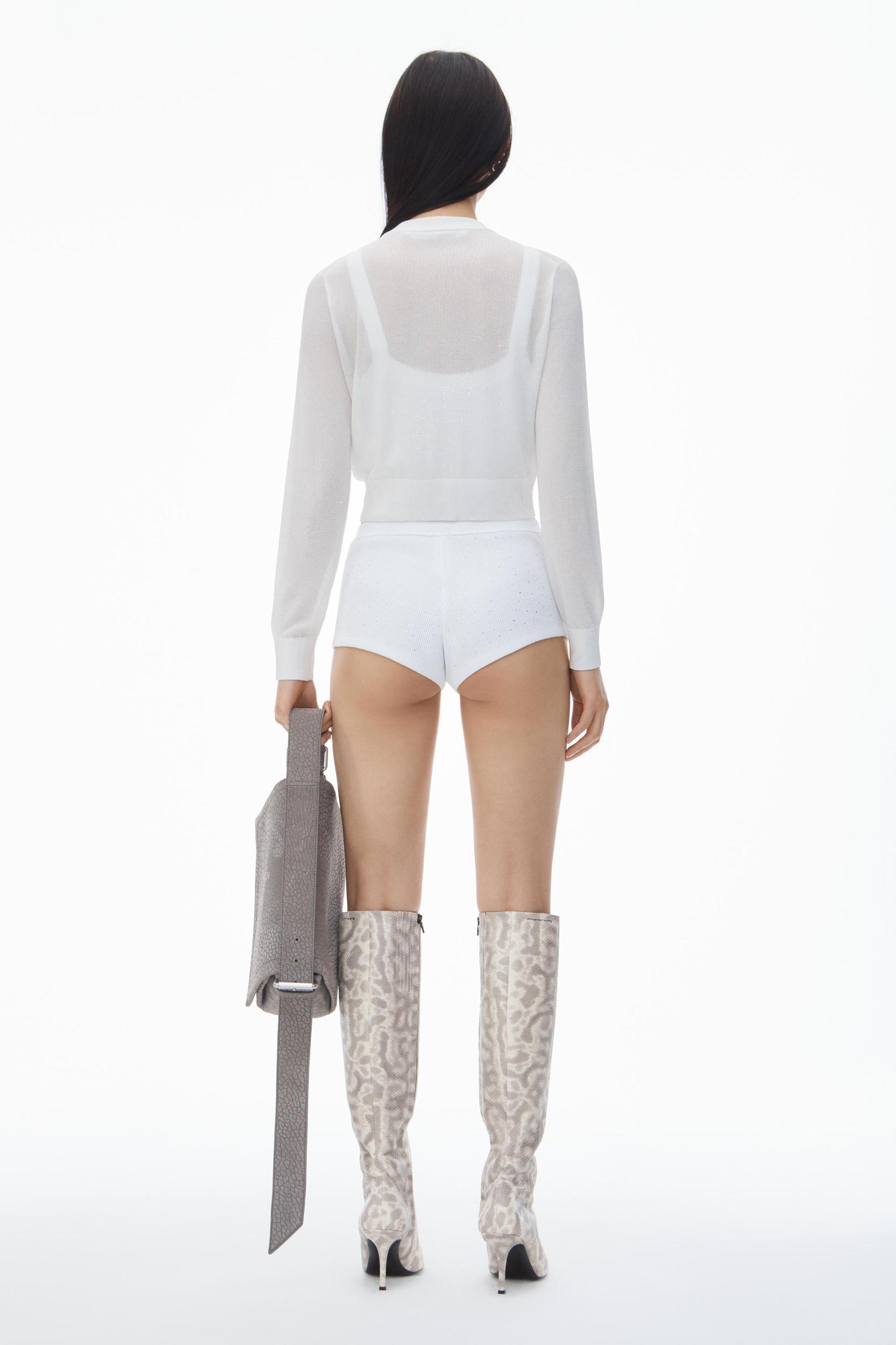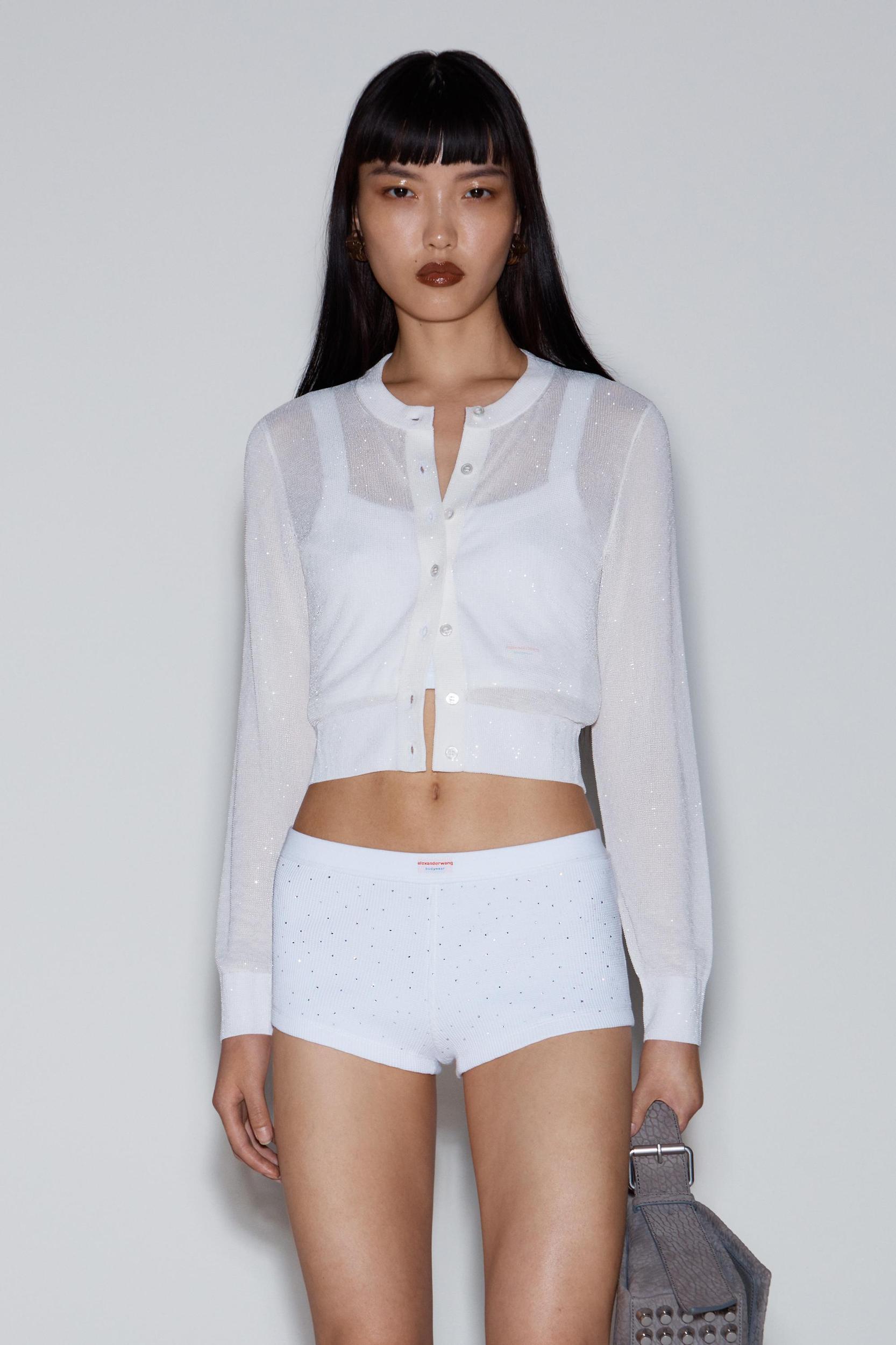 Clear beadhotfix creates a glossy wet look to this cropped cardigan in white. Styled with a crewneck, it is fastented by mother of pearl buttons.