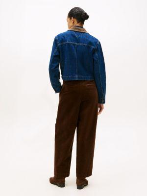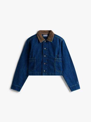 Tommy Hilfiger women's jacket. Our cropped denim chore jacket is made from a cotton-hemp blend known for its durability. The soft corduroy collar, contrast stitching and patch pockets add to the utility feel.