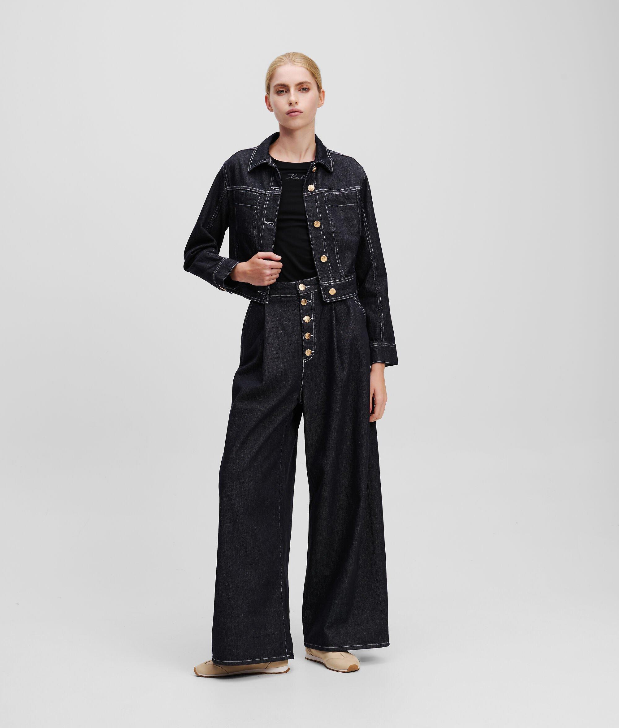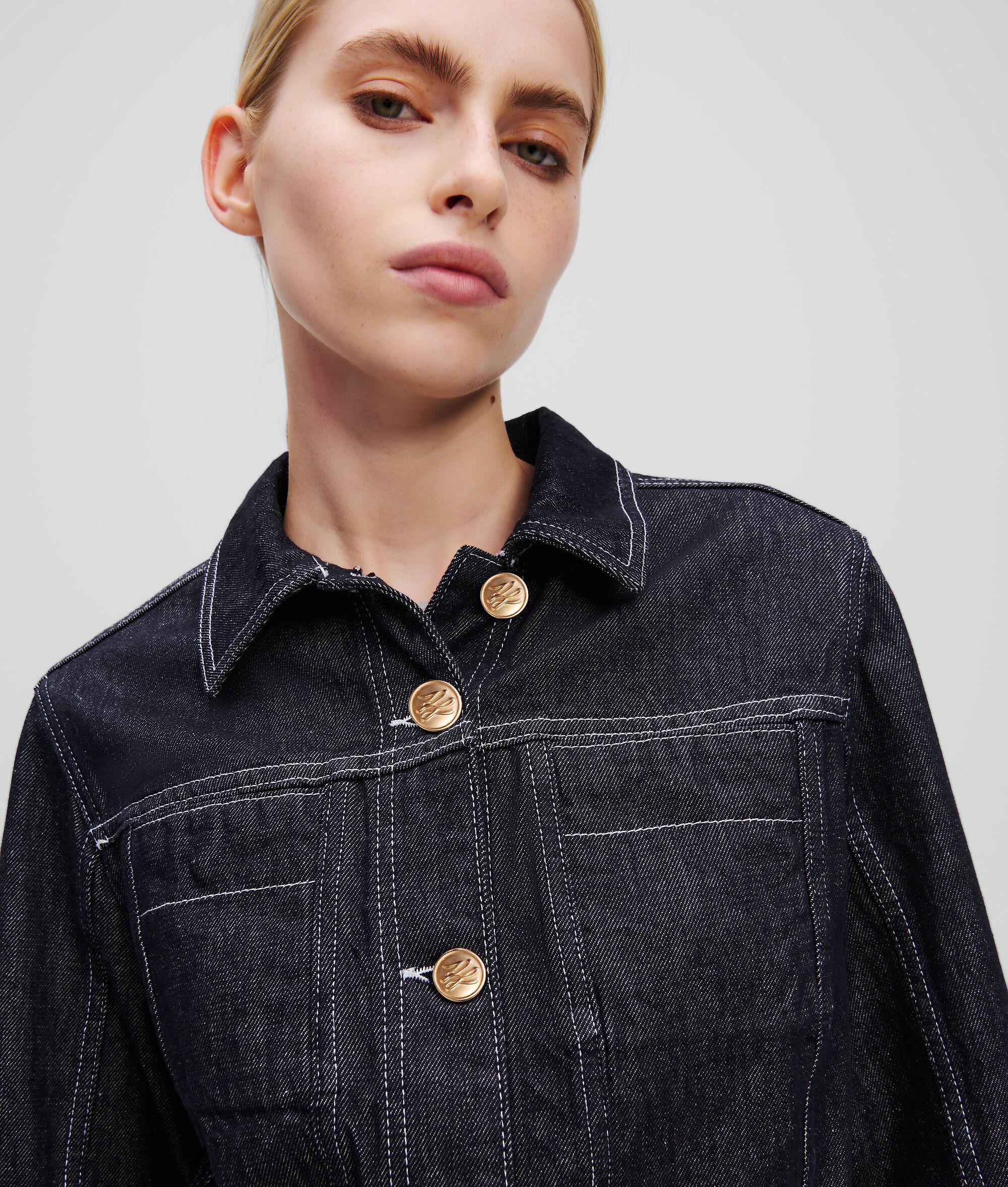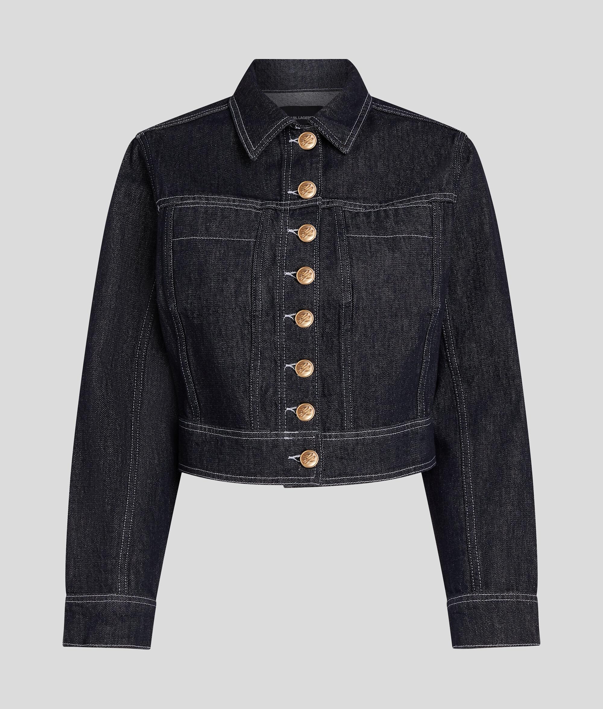 This cropped denim jacket features a slightly tailored silhouette that flatters the figure. Twin chest pockets add practicality, while the cinched waist and cuffed sleeves enhance its appeal. KARL Autograph buttons lend a distinctive touch, making it a standout piece for any wardrobe.