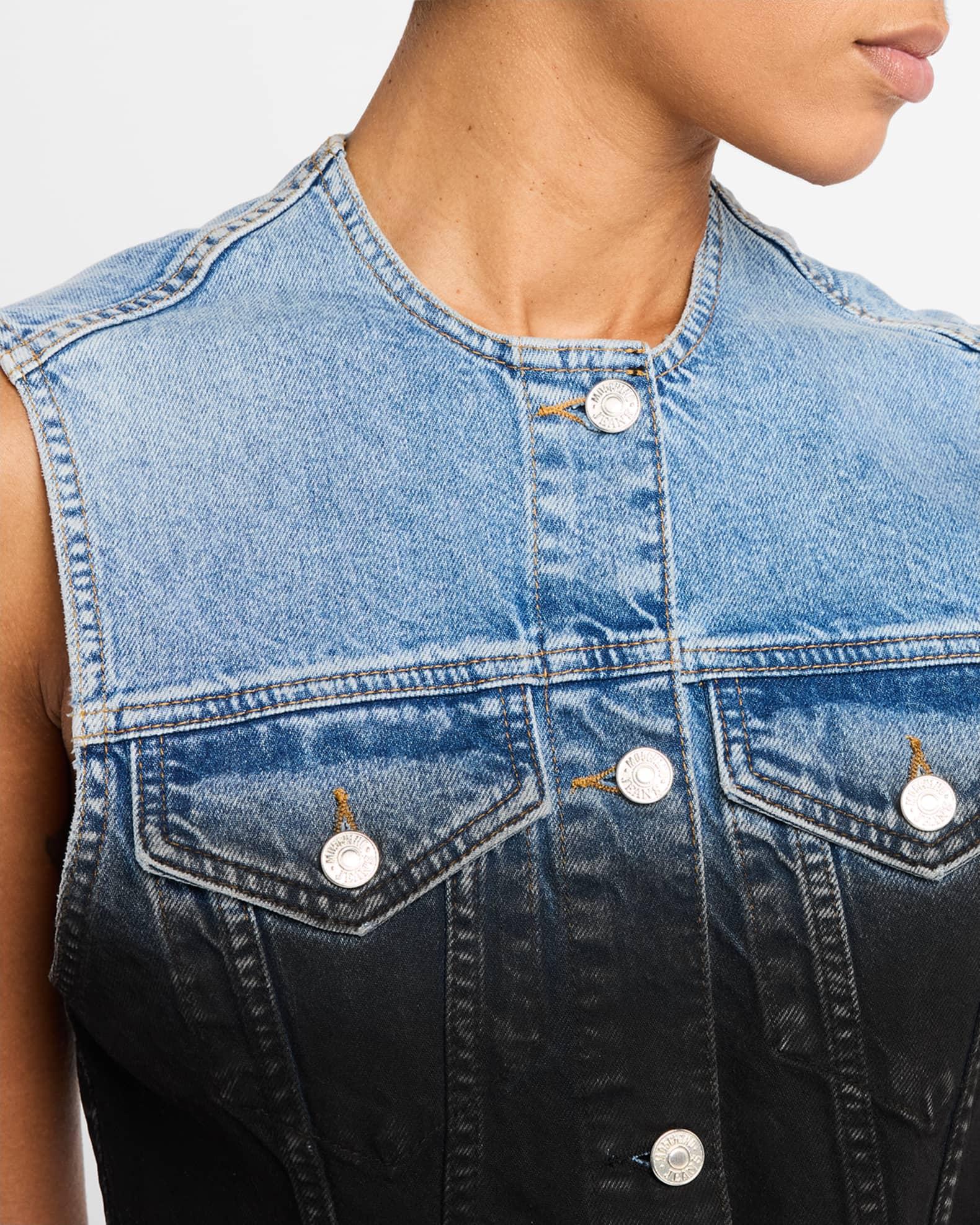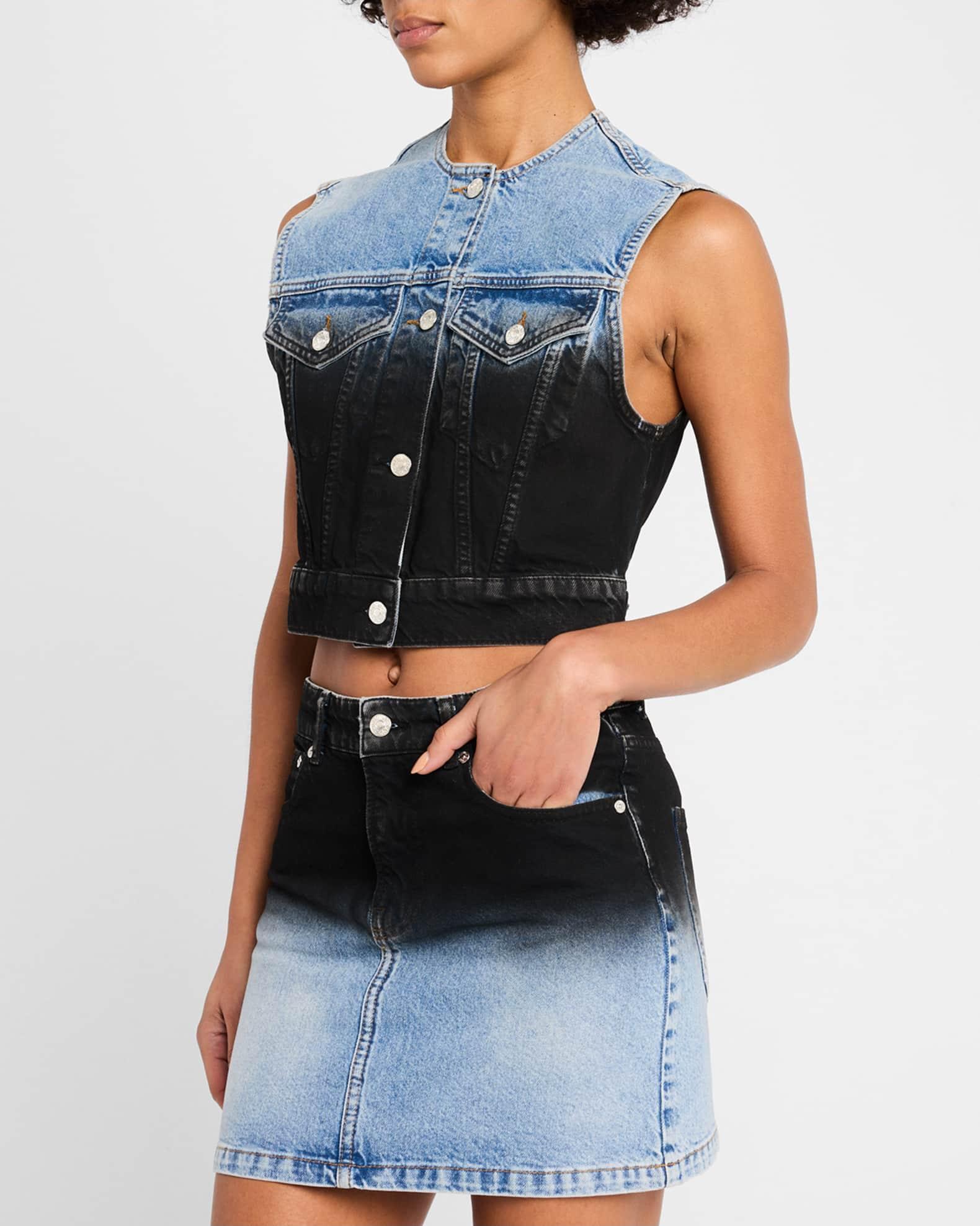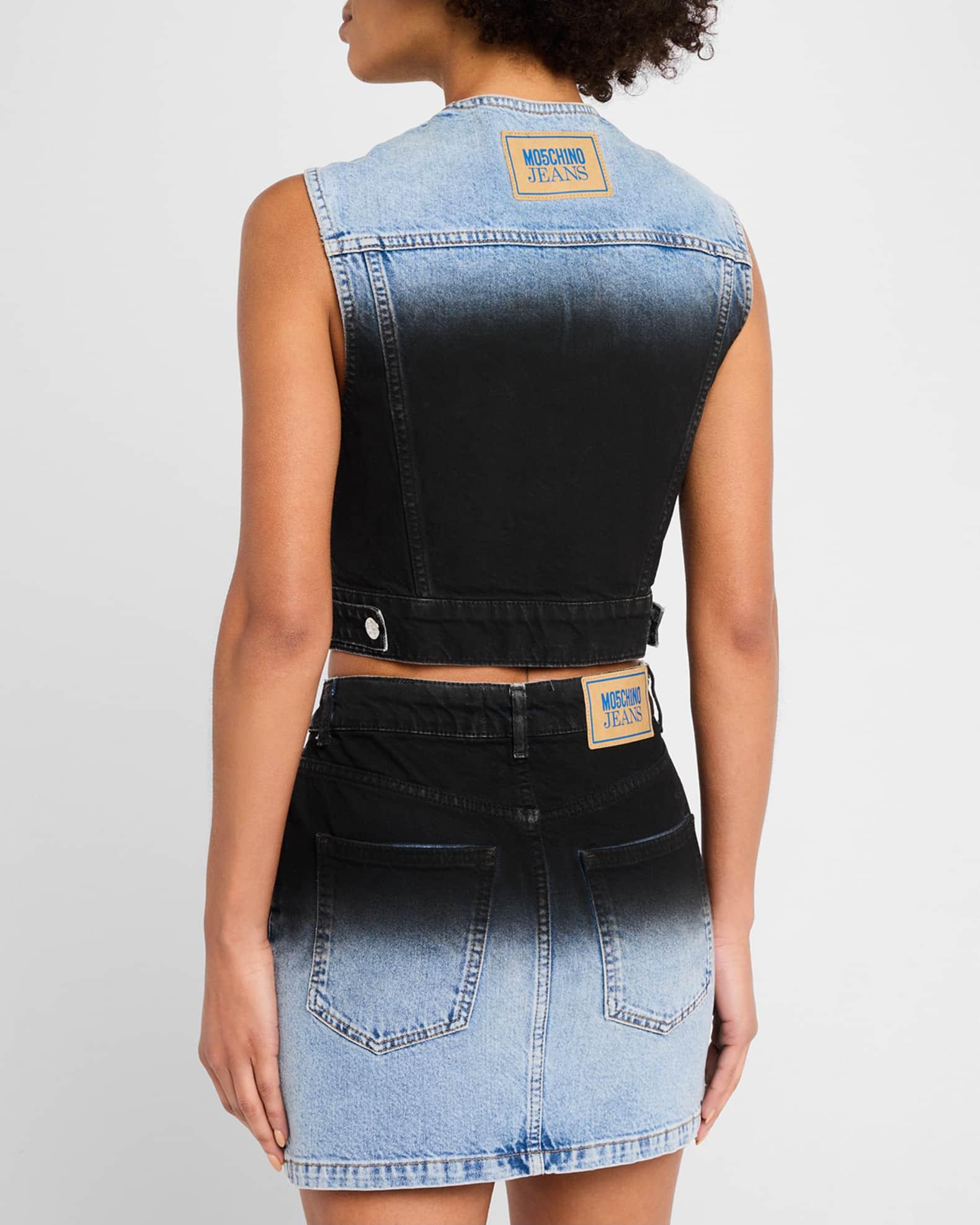 Moschino Jeans vest in ombré denim Crew neckline Sleeveless Dual chest pockets Cropped fit Hem sits at the hip Button-front Cotton Dry clean Imported