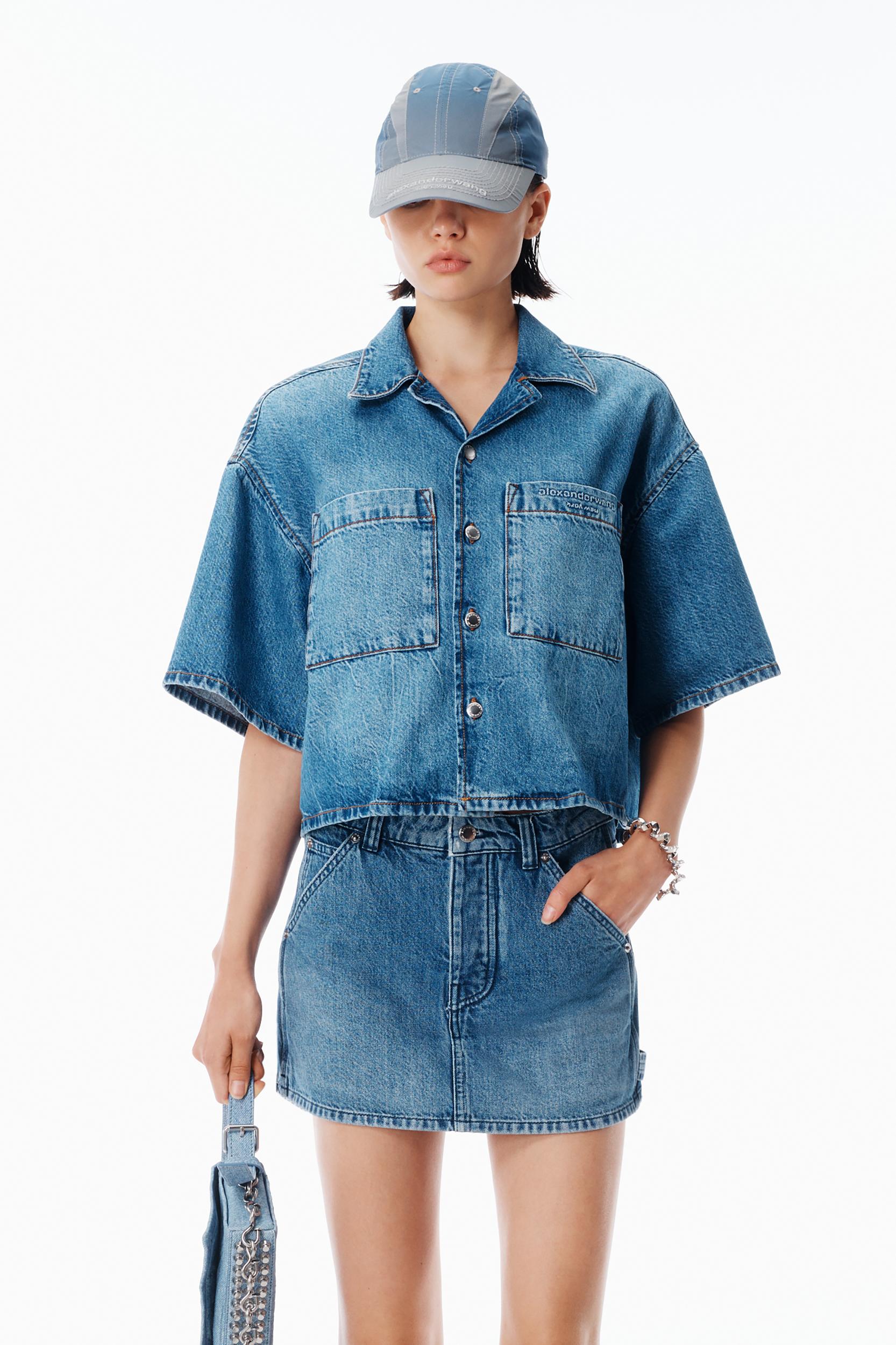 Vintage marbled blue lightweight denim mini skort in a high-rise fitted cut. Carpenter-inspired hammer loop and tool pockets bring utilitarian detail, finished with a hidden button fly and tan logo patch at the back.