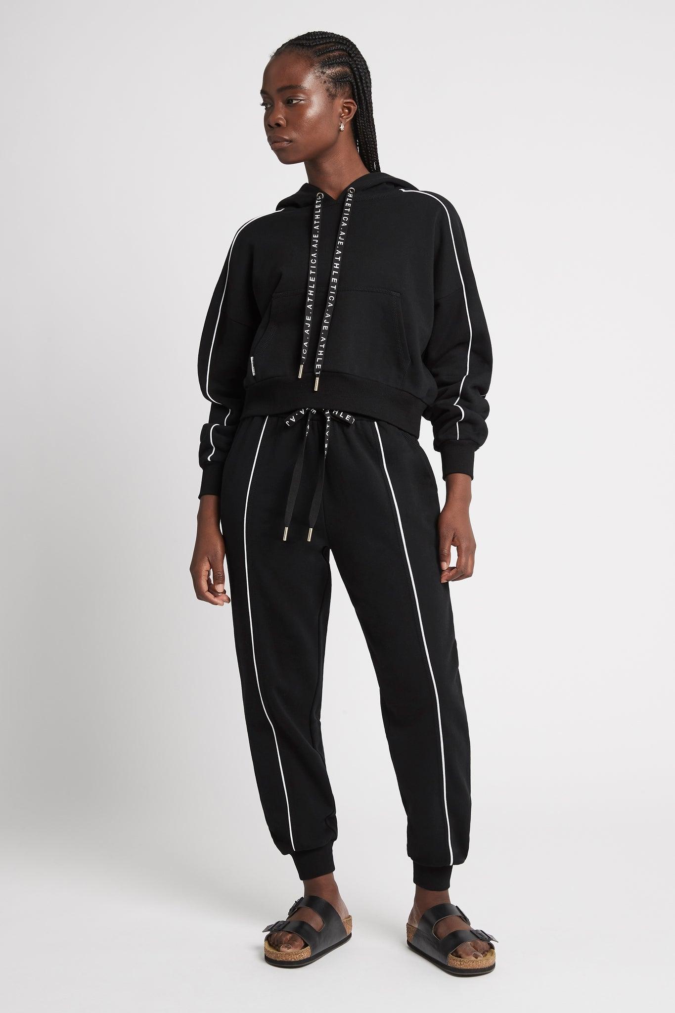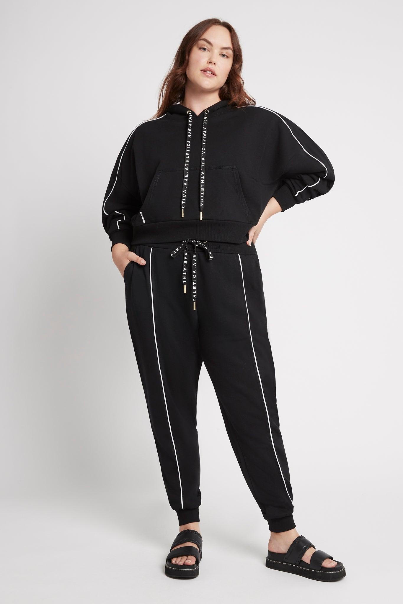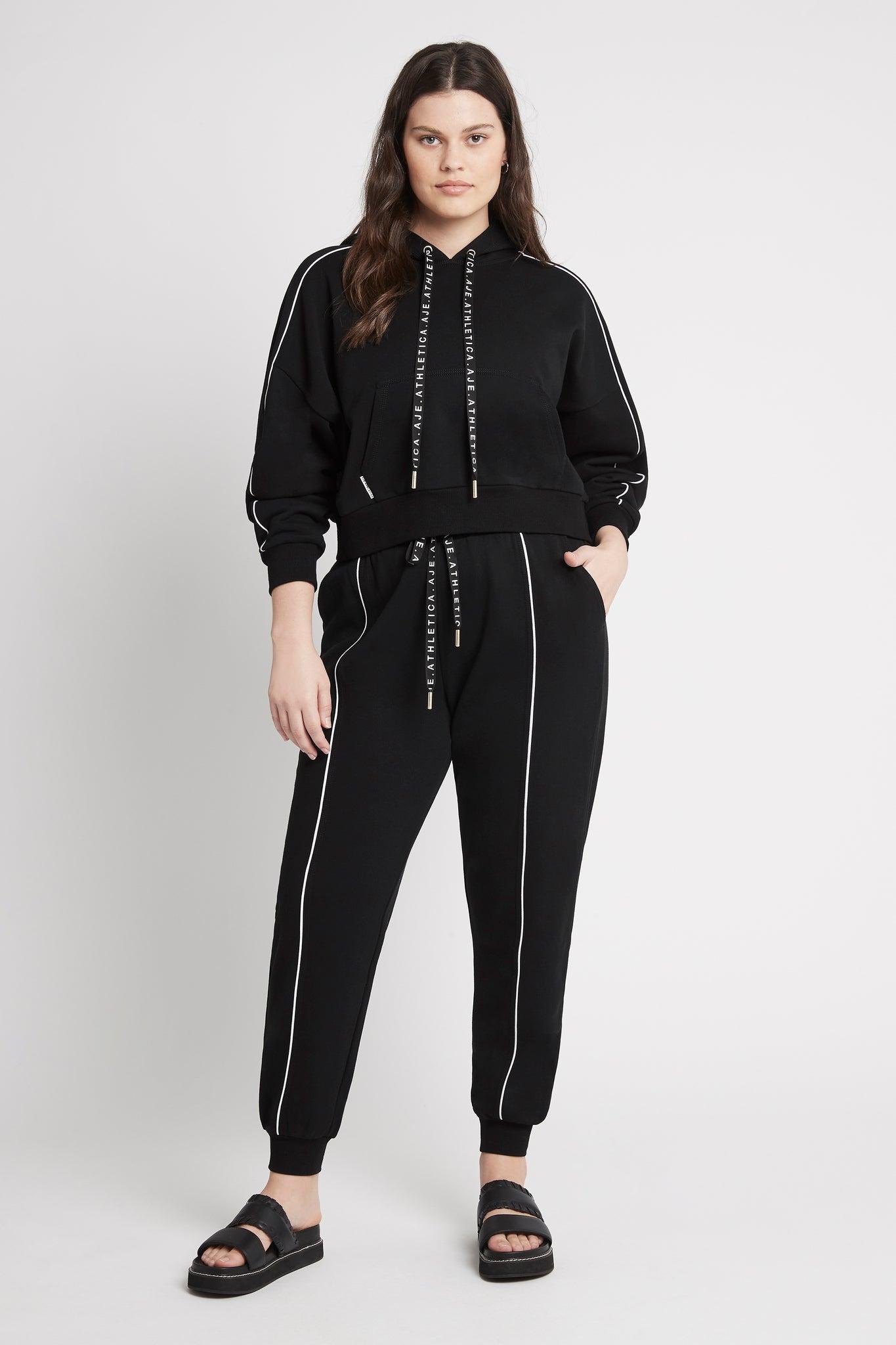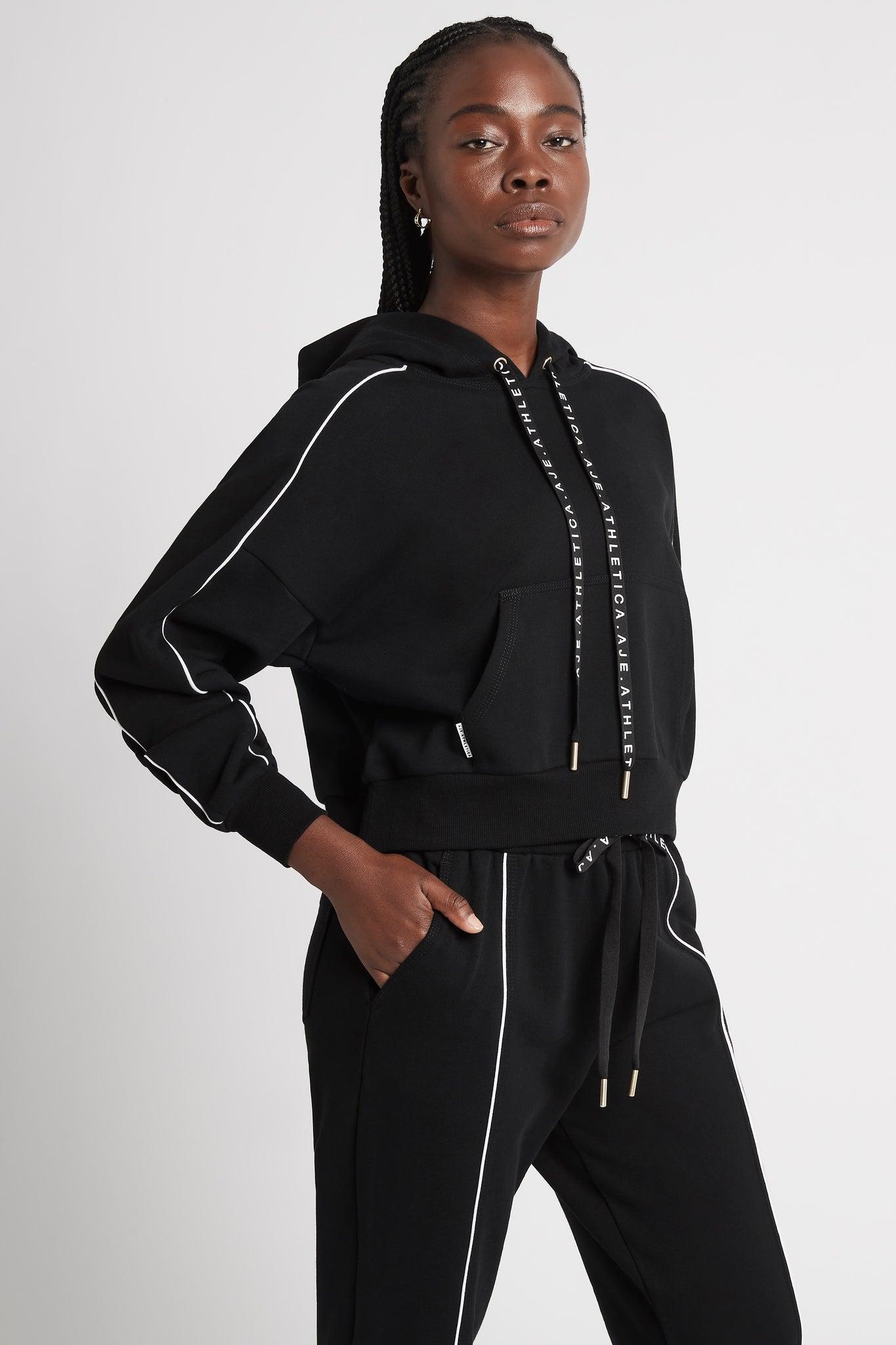 PRODUCT DETAILS Cropped hoodie Adjustable hood with draw cord Flat print draw cord with metal cyclinder cord ends Heavy ribbed cuff and hem Kangaroo pocket Contrast jersey piping throughout sleeves Relaxed fit SIZE AND FIT Cynthia wears a size 8/S and is 178cm in height Jasmine wears a size 12/L and is 175cm in height Sophia wears a size 16/XXL and is 174cm in height FABRICATION 100% Cotton Delicate Cold Hand or Machine Wash